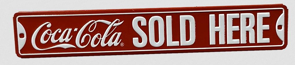 Bring timeless Coca-Cola style into your space with this Coca-Cola “Sold Here” tin sign, featuring the iconic red script logo and bold SOLD HERE lettering inspired by classic soda fountain and corner-store advertising.