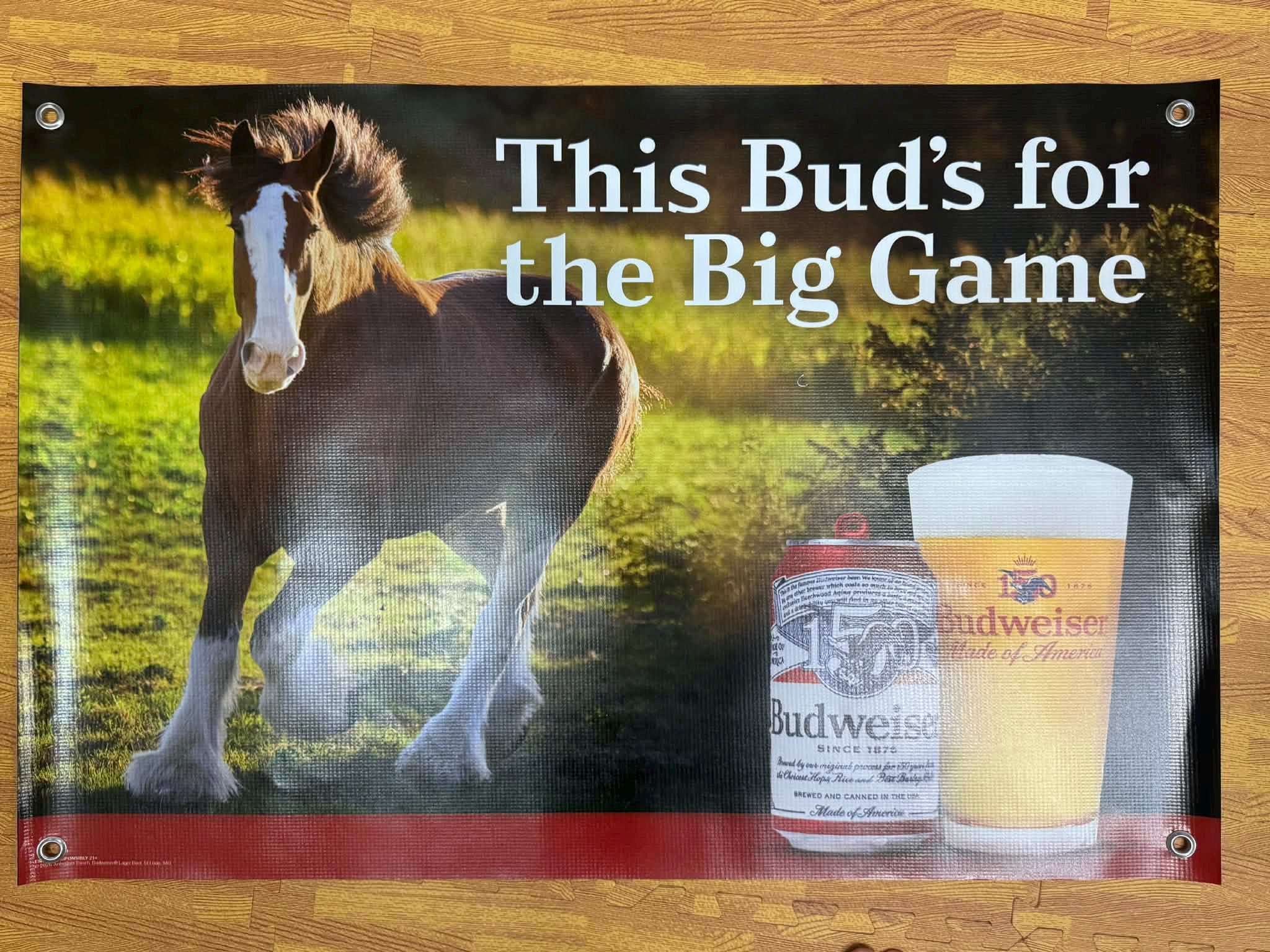 This large 24" x 36" heavy-duty vinyl banner delivers classic Budweiser branding and Super Bowl–style energy that’s perfect for sports rooms, garages, home bars, man caves, or tailgate setups.