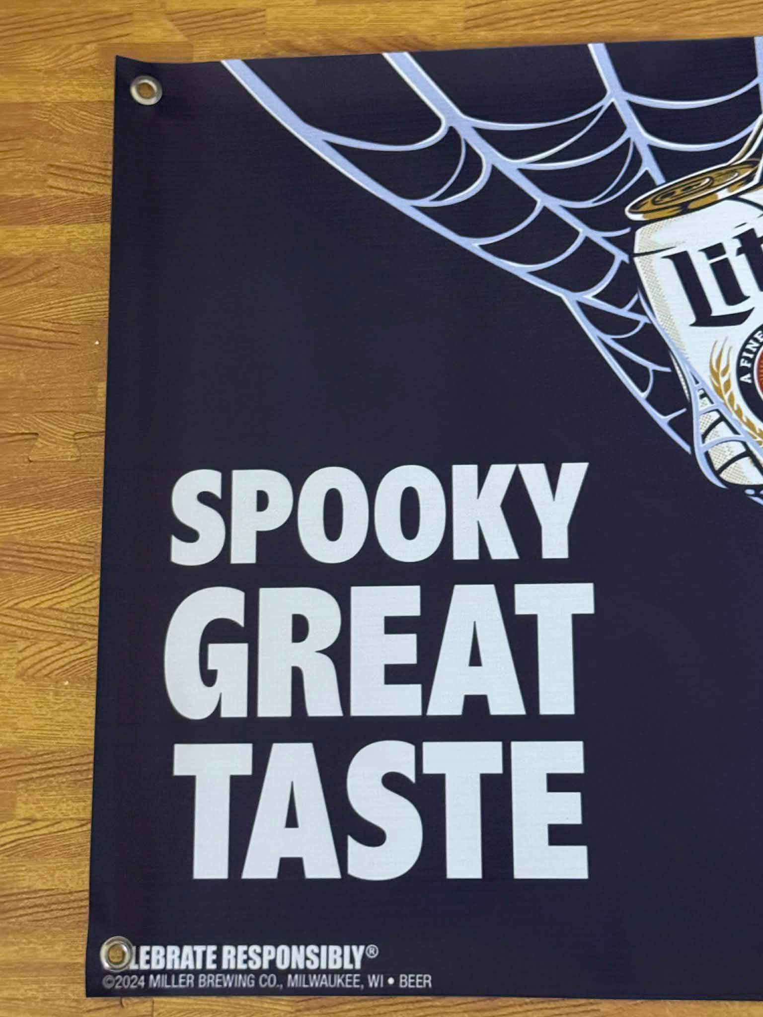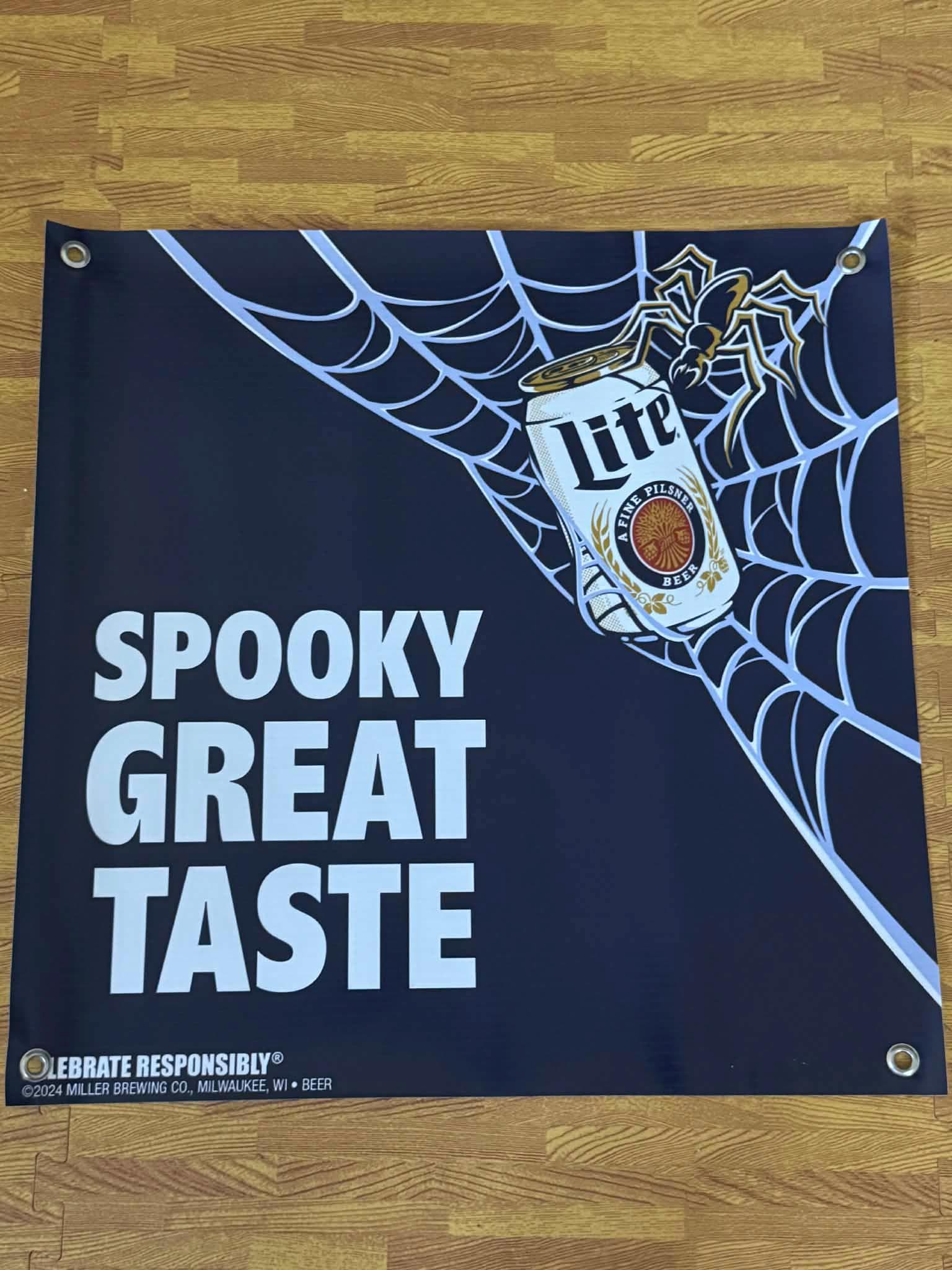 Get your bar ready for spooky season with this Miller Lite “Spooky Great Taste” banner, featuring a bold Halloween-themed design with a spider web, spider, and classic Miller Lite can.