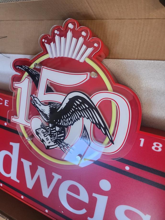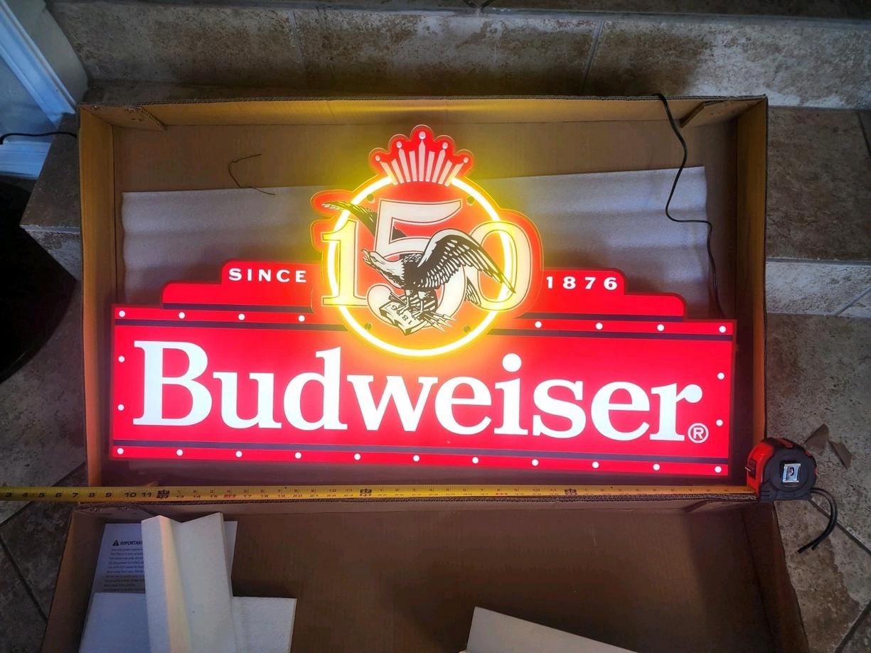 Celebrate American brewing history with this large Budweiser 150 illuminated LED sign, featuring the iconic Since 1876 eagle crest and bold red Budweiser branding. This is a high-impact, lighted bar sign that instantly becomes the focal point of any mancave, garage bar, basement, or game room.