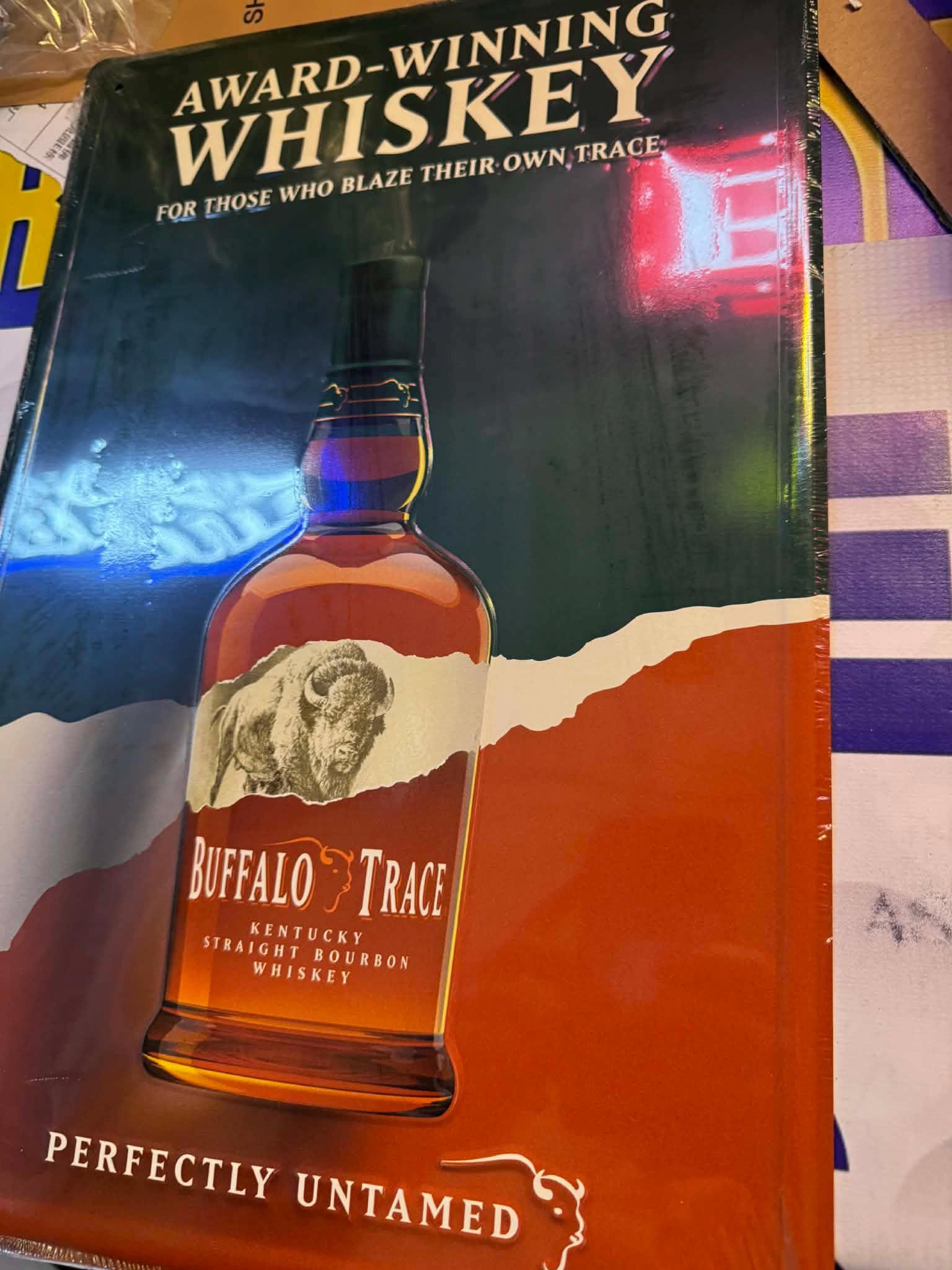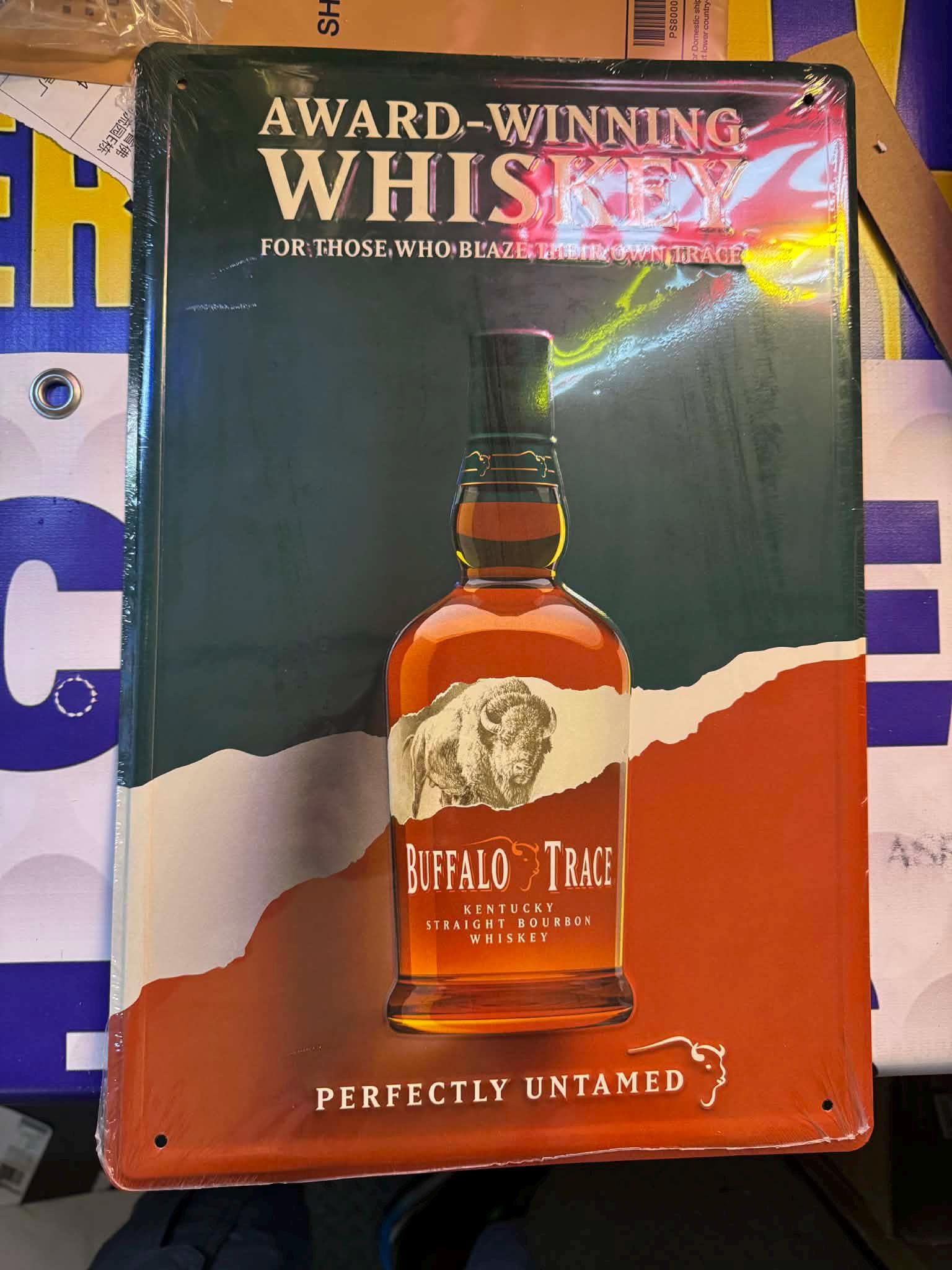 Bring bold bourbon vibes to your bar, garage, or man cave with this Buffalo Trace Bourbon tin sign. Featuring the iconic bottle artwork and the slogan “Award-Winning Whiskey – Perfectly Untamed,” this piece delivers classic Kentucky whiskey heritage with vintage bar appeal.