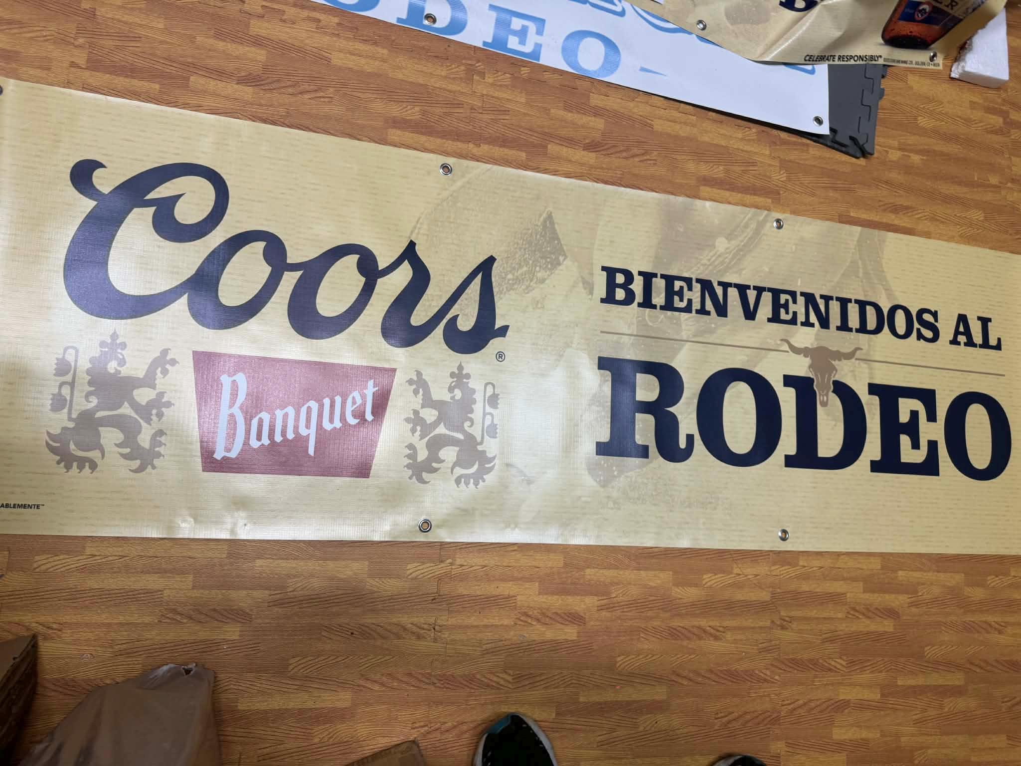 Make a bold statement in your bar, mancave, garage, or rodeo setup with this large Coors Banquet Welcome Rodeo Fans banner. Featuring classic Coors Banquet branding and western rodeo styling, this piece delivers authentic vintage beer-advertising vibes that look right at home in any rustic or western-themed space.