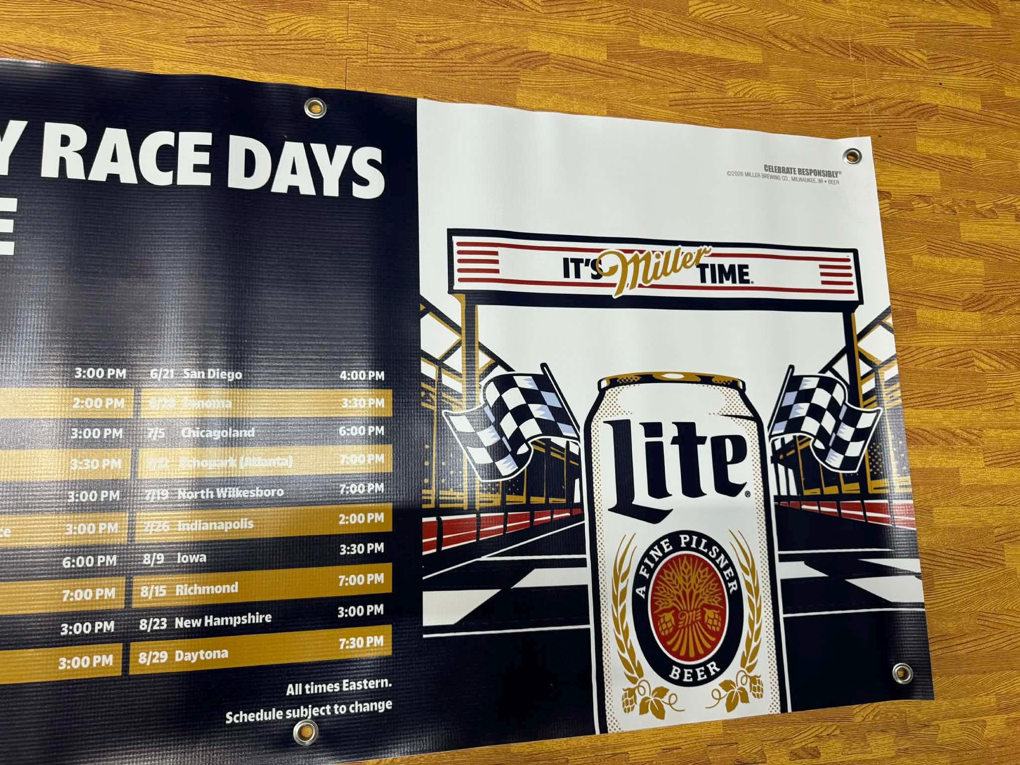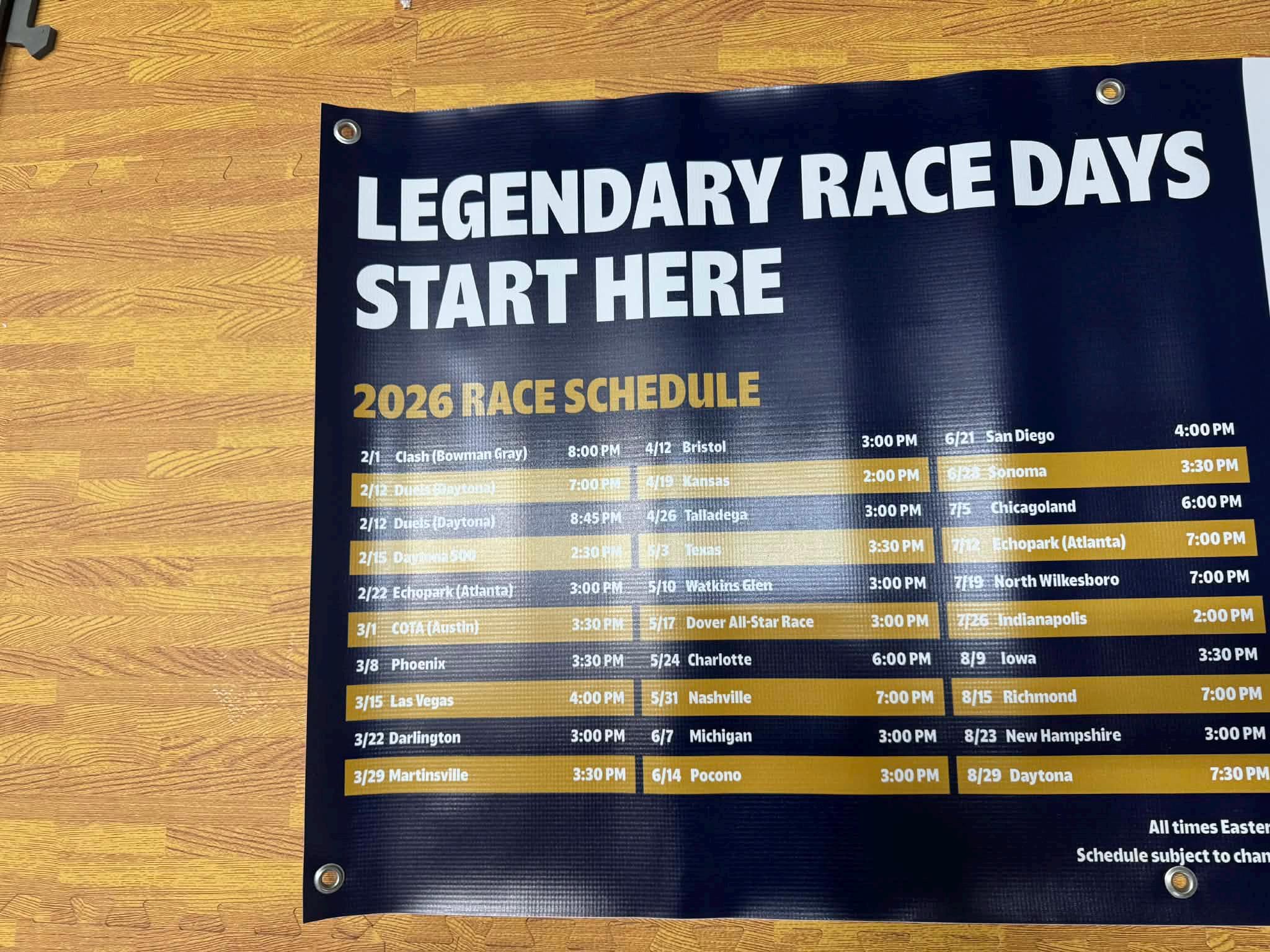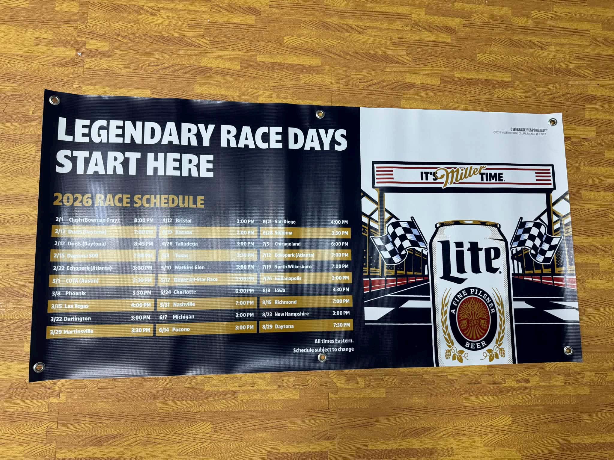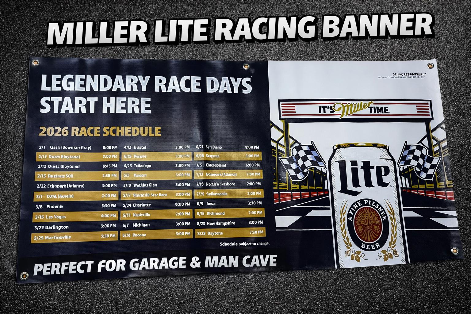 Turn your garage, man cave, or bar into race headquarters with this Legendary Race Days racing banner. Featuring bold motorsports artwork and a full 2026 race schedule, this 24x48 vinyl banner delivers serious race-day energy and authentic trackside style.