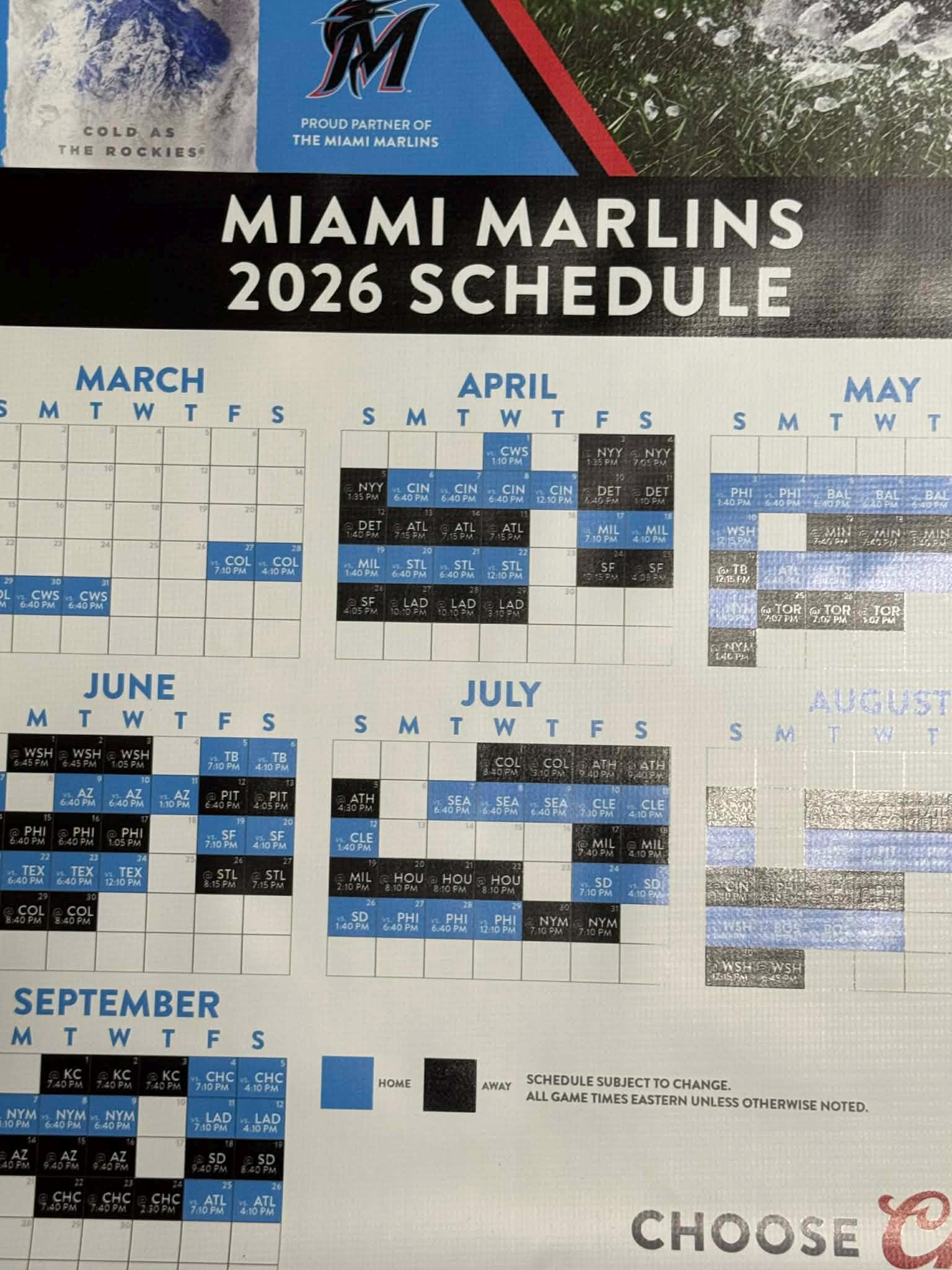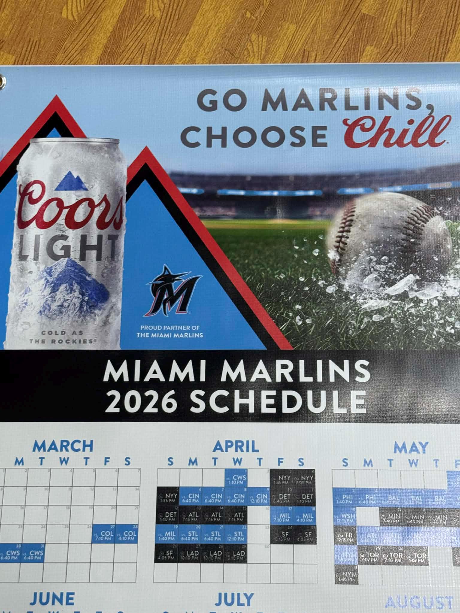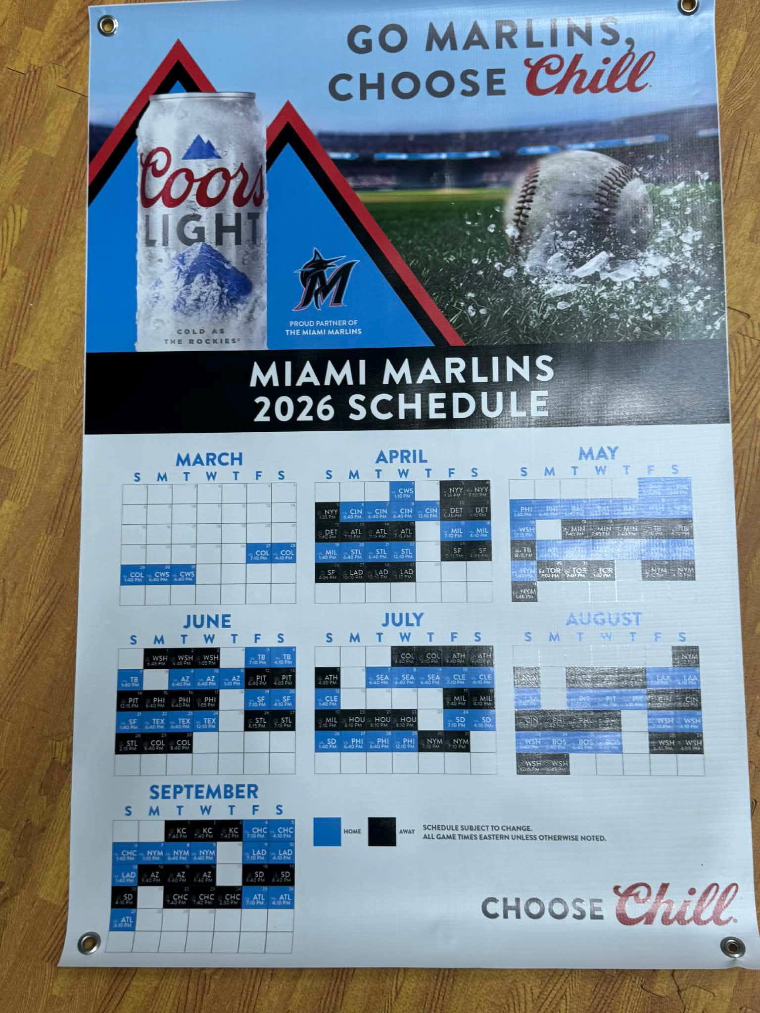 Show your team pride in bold style with this Coors Light Miami Marlins 2026 Schedule banner. Featuring vibrant stadium artwork, official-style schedule layout, and classic Coors Light branding, this 24” x 36” wall banner is perfect for baseball fans who want to track every game in style.