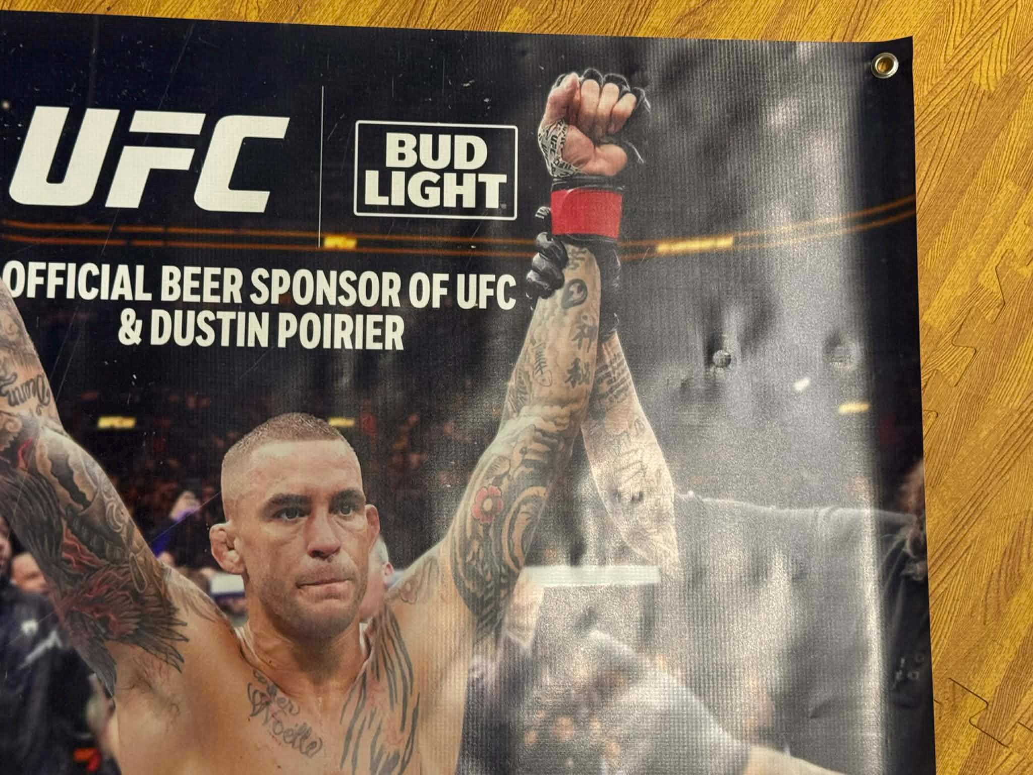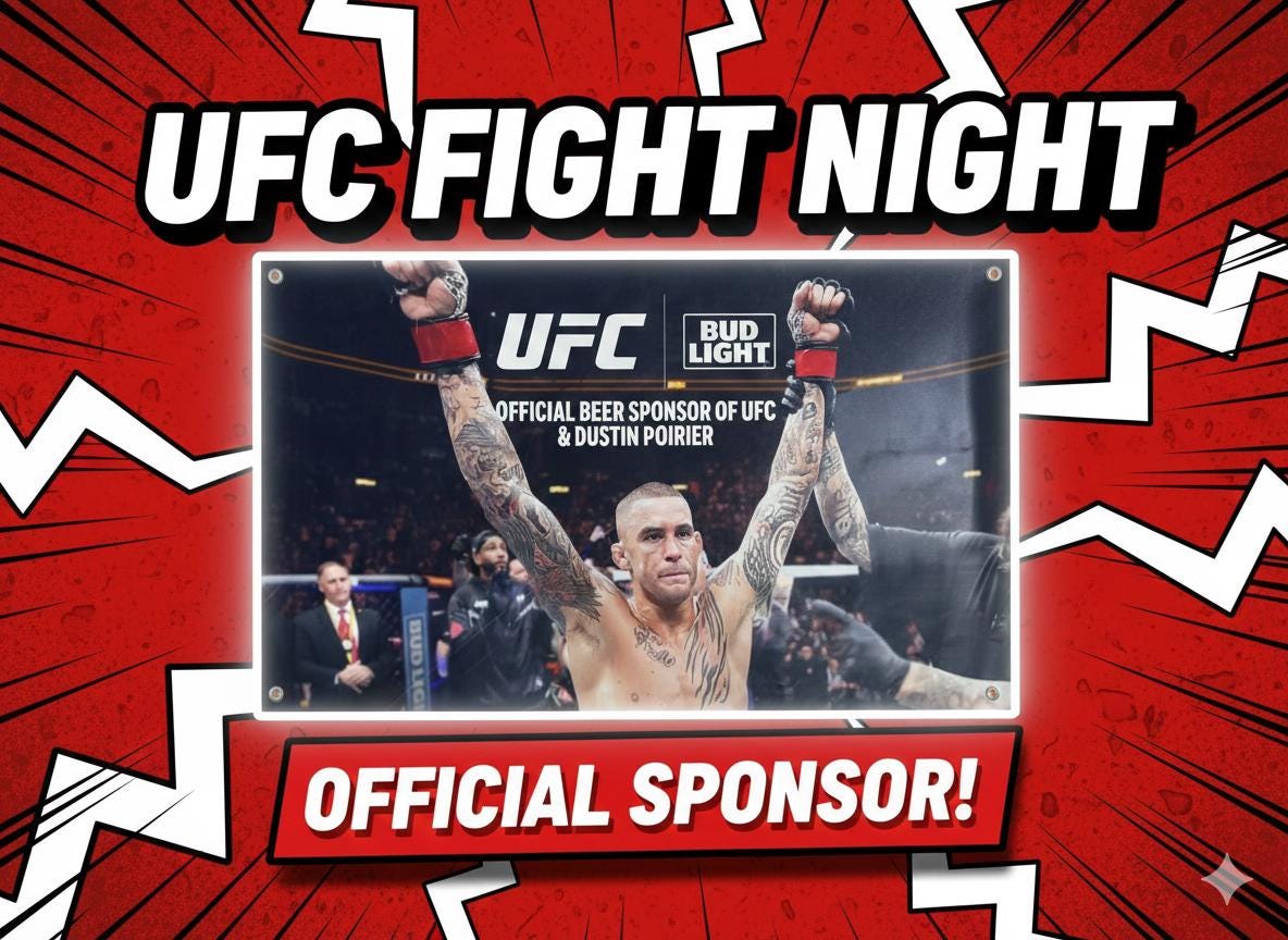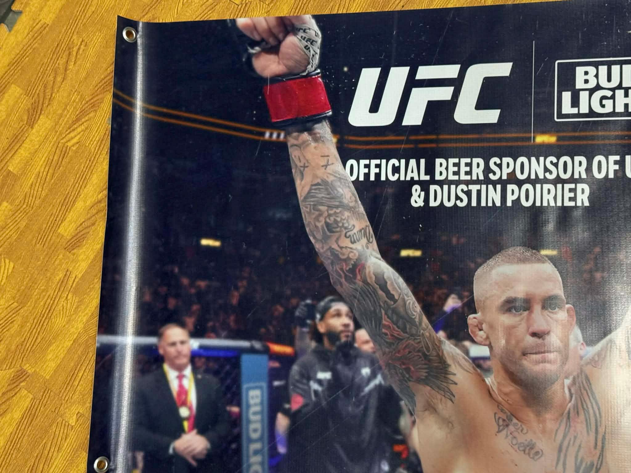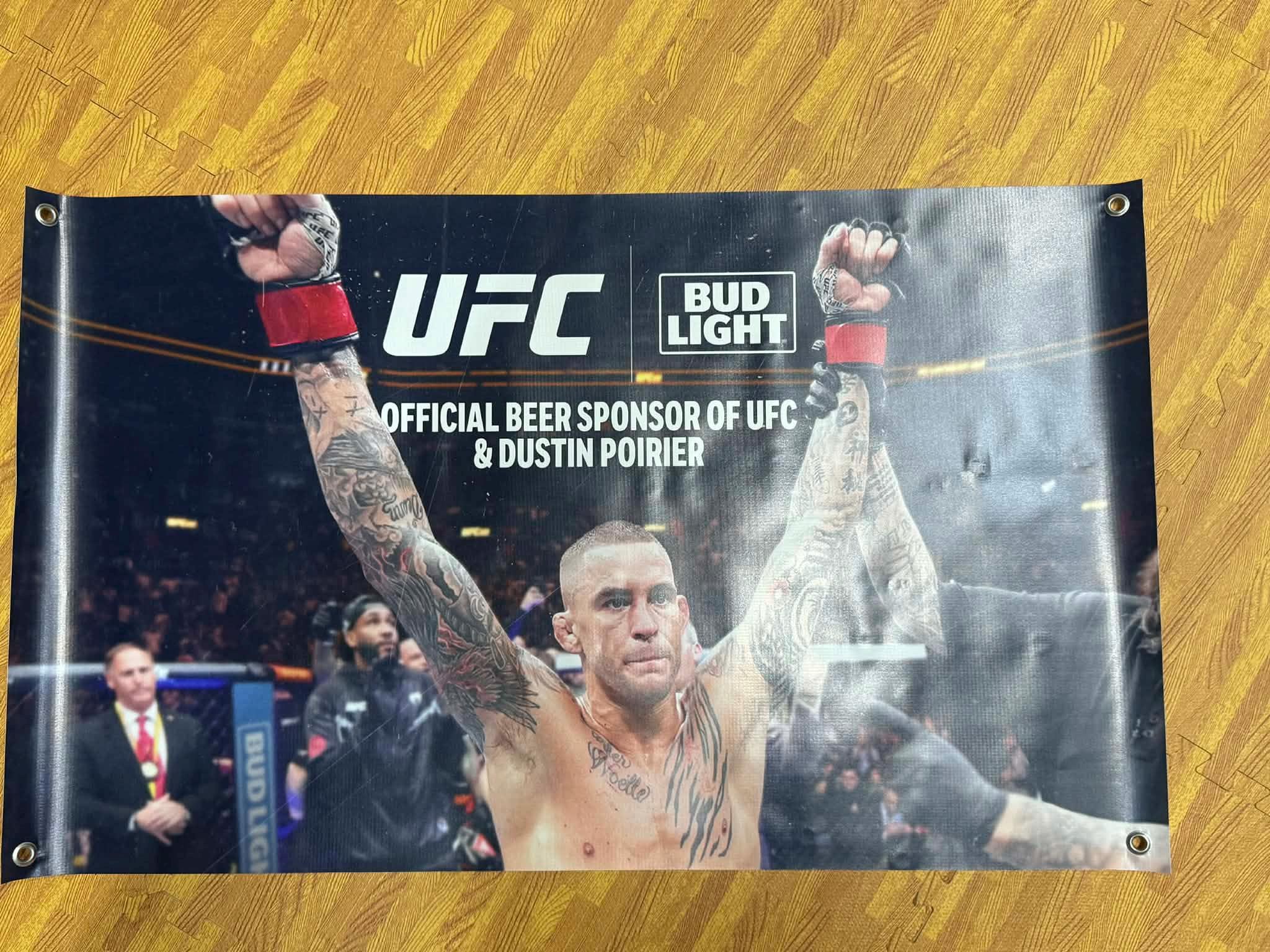 Bring fight night energy to your wall with this bold UFC x Bud Light Dustin Poirier promotional banner. Featuring an action-packed arena scene and official sponsor styling, this large 40” x 24” banner is perfect for man caves, sports bars, garages, game rooms, and MMA fan setups.