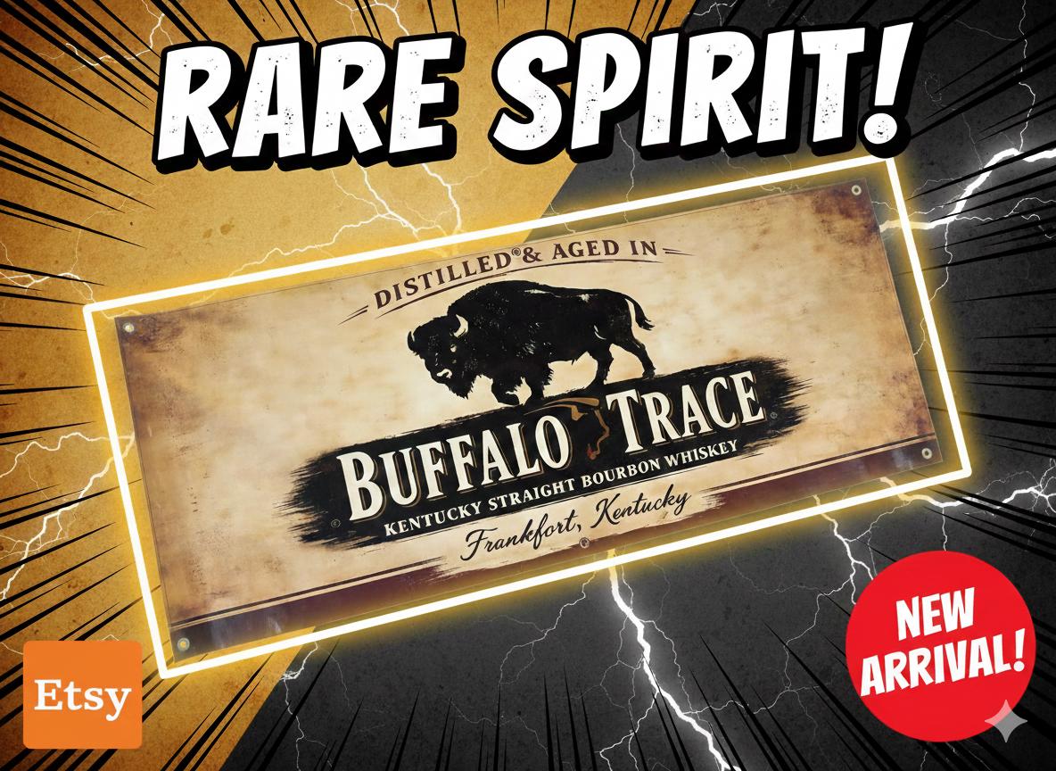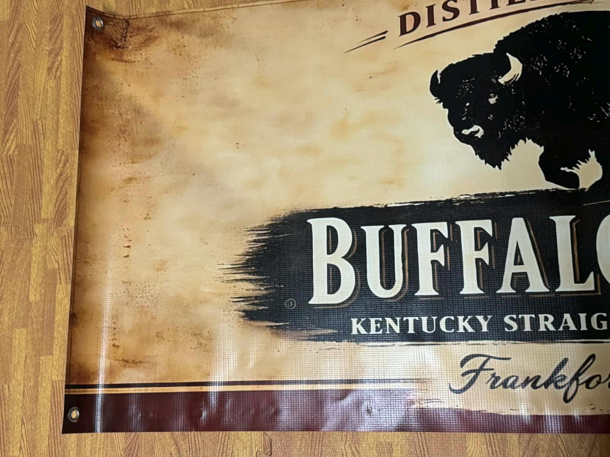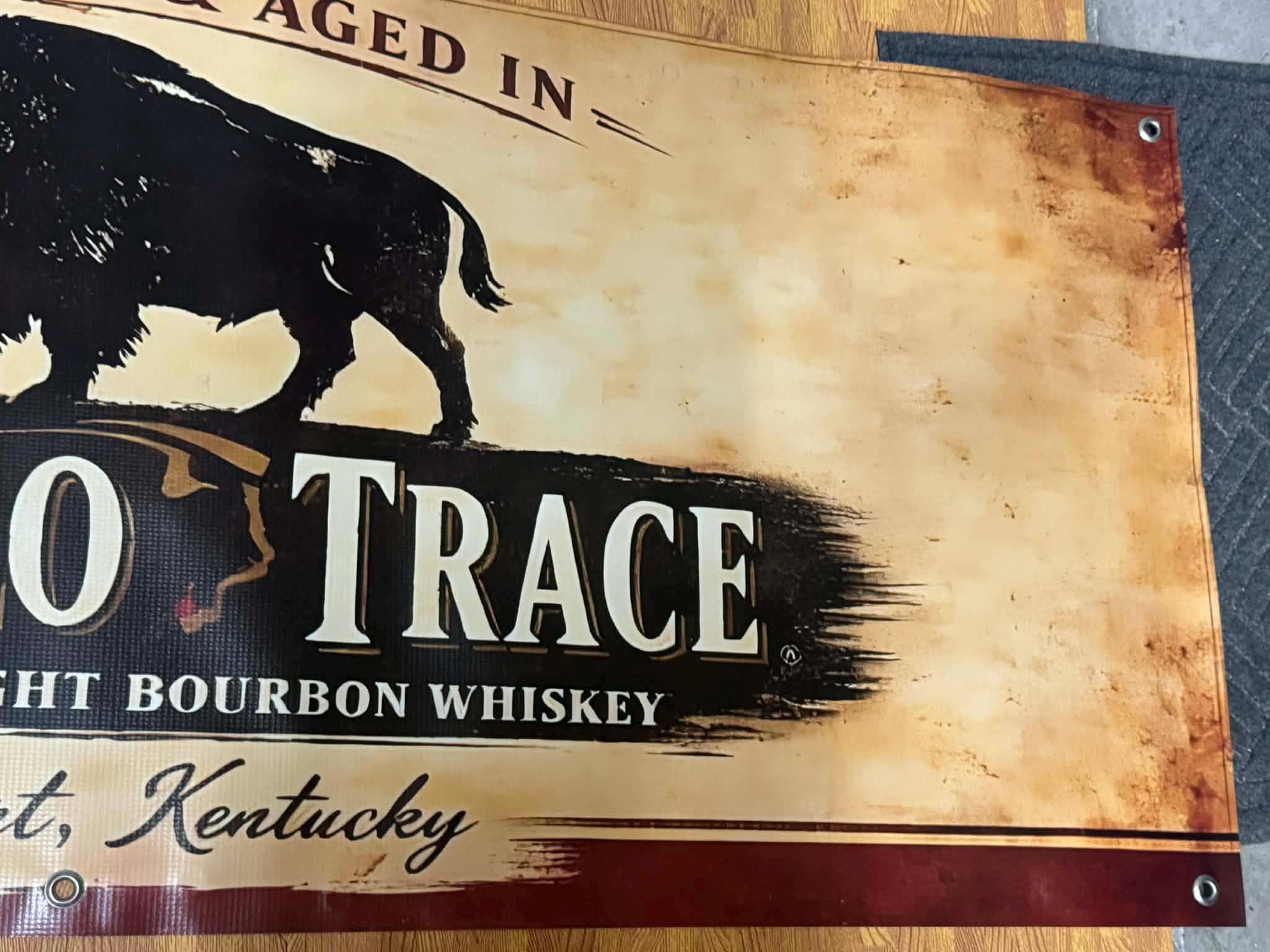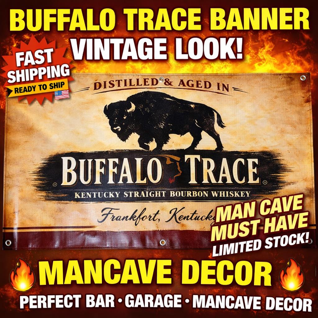 Add a bold statement piece to your bar or mancavedecor with this large Buffalo Trace Distilled & Aged in Kentucky Banner featuring the iconic buffalo silhouette and vintage whiskey-style design. The distressed background and classic bourbon branding give it a premium rustic look perfect for whiskey lovers and collectors.
