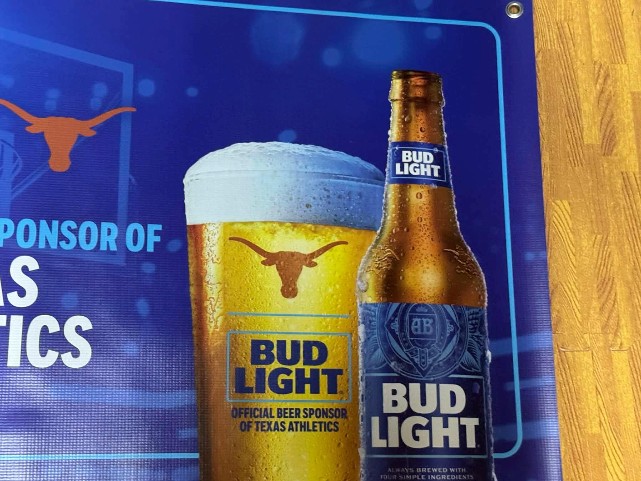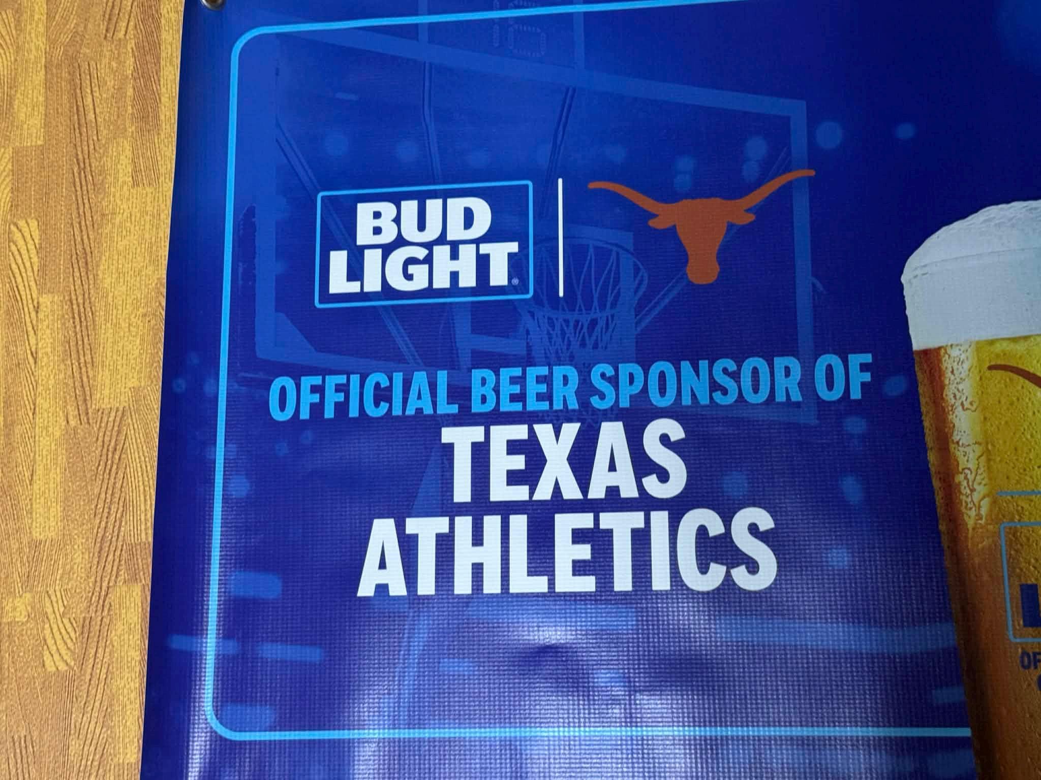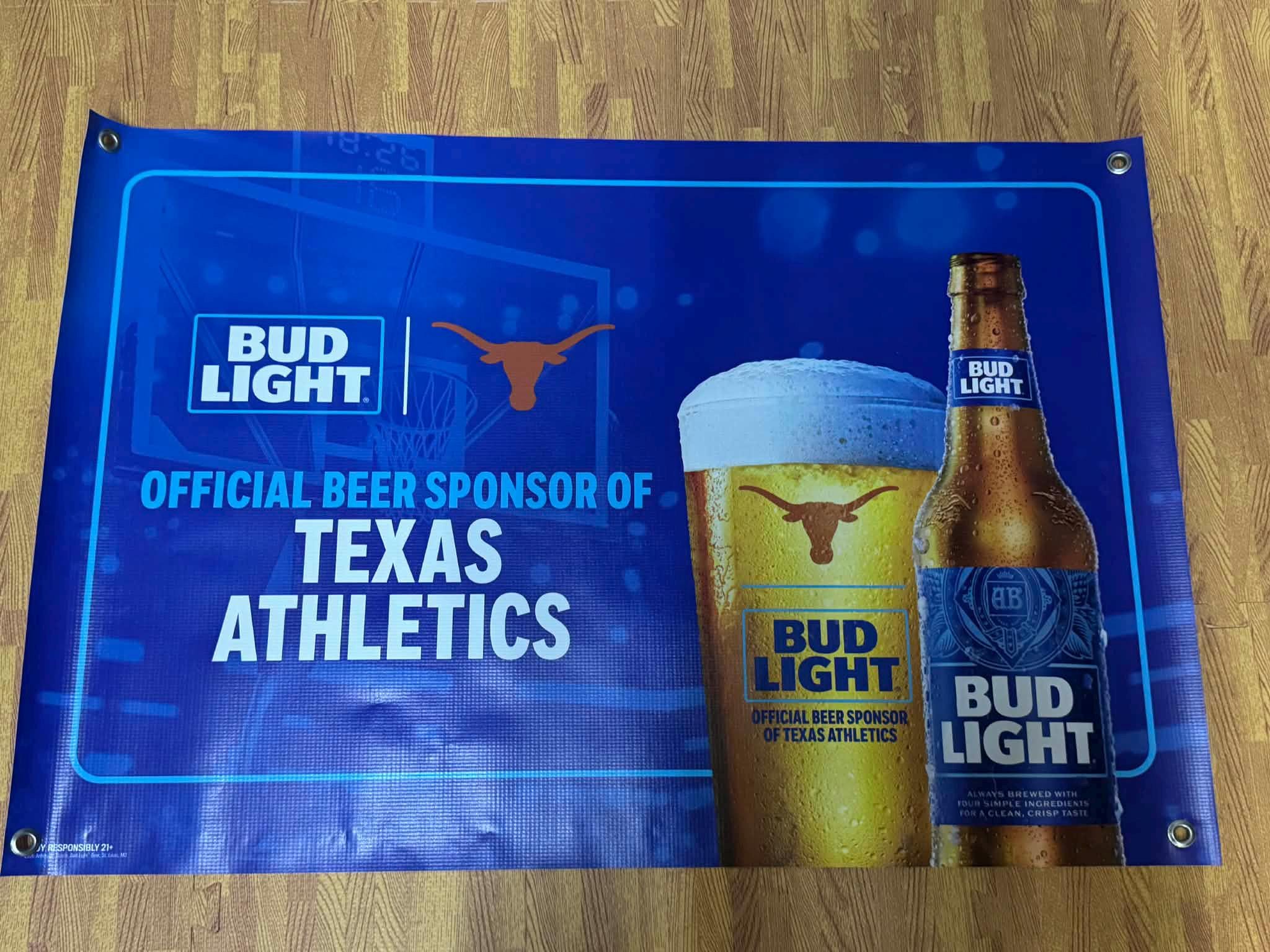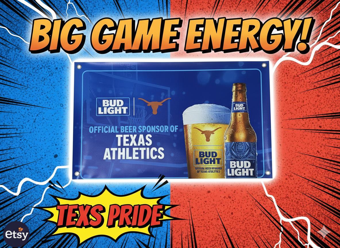 Add a bold sports and beer statement to your space with this Bud Light Texas Athletics Banner featuring the official beer sponsor theme design with Longhorn graphics, Bud Light bottle, and stadium-style background.