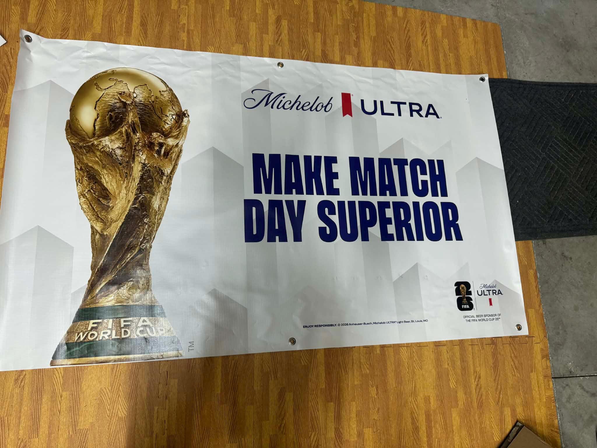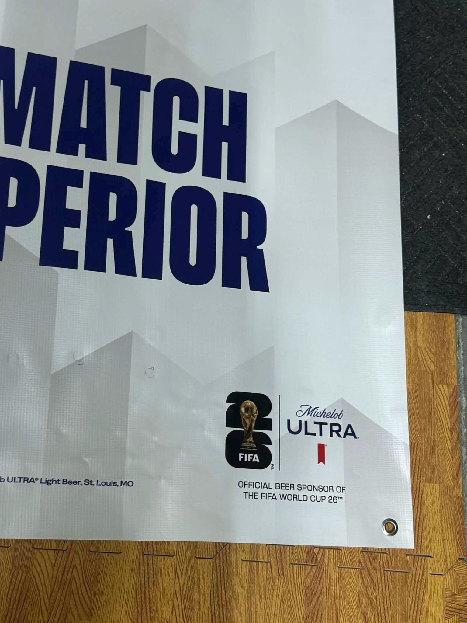 Elevate your sports wall with this large Michelob Ultra Match Day Superior Banner featuring FIFA World Cup trophy artwork and official sponsor style branding. This oversized 60” x 36” banner is a premium statement piece for sports fans, collectors, bars, and mancavedecor setups.
