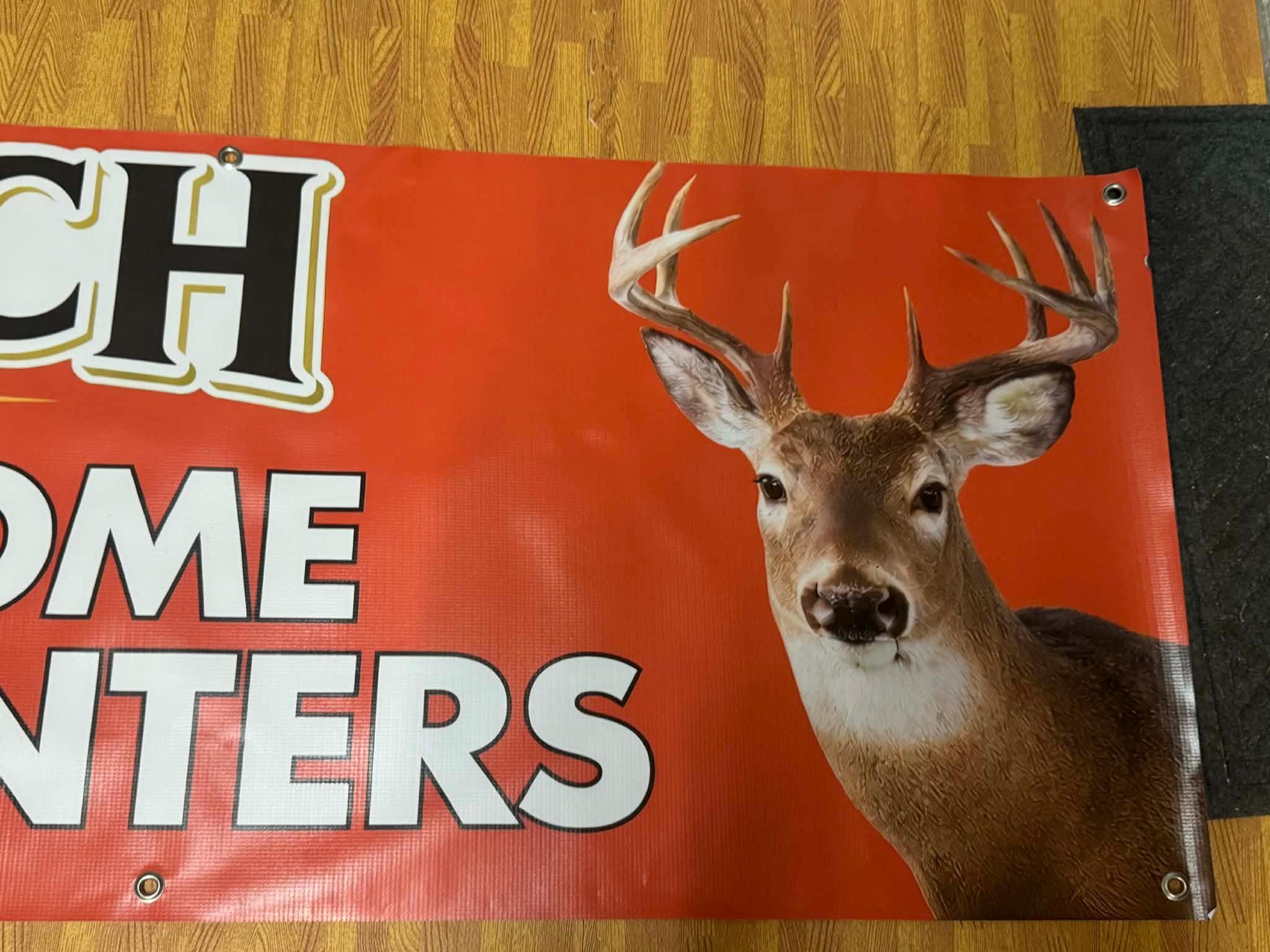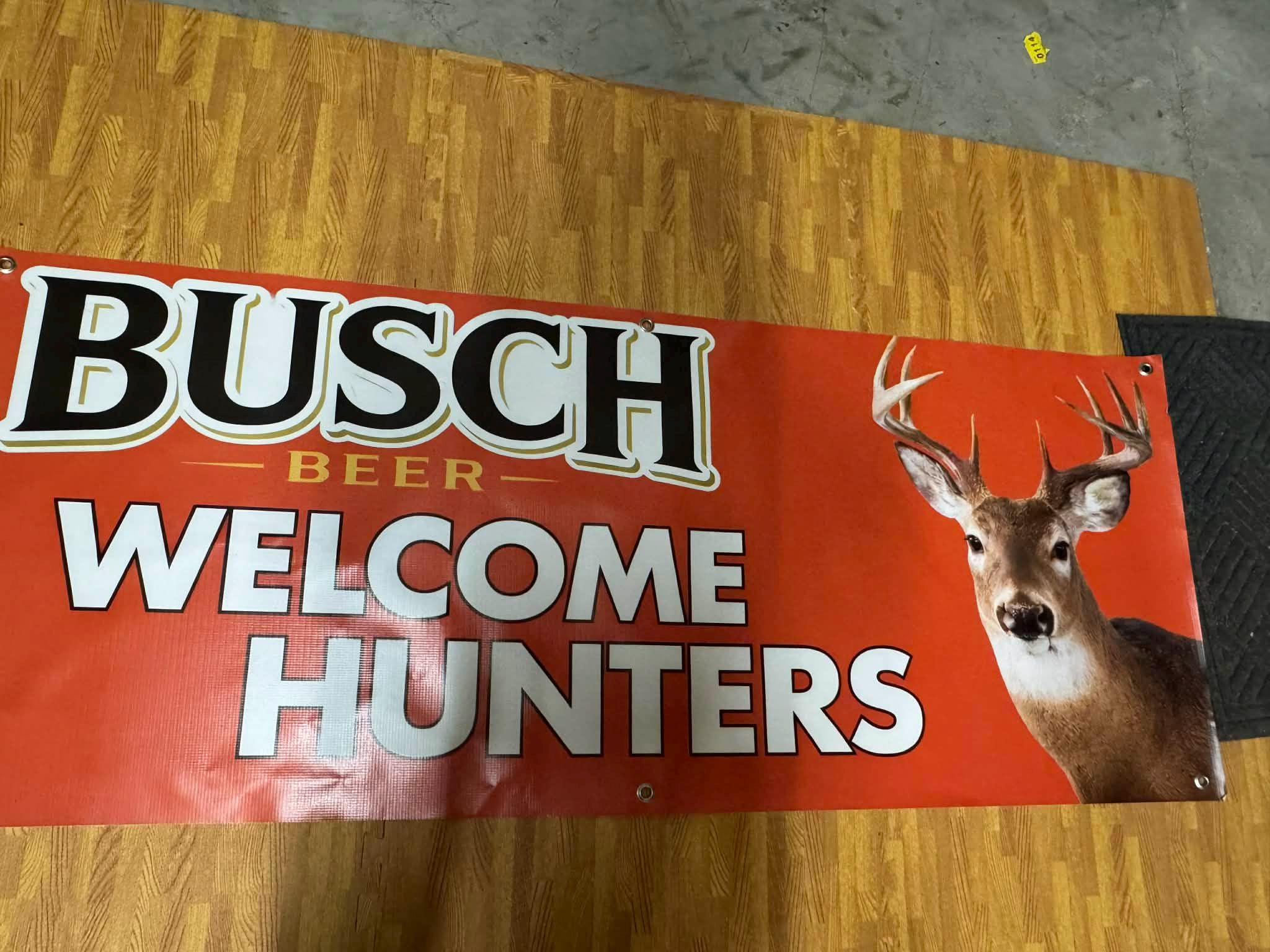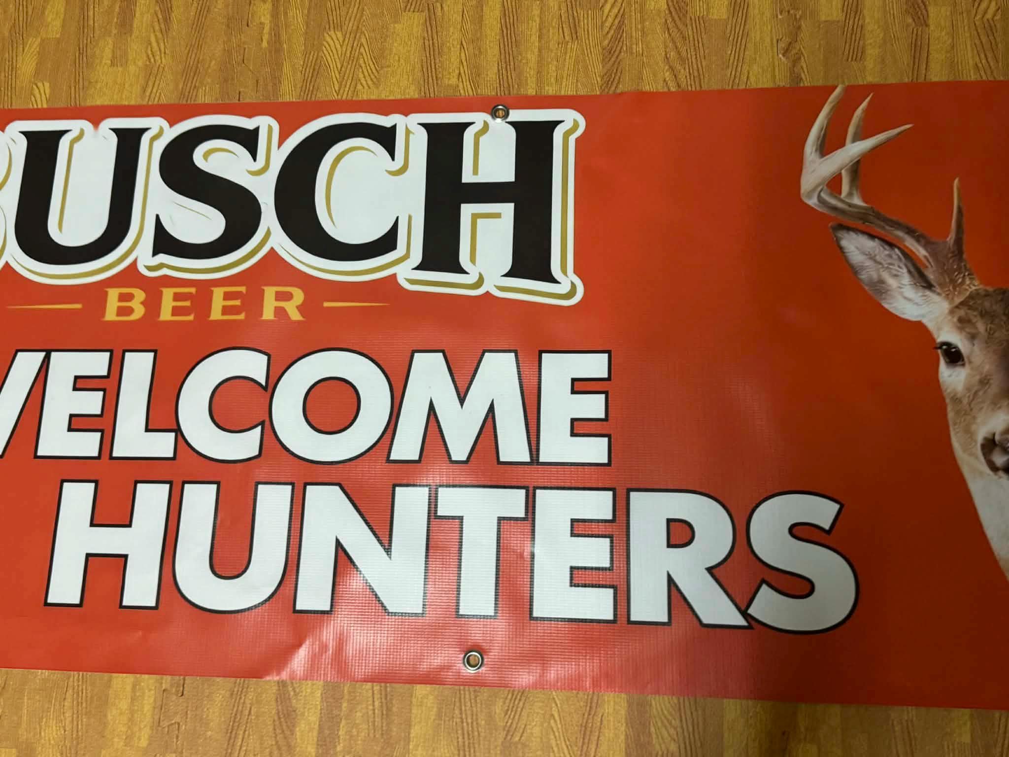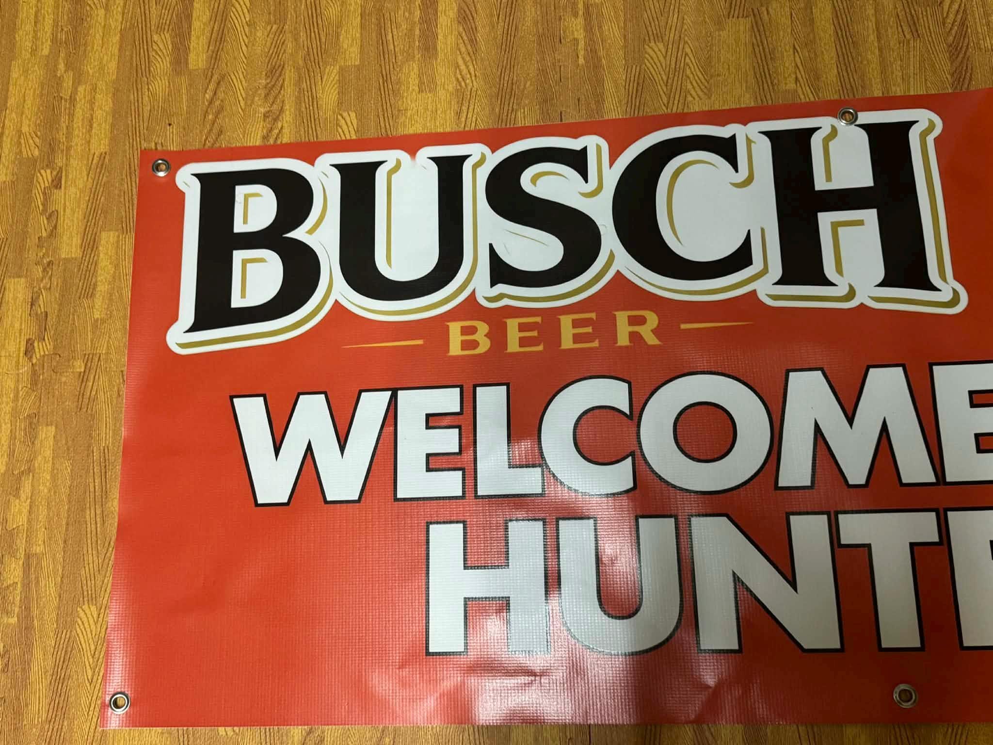 Welcome hunting season in style with this bold Busch Beer Welcome Hunters Banner featuring a vibrant red background, classic Busch branding, and a detailed deer graphic. Measuring 60” x 24”, this large statement piece is perfect for hunting camps, lodges, garages, bars, and mancavedecor walls.