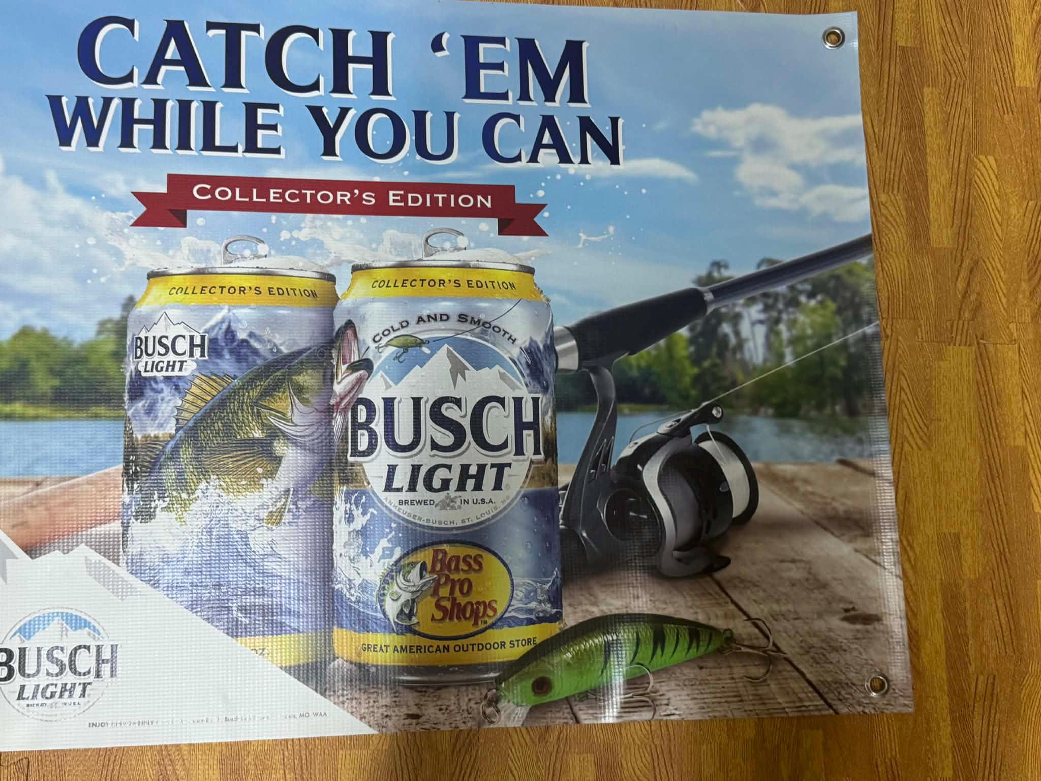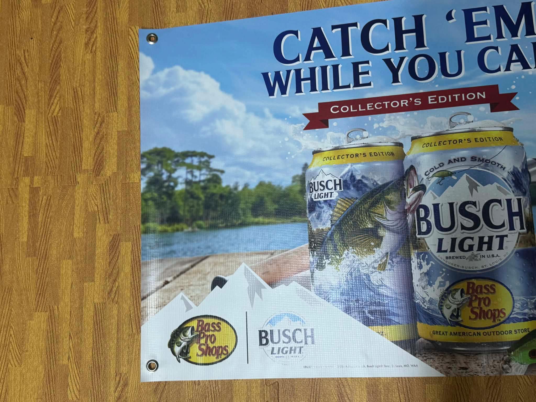 Add a bold outdoors vibe to your space with this official-style Busch Light “Catch ’Em While You Can” Collector’s Edition Vinyl Banner featuring Bass Pro Shops branding, fishing artwork, and classic beer decor styling.