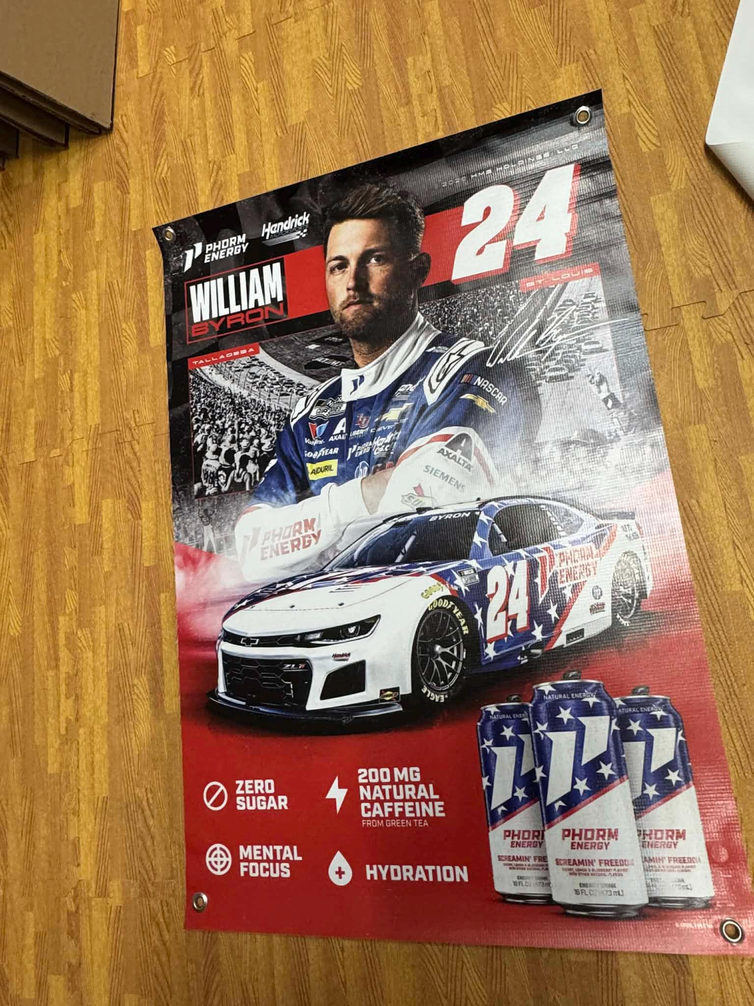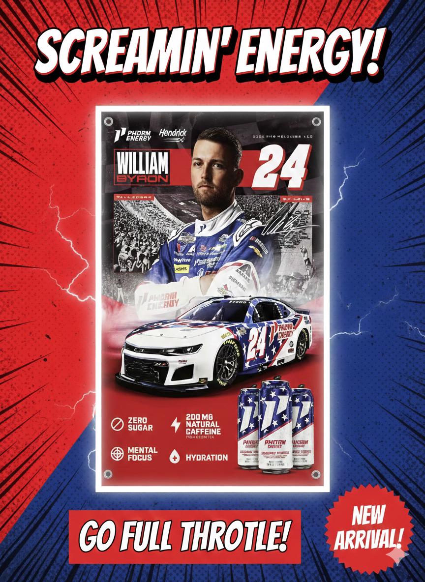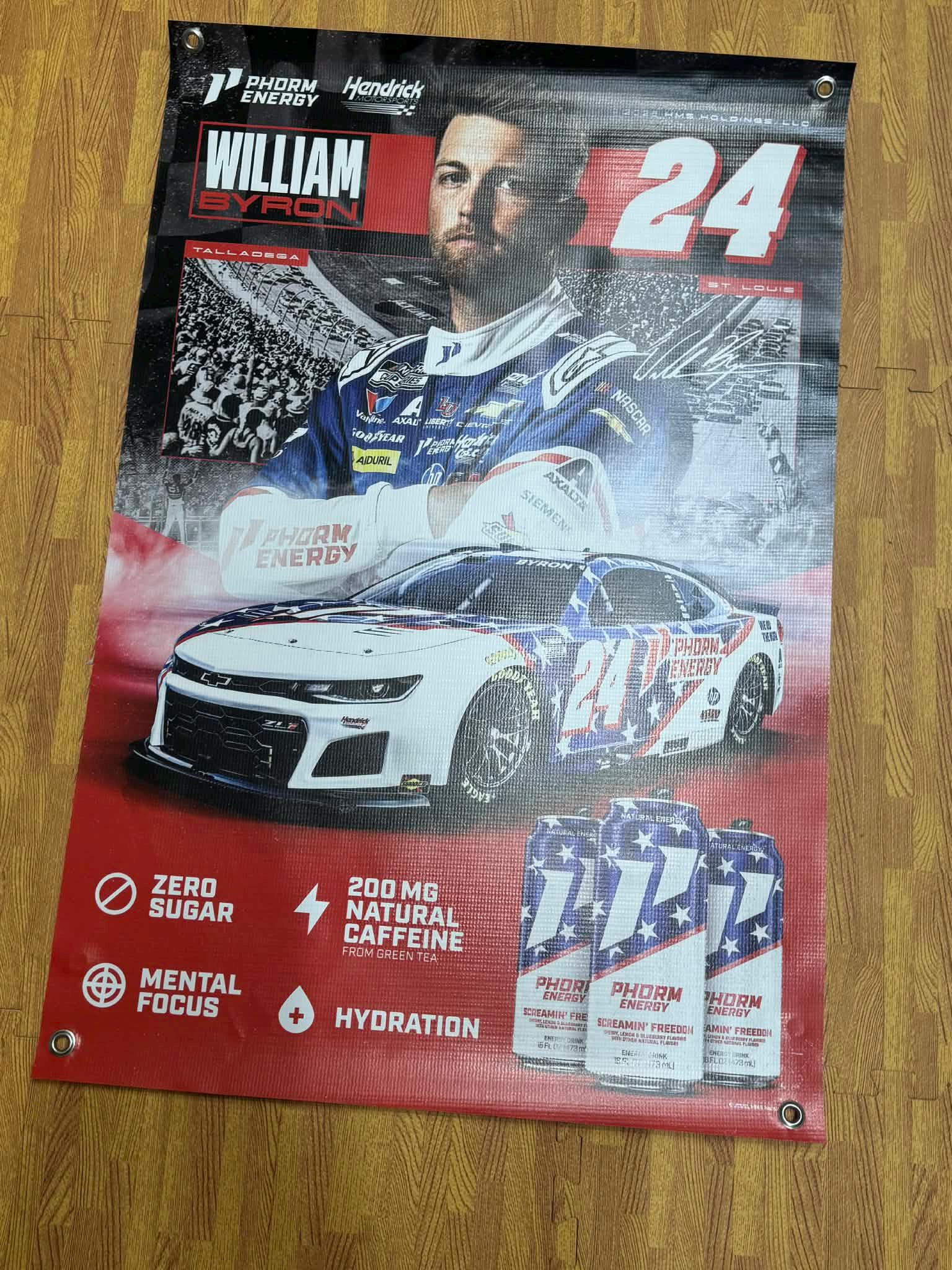 Upgrade your racing space with this bold William Byron #24 NASCAR Vinyl Banner featuring Hendrick Motorsports styling, Phorm Energy branding, and a high-impact racing design.