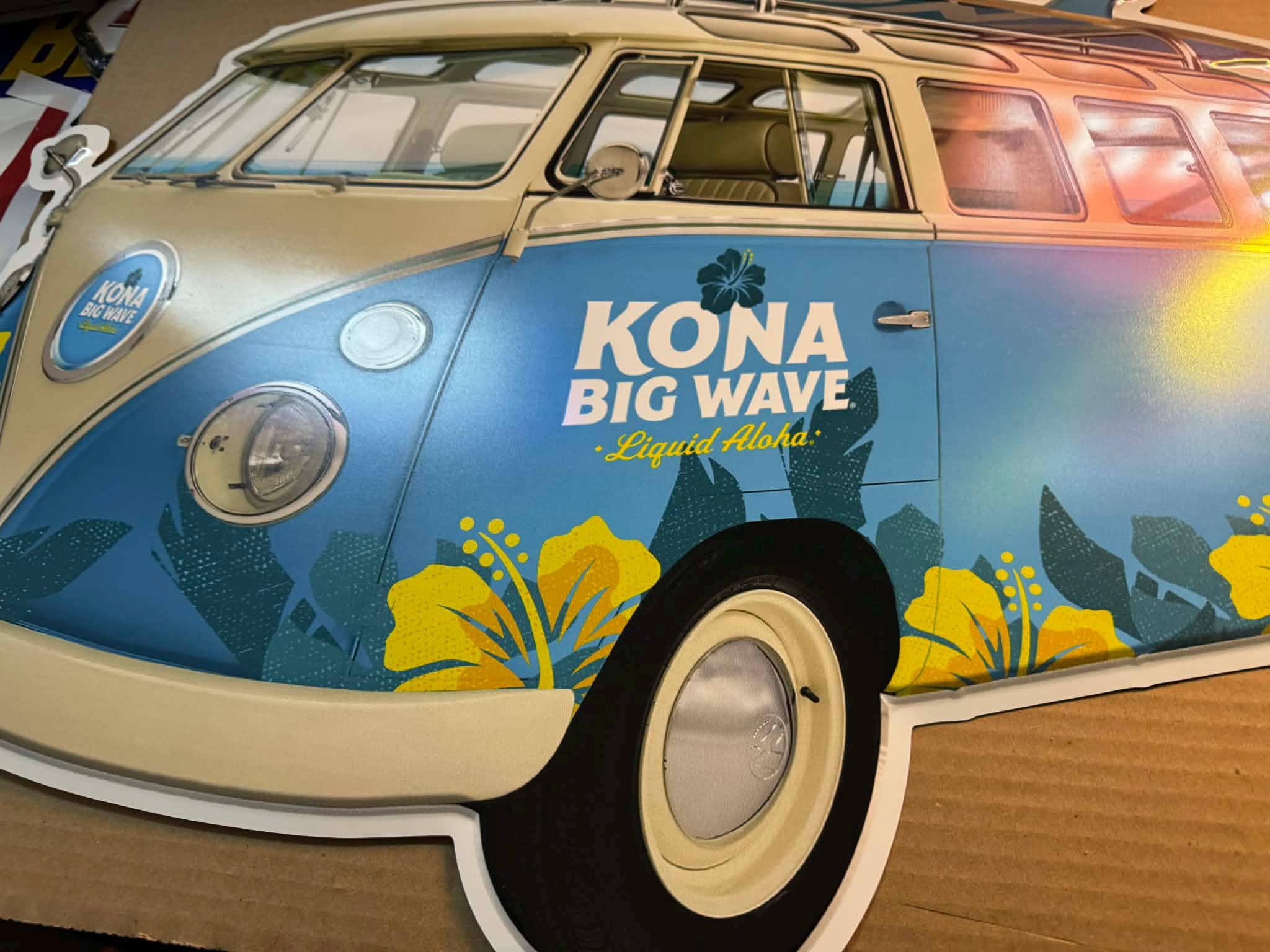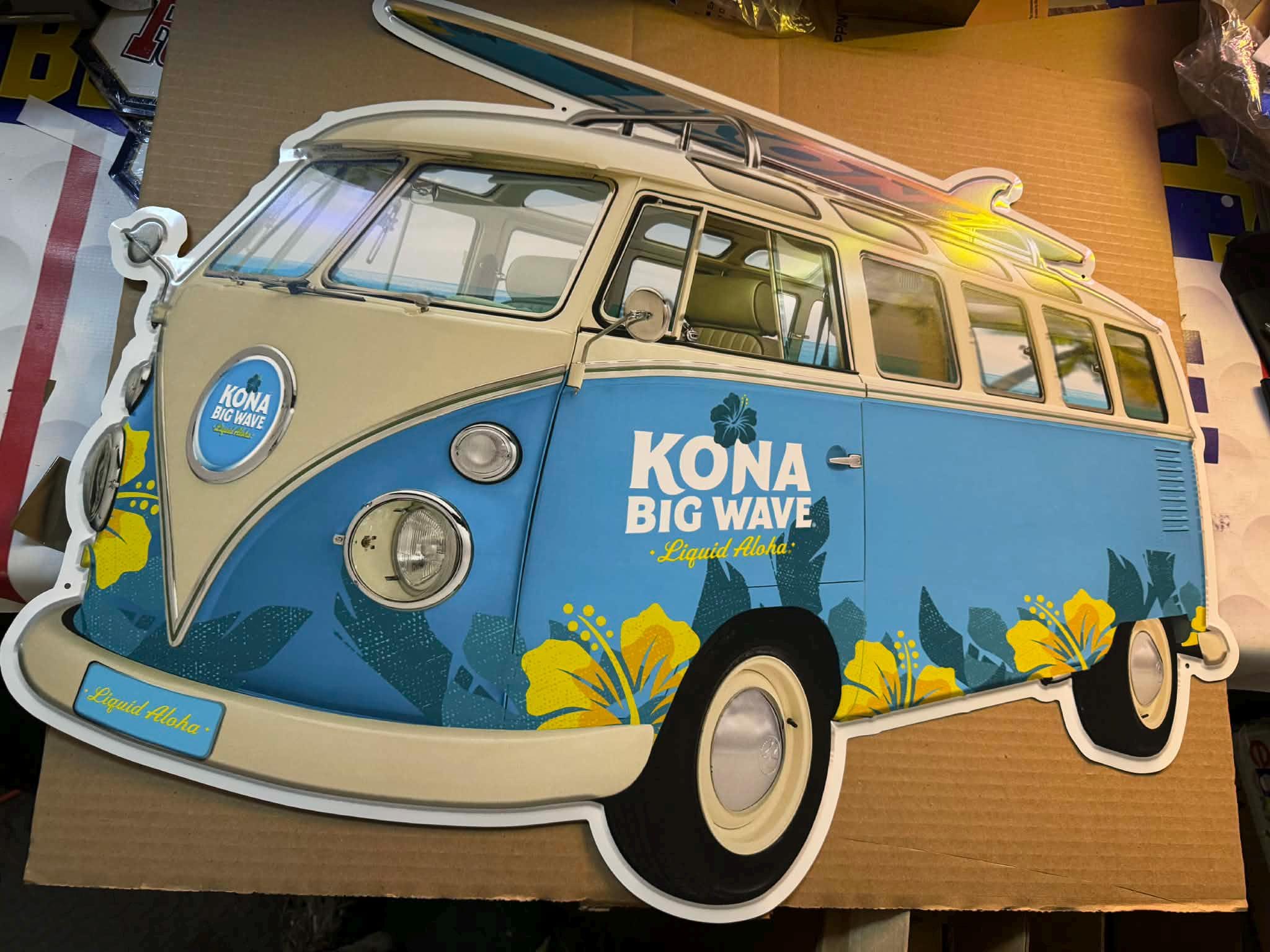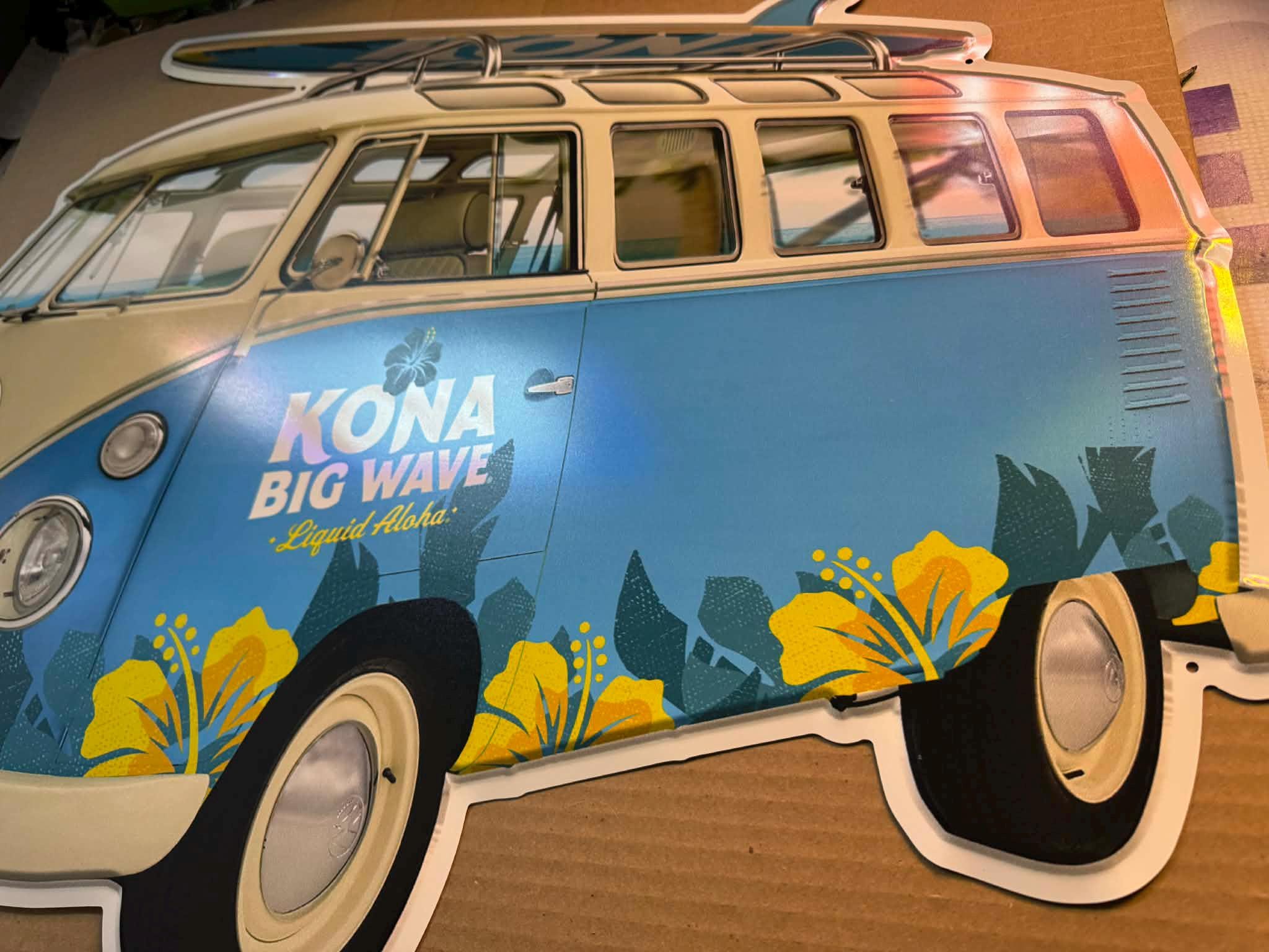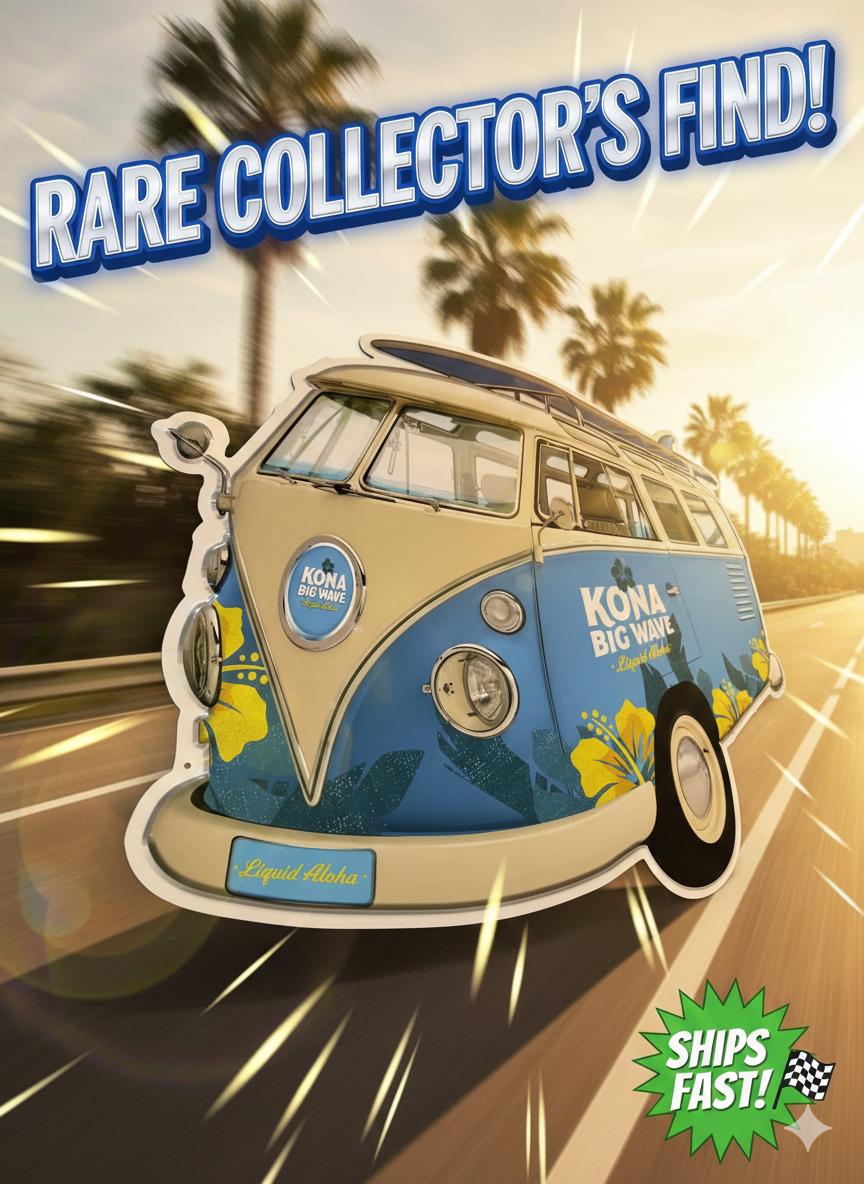 Bring island vibes to your space with this ULTRA RARE Kona Big Wave Die-Cut VW Bus Tin Sign, featuring the iconic surf van artwork and “Liquid Aloha” branding. This is a MASSIVE statement piece that stands out instantly in any mancavedecor, garage, bar, or brewery-style setup.