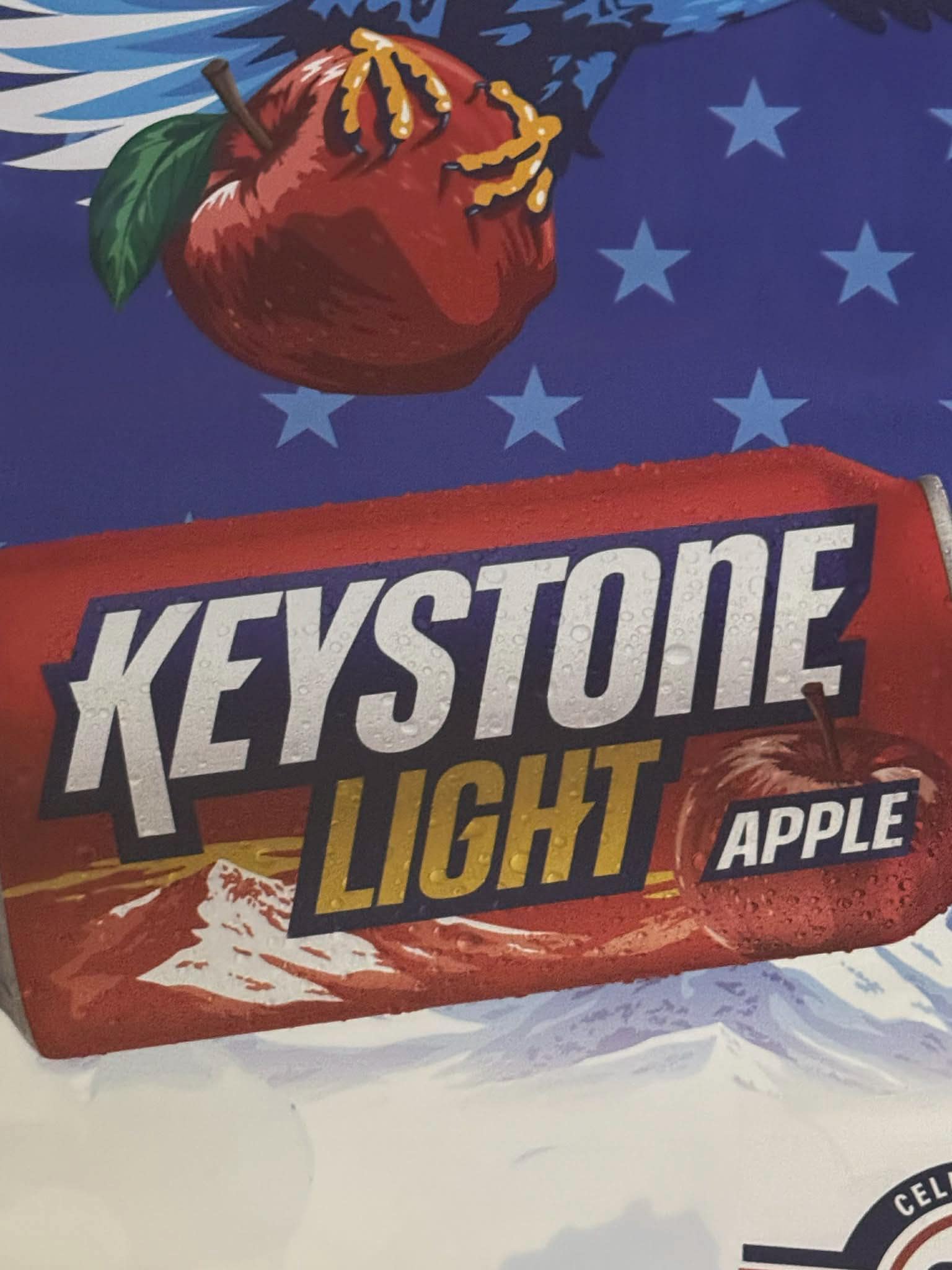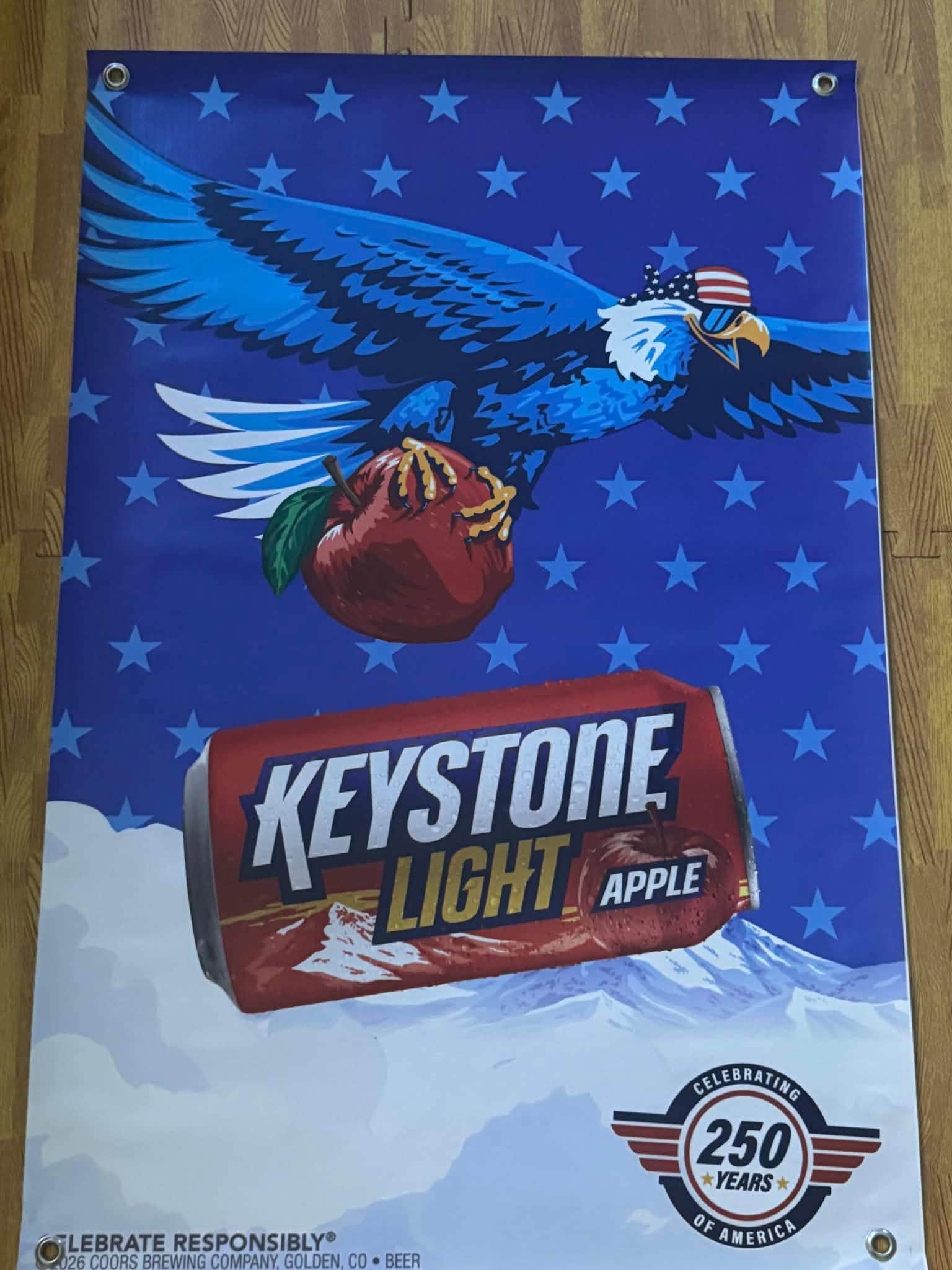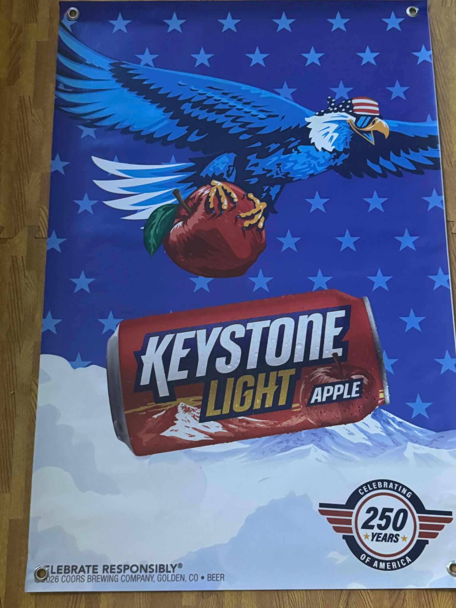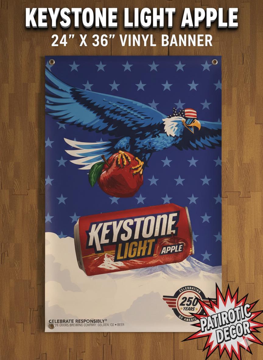 Add bold beer brand style to your mancavedecor, garage, bar, or shop with this Keystone Light Apple vinyl banner featuring patriotic eagle artwork and mountain background. Perfect for beer lovers, collectors, and home bar setups.