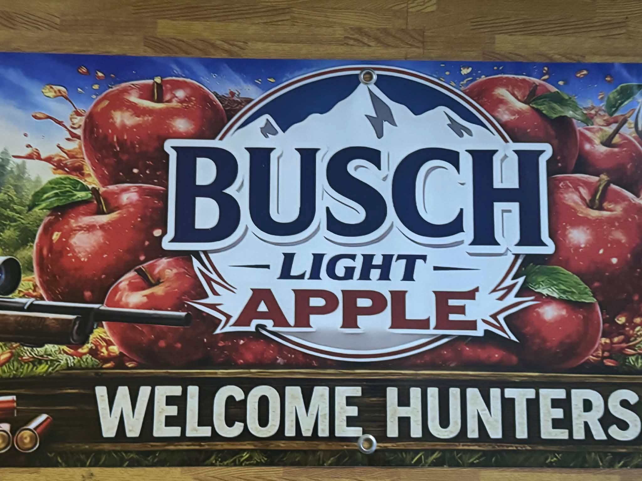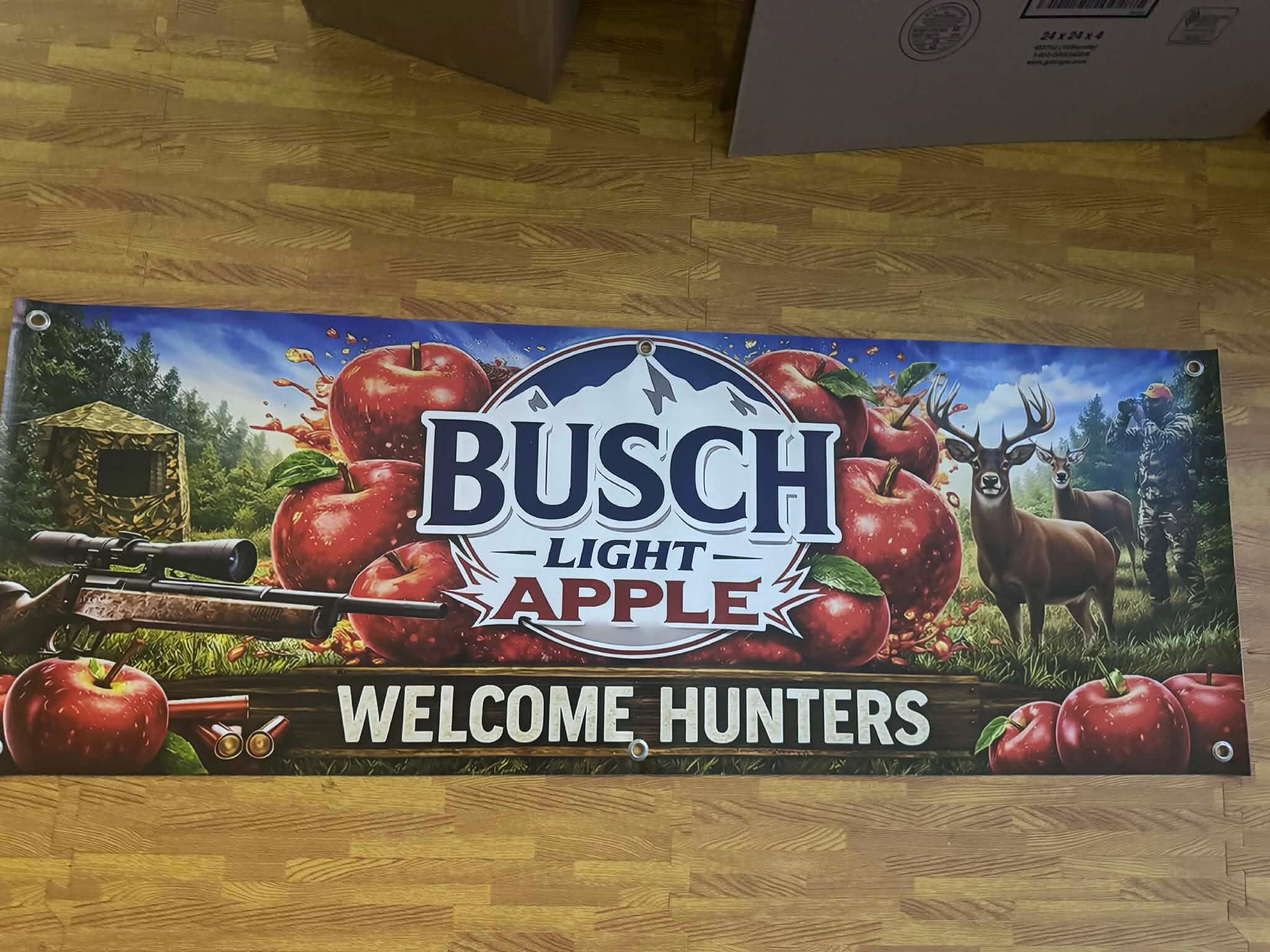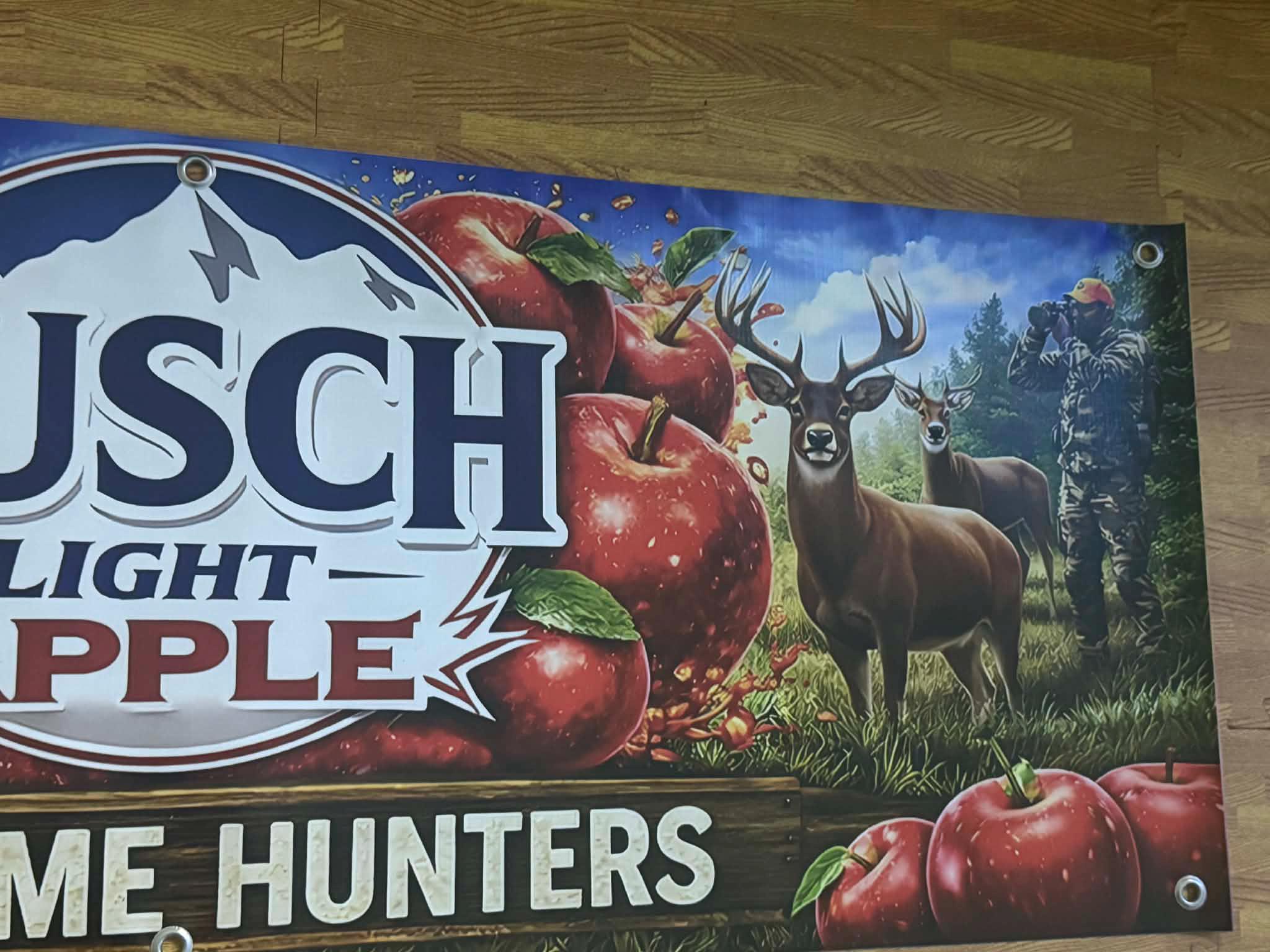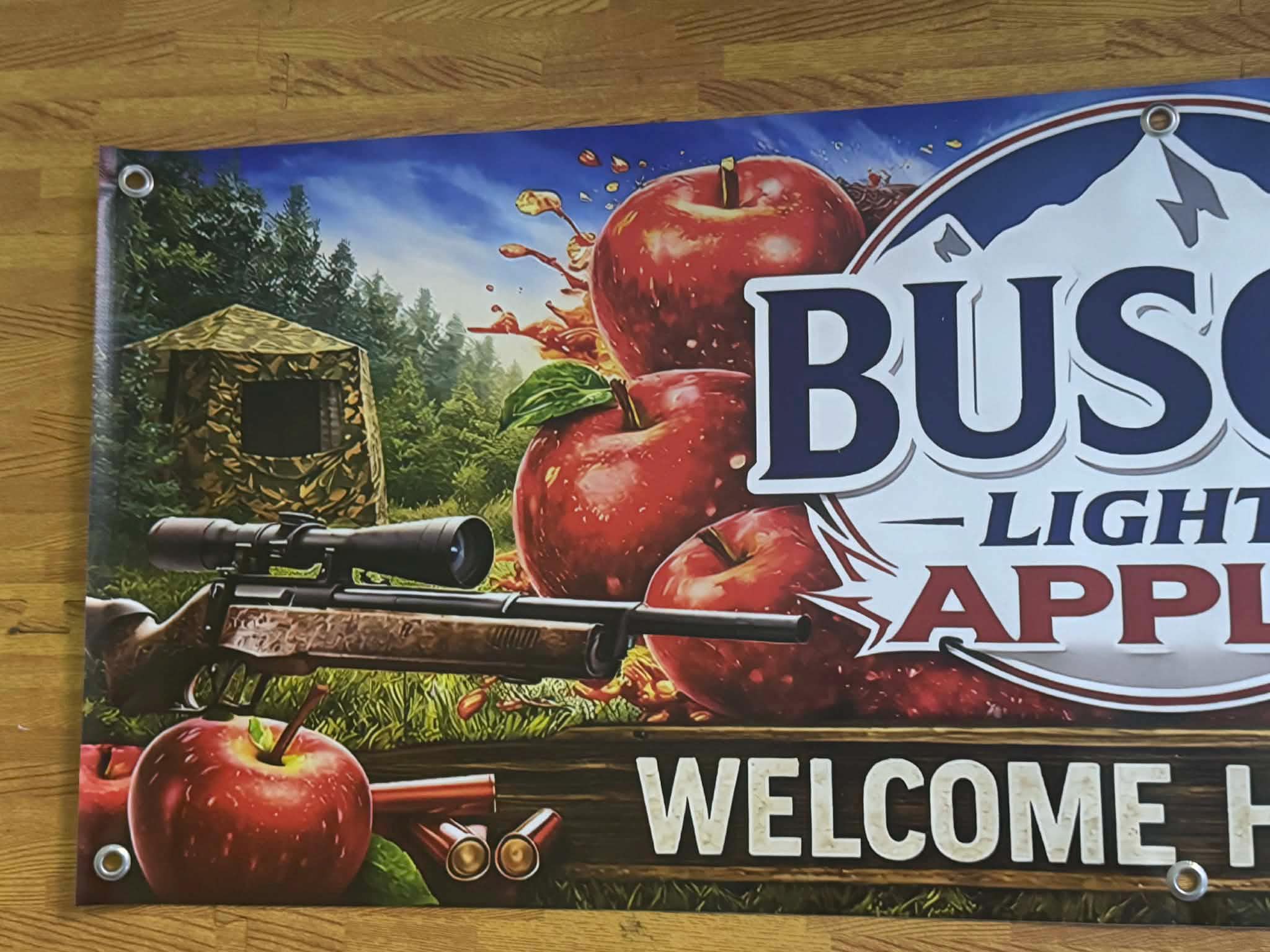 Bring the ultimate hunting camp vibe to your mancavedecor, cabin, garage, or deer camp with this large Busch Light Apple “Welcome Hunters” vinyl banner. Featuring bold apple artwork, rifle, deer, and outdoor hunting scene, this banner is a perfect statement piece for any beer lover or outdoorsman.