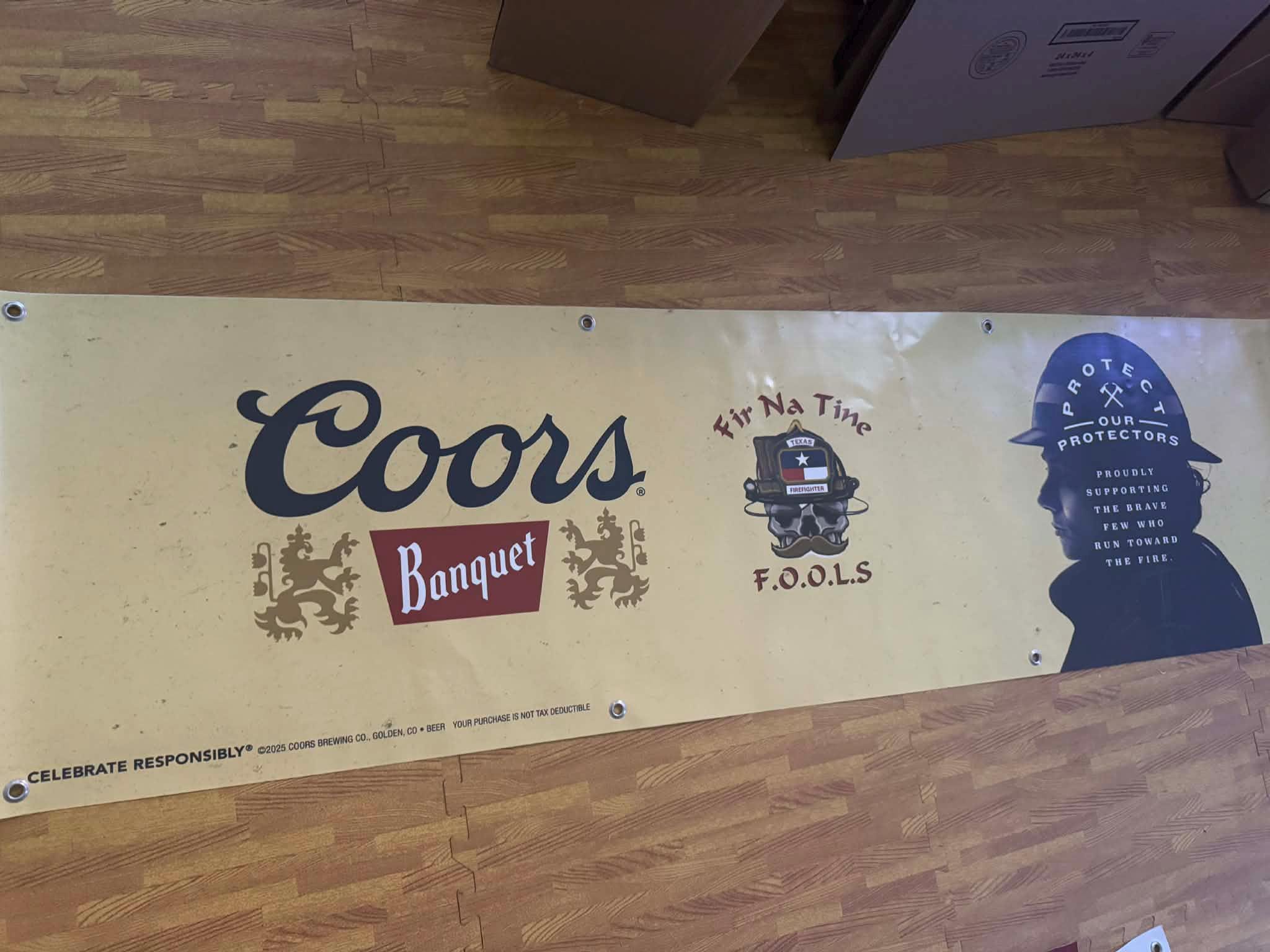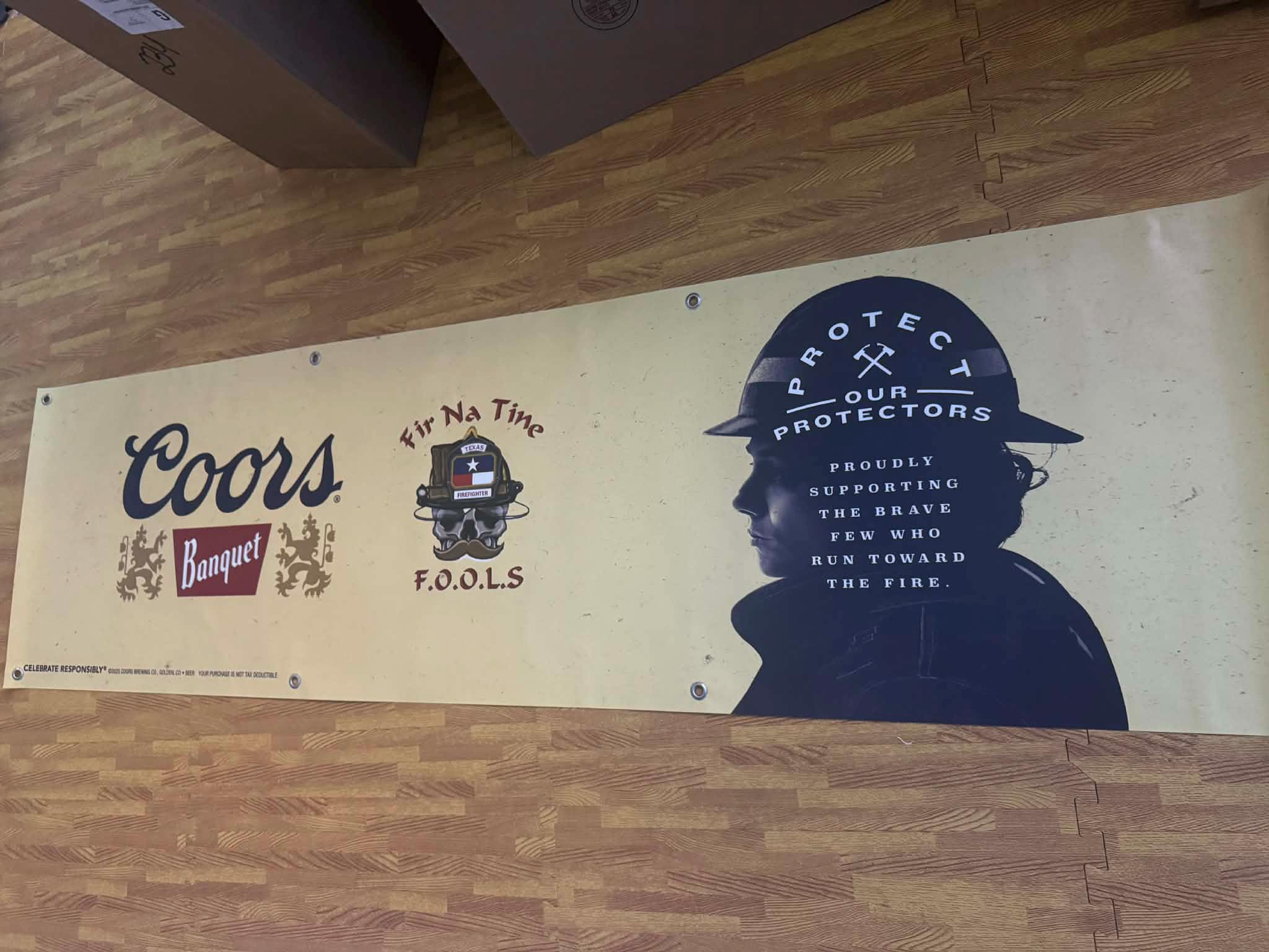 Make a bold statement in your mancavedecor, garage, firehouse, or home bar with this rare Coors Banquet Firefighter “Fir Na Time F.O.O.L.S” vinyl banner. Featuring firefighter artwork and Protect Our Protectors design, this extra long 72 inch banner is a standout piece for collectors, firefighters, and beer decor lovers.