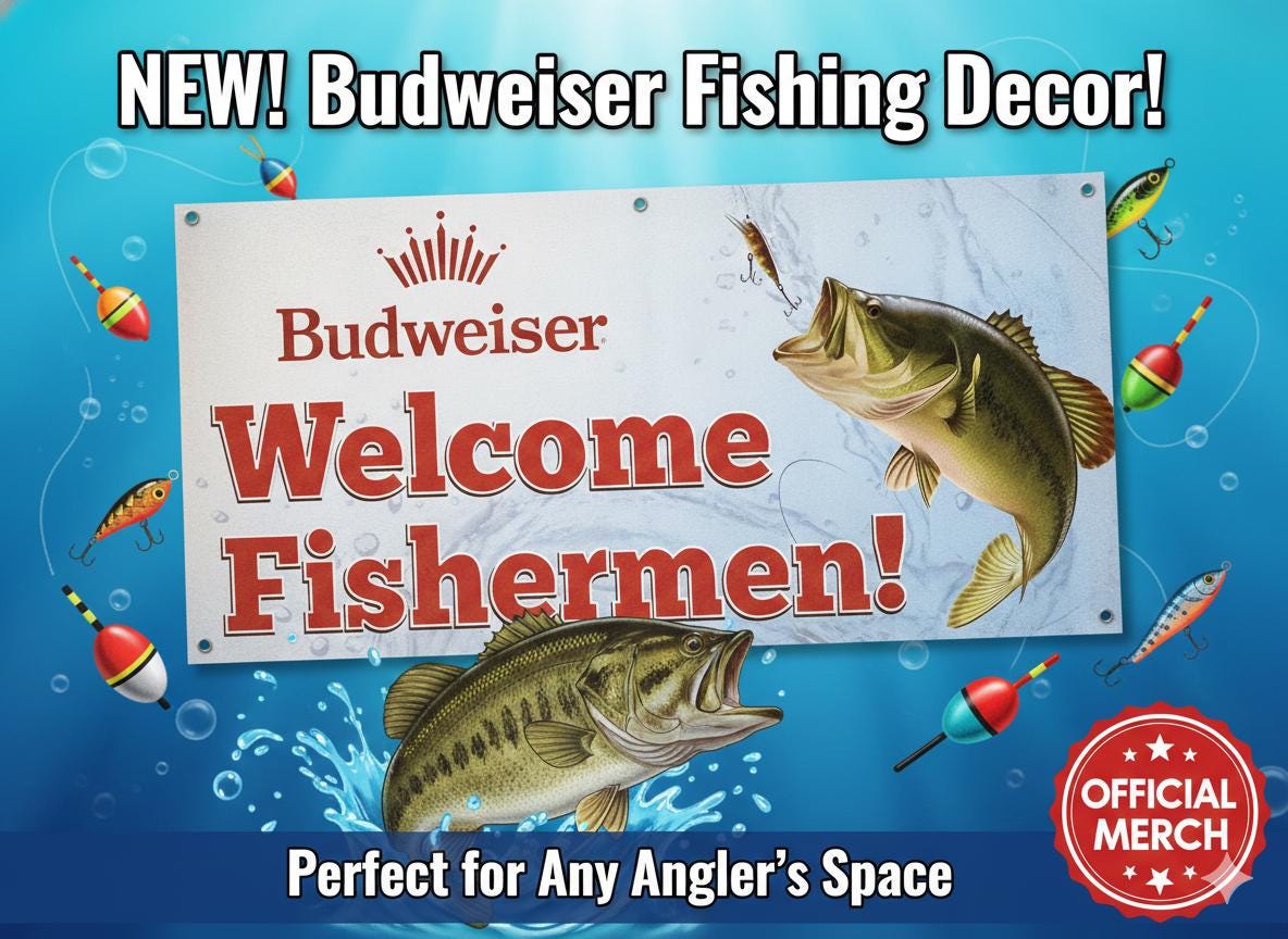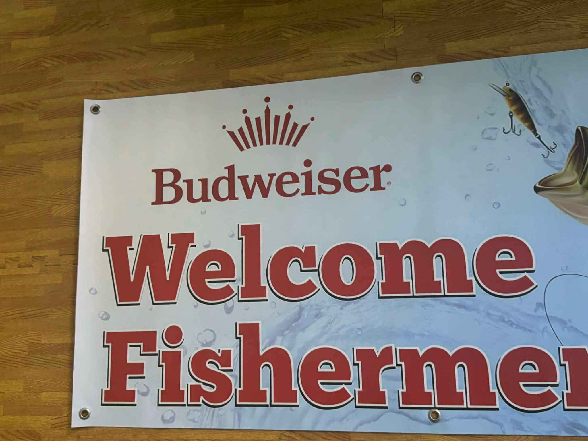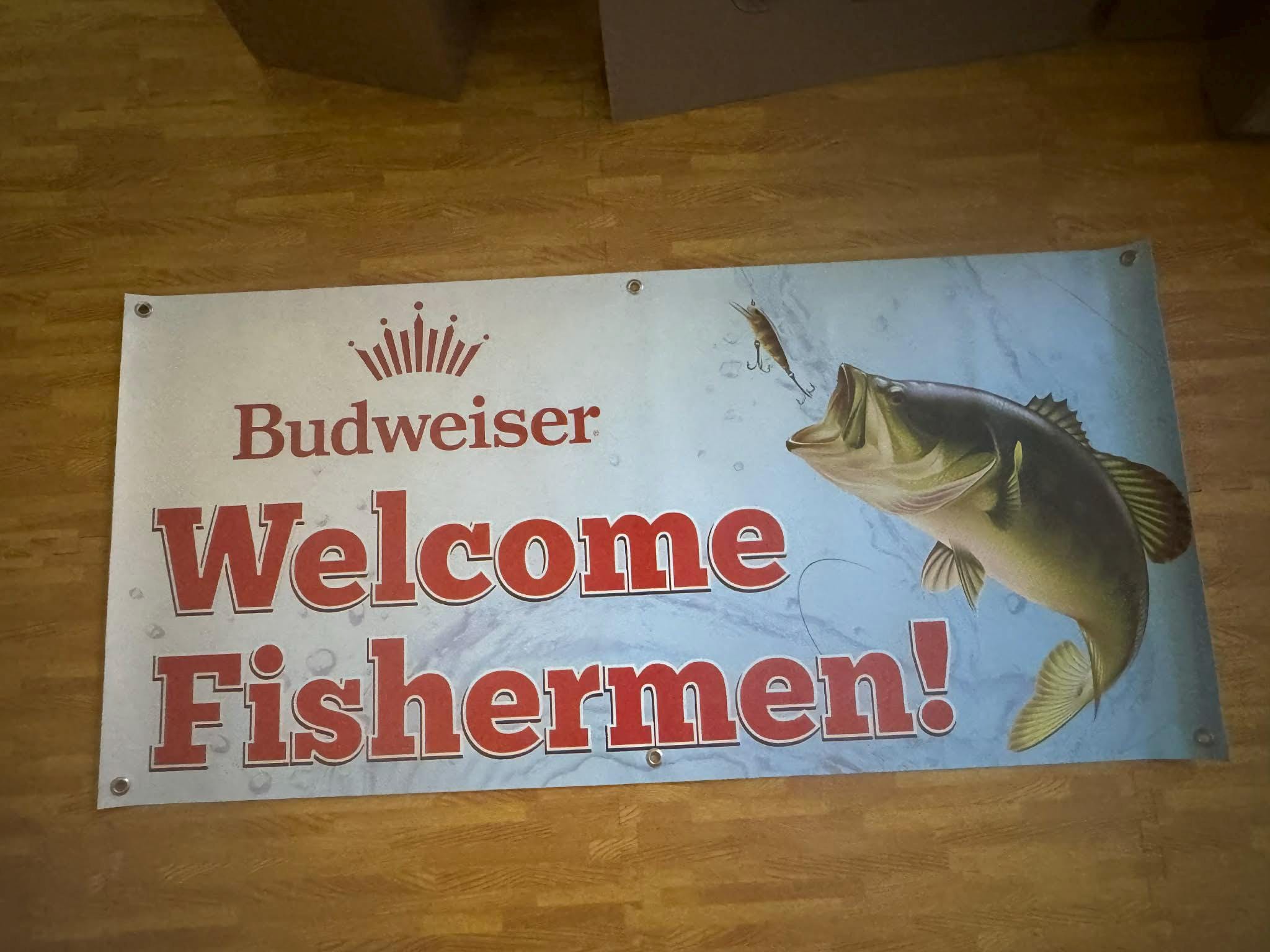 Welcome fishermen in style with this large Budweiser “Welcome Fishermen” vinyl banner — the perfect statement piece for any mancavedecor setup, lake house, garage, bar, or fishing cabin.
