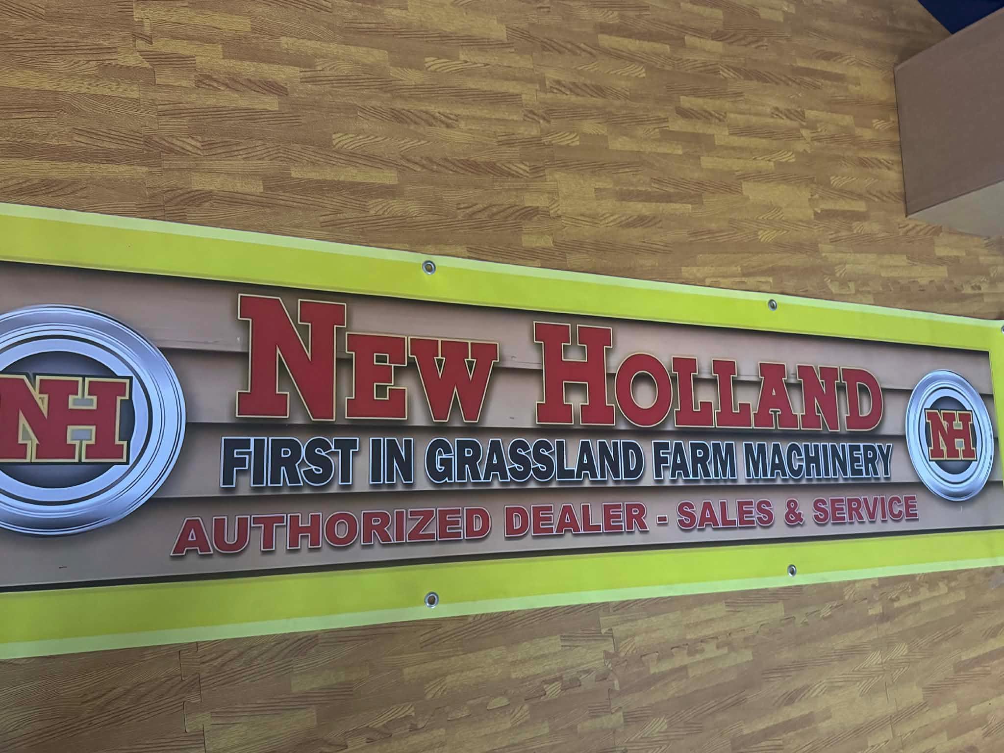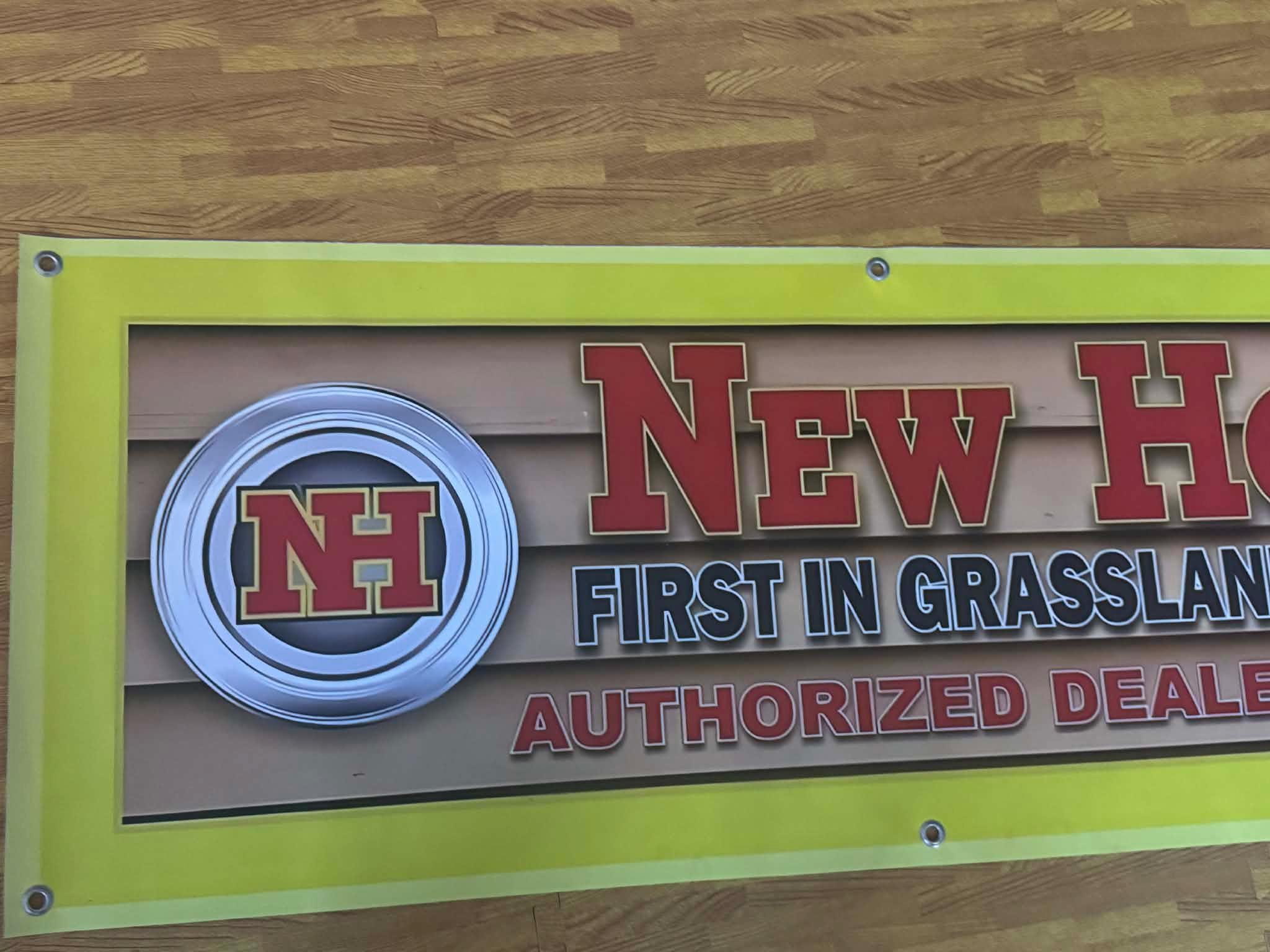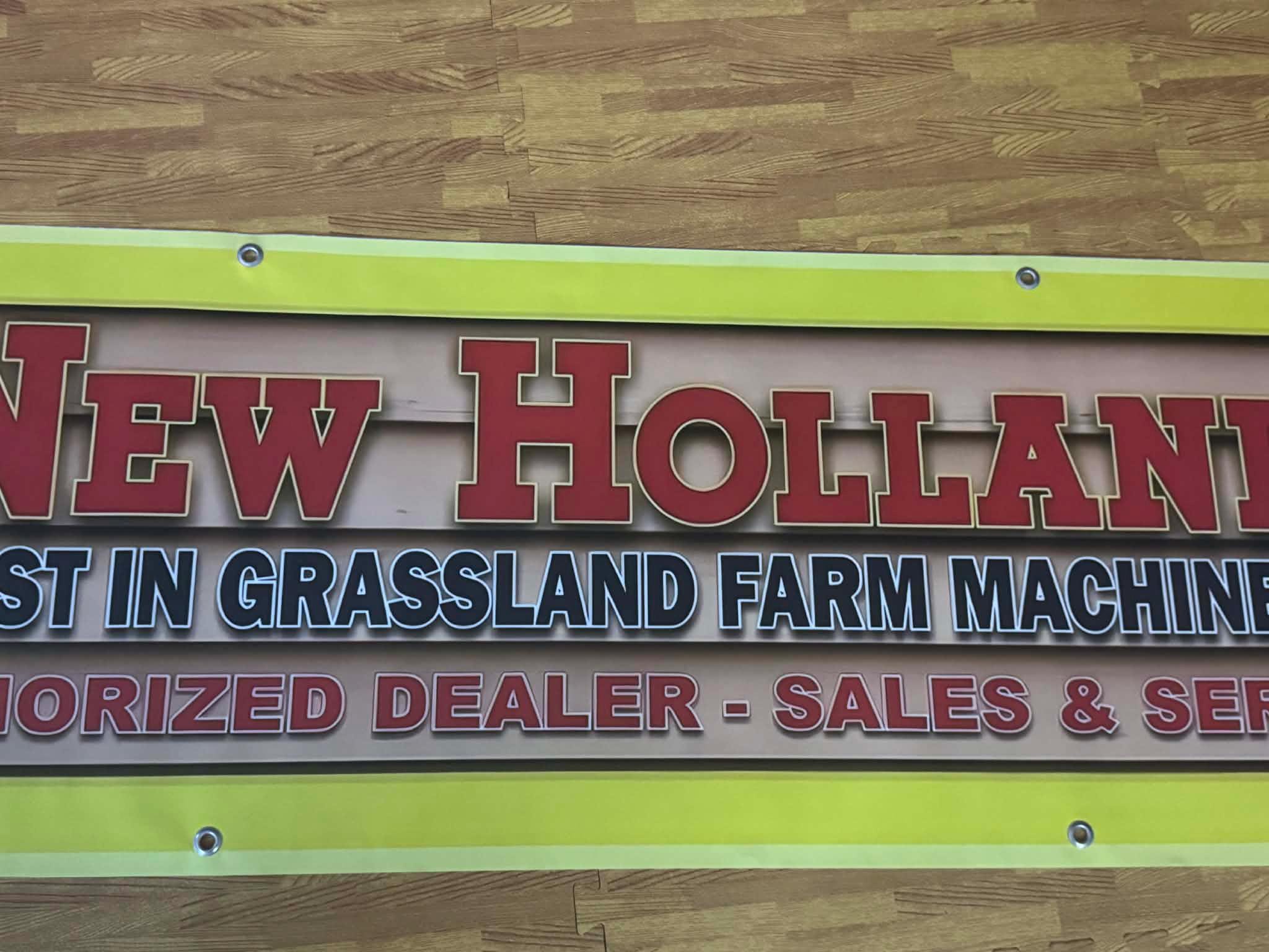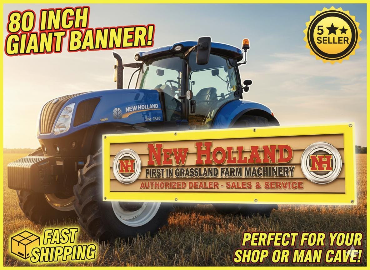 This oversized 80" x 20" banner features official New Holland branding with “First in Grassland Farm Machinery” and Authorized Dealer design, making it ideal for tractor collectors, farmers, and agricultural decor enthusiasts.