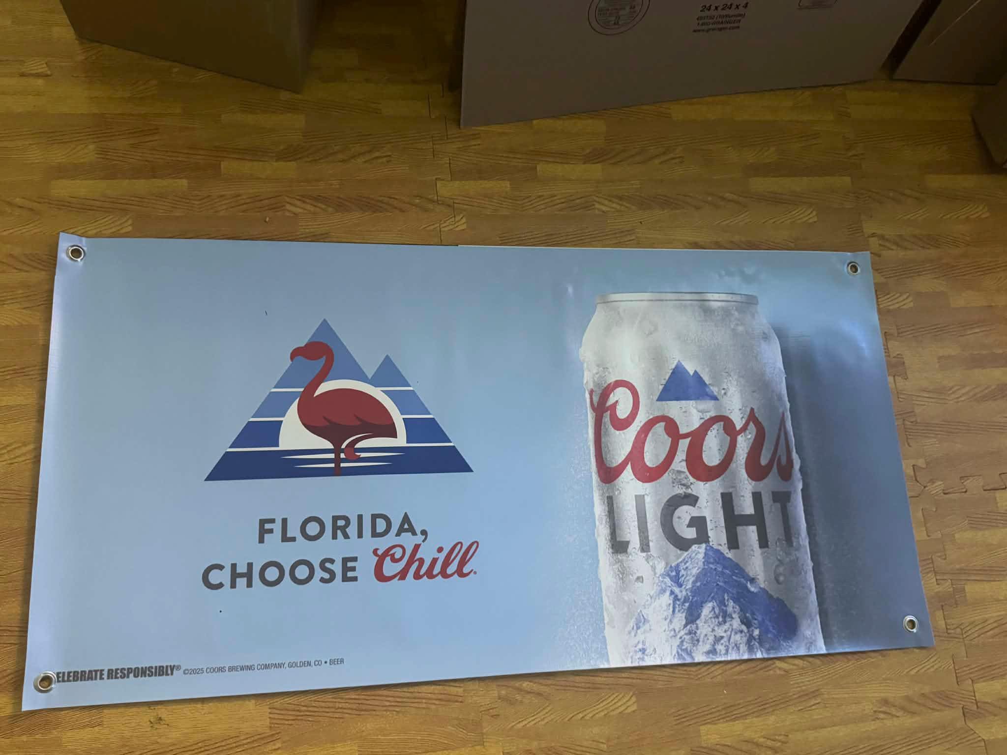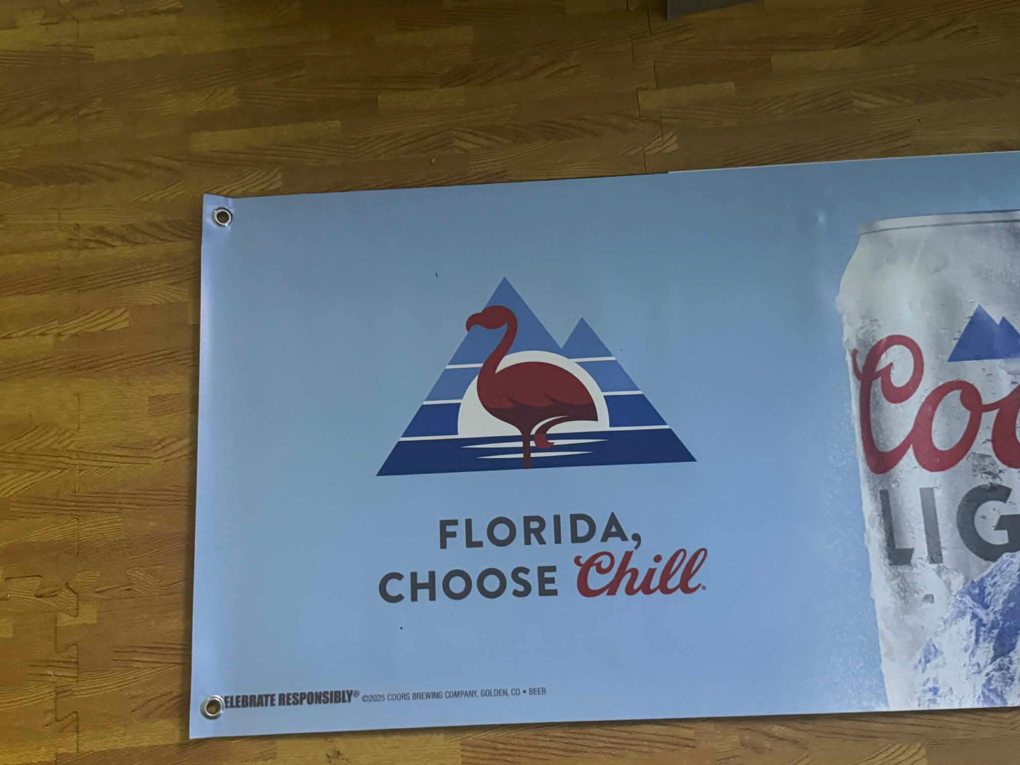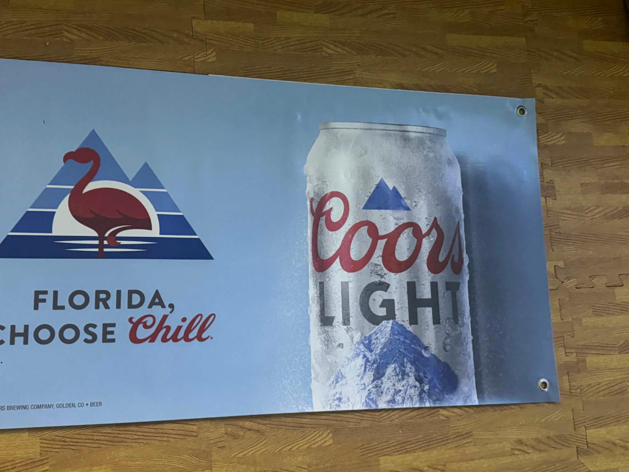 This 40” x 20” vinyl banner features a clean Florida-themed design with Coors Light can artwork and flamingo graphic, making it a standout piece for coastal bars, pool areas, and chill-themed spaces.