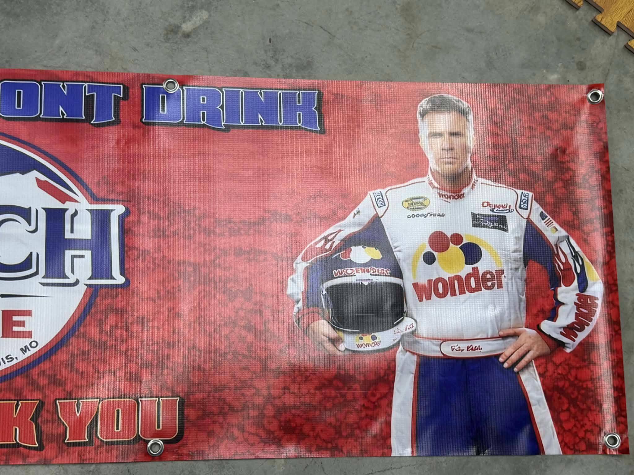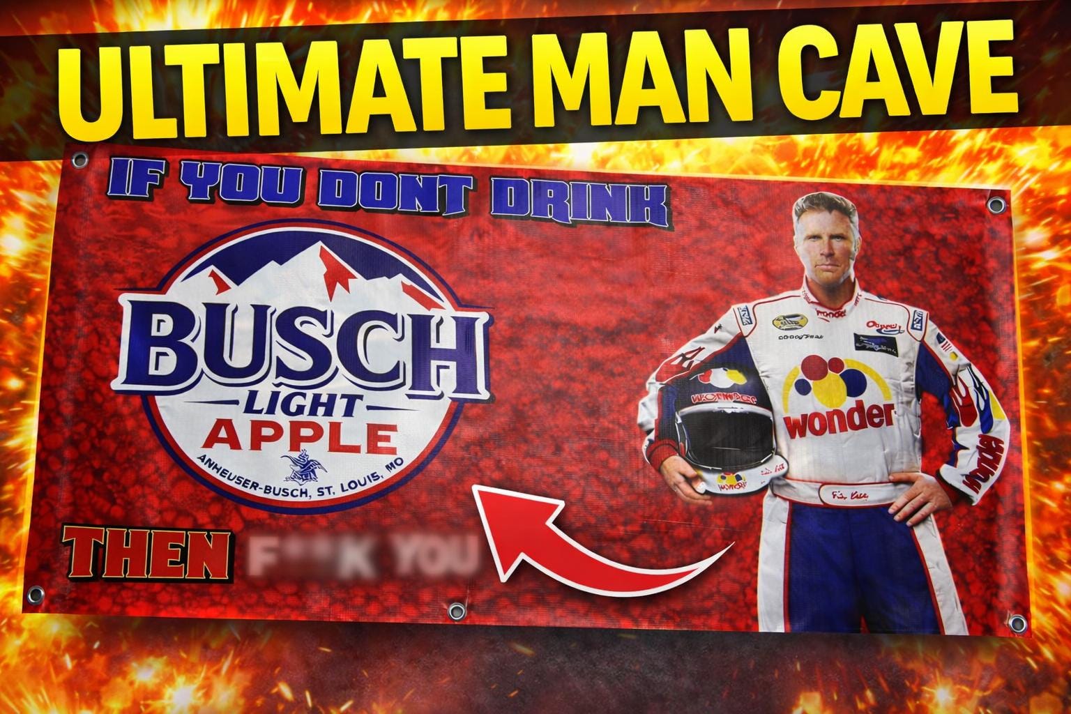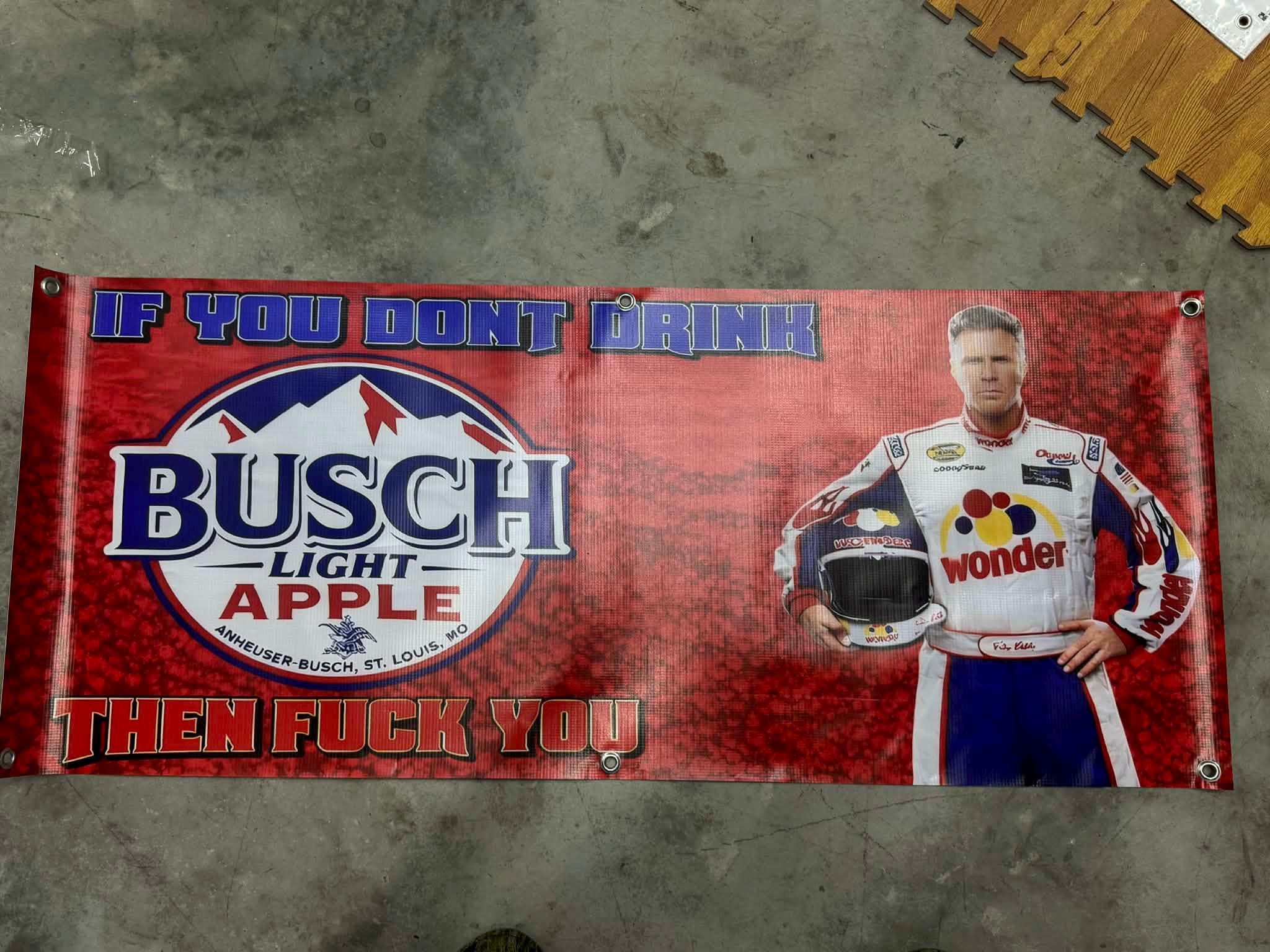 Large Busch Light Apple racing themed vinyl banner featuring a humorous quote and racing driver graphic.