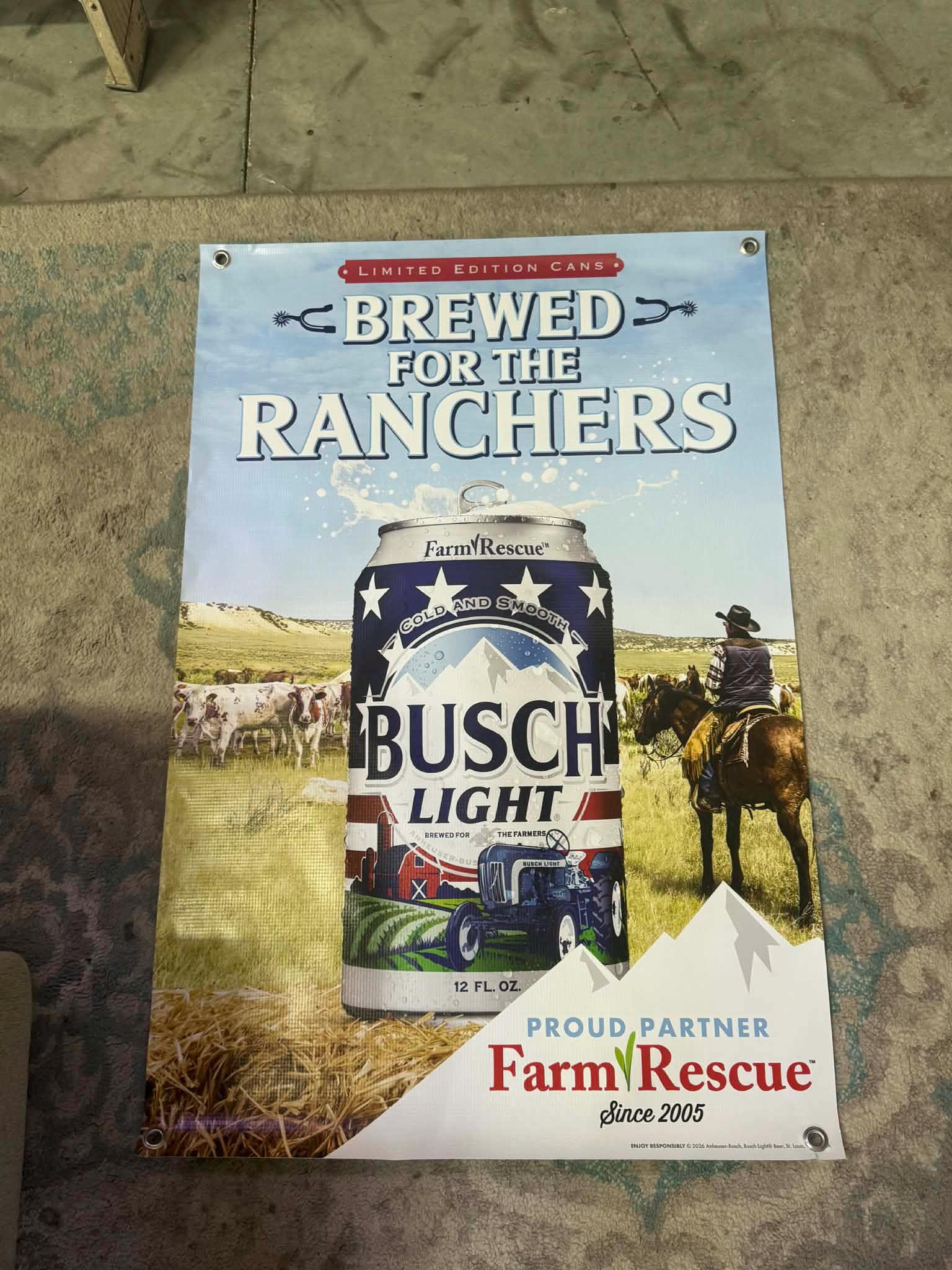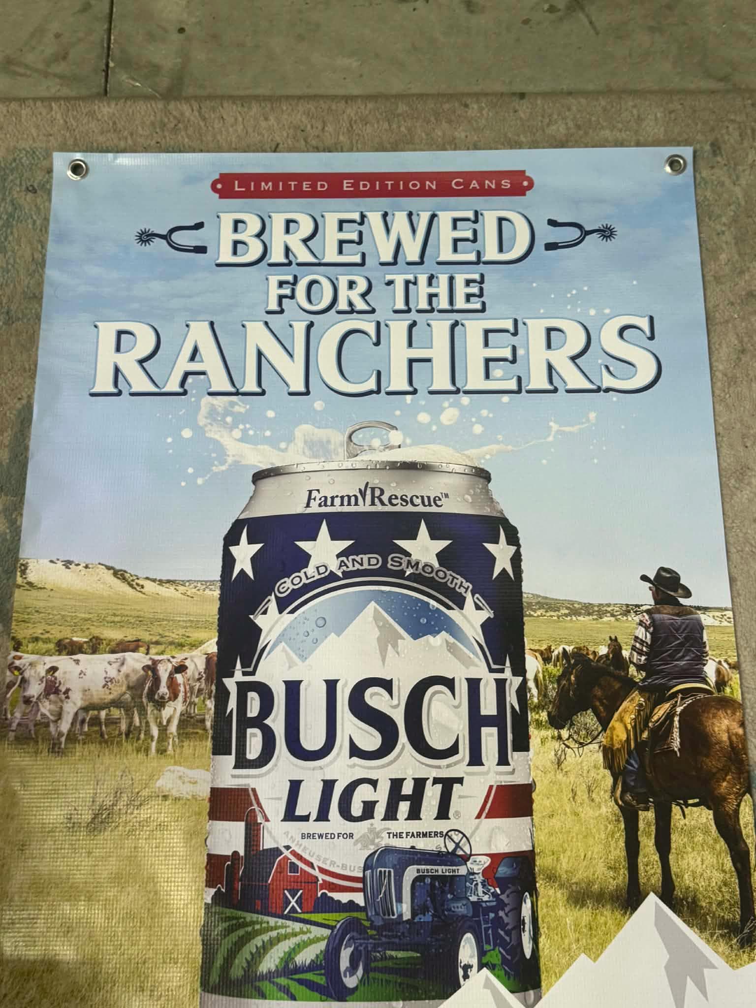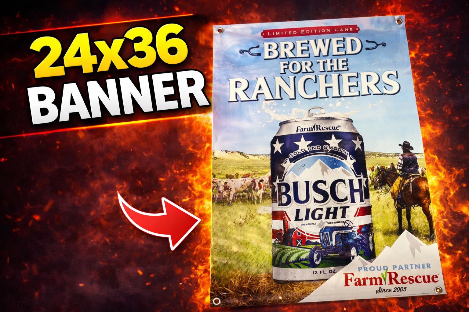 This 24" x 36" Busch Light beer banner celebrates the partnership with Farm Rescue and the agricultural community.