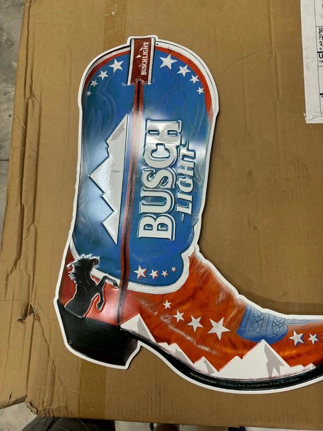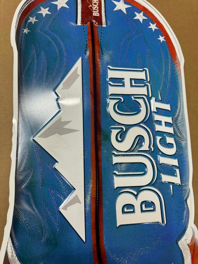 Unique Busch Light cowboy boot metal sign featuring a patriotic red, white, and blue boot design with the classic Busch Light mountains logo.