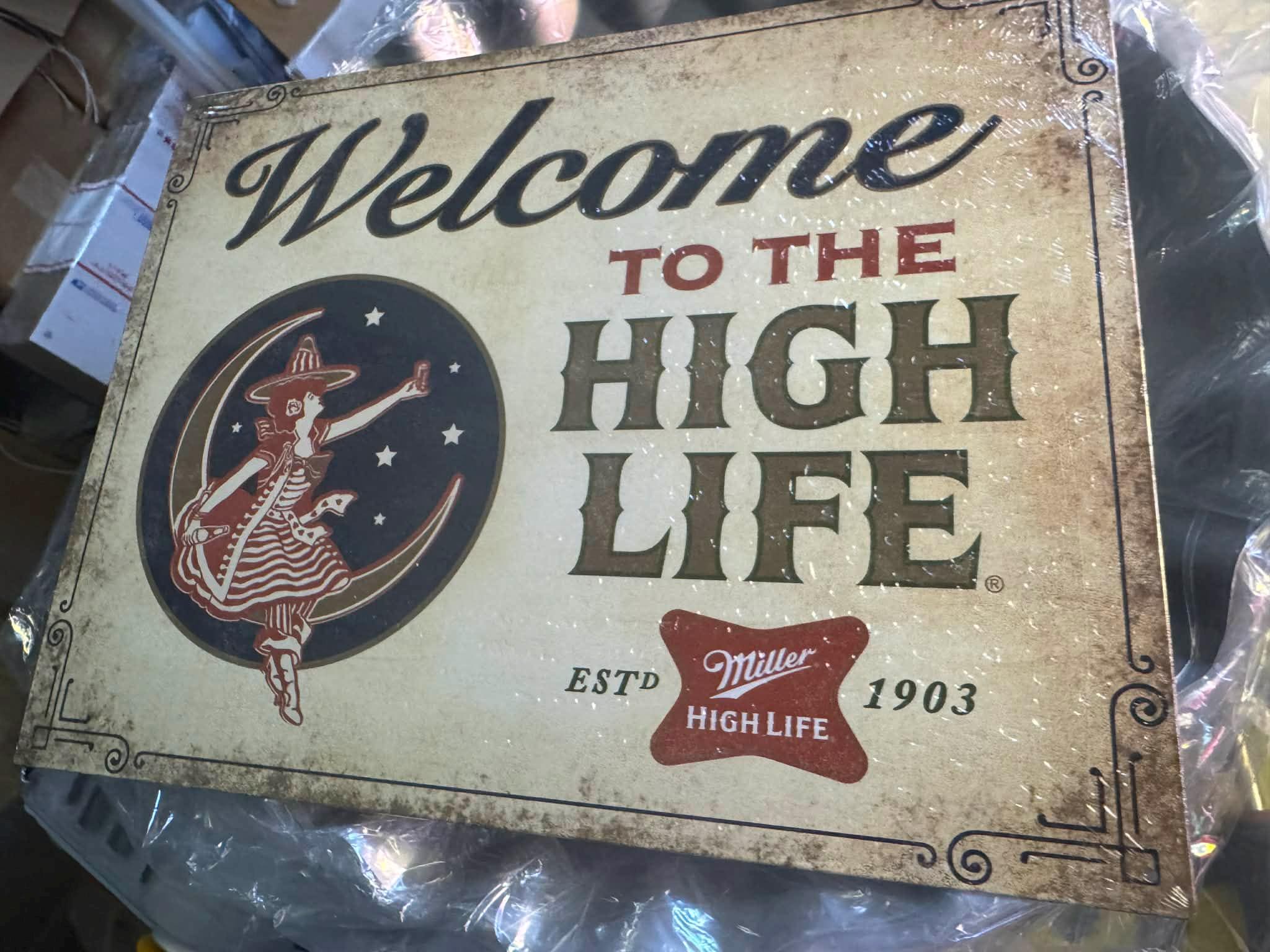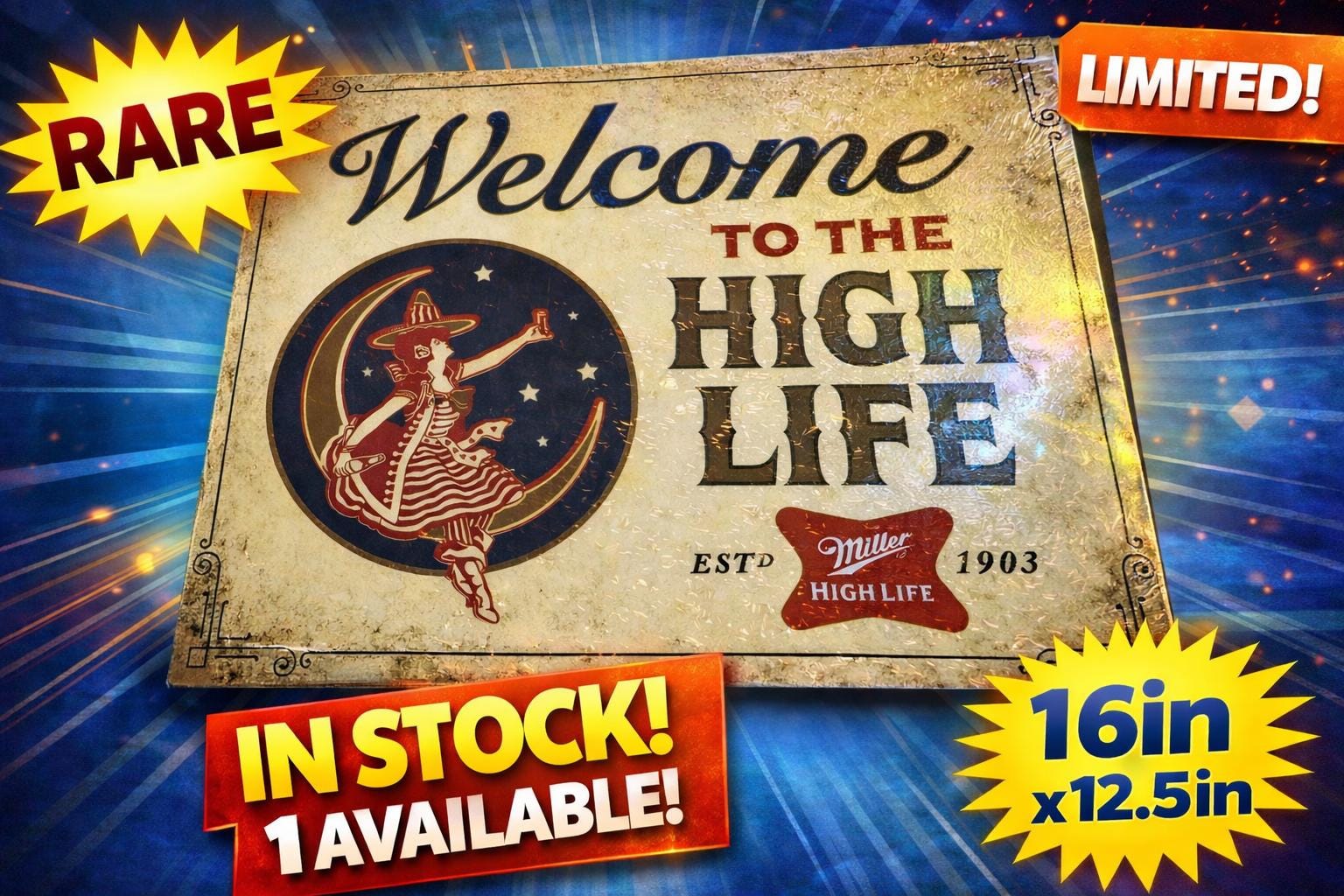 Classic Miller High Life “Welcome to the High Life” tin sign featuring the iconic Girl in the Moon logo and vintage distressed design. This sign captures the timeless look of Miller High Life advertising and makes a great display piece for bars, garages, and mancavedecor setups.