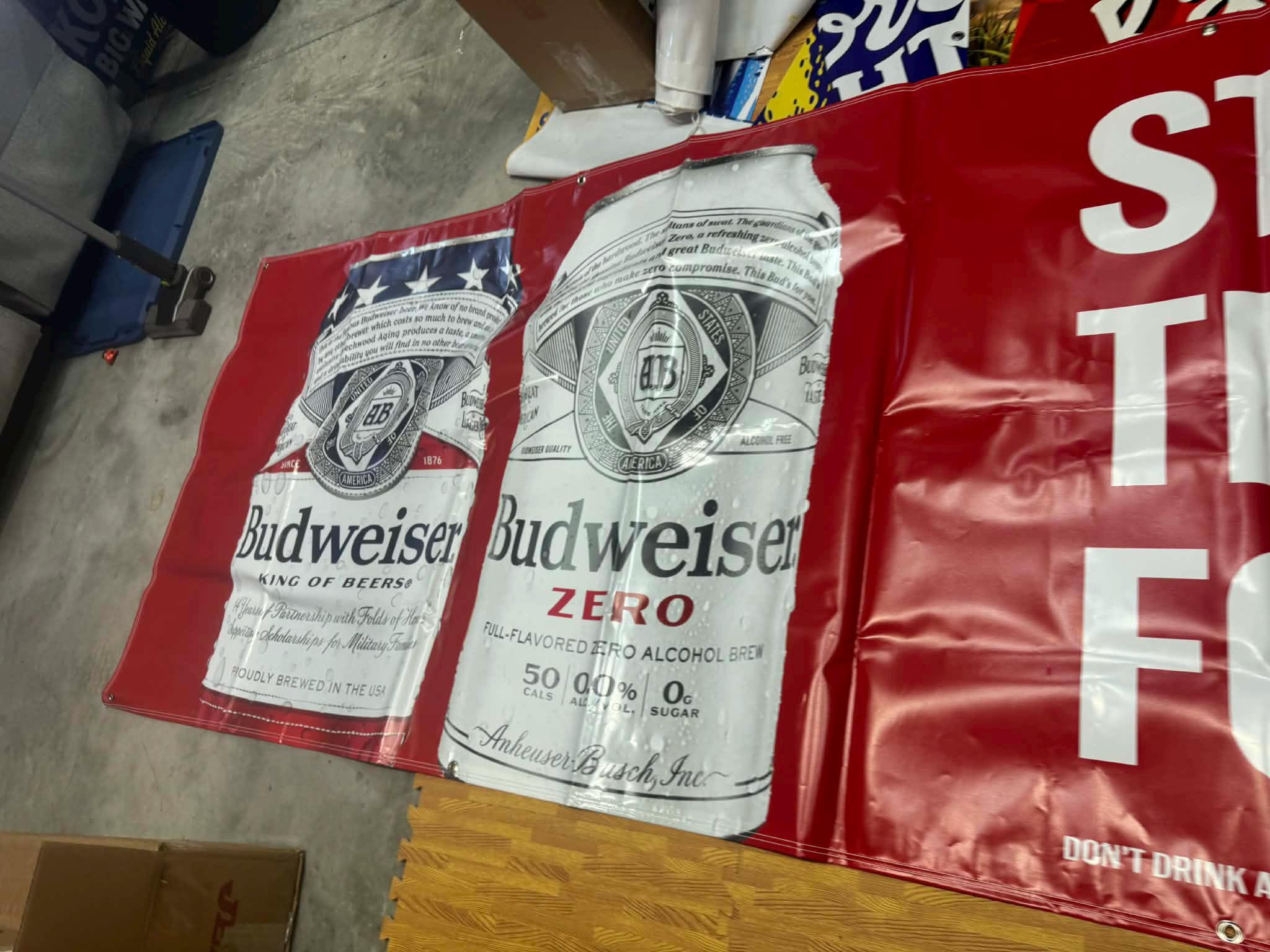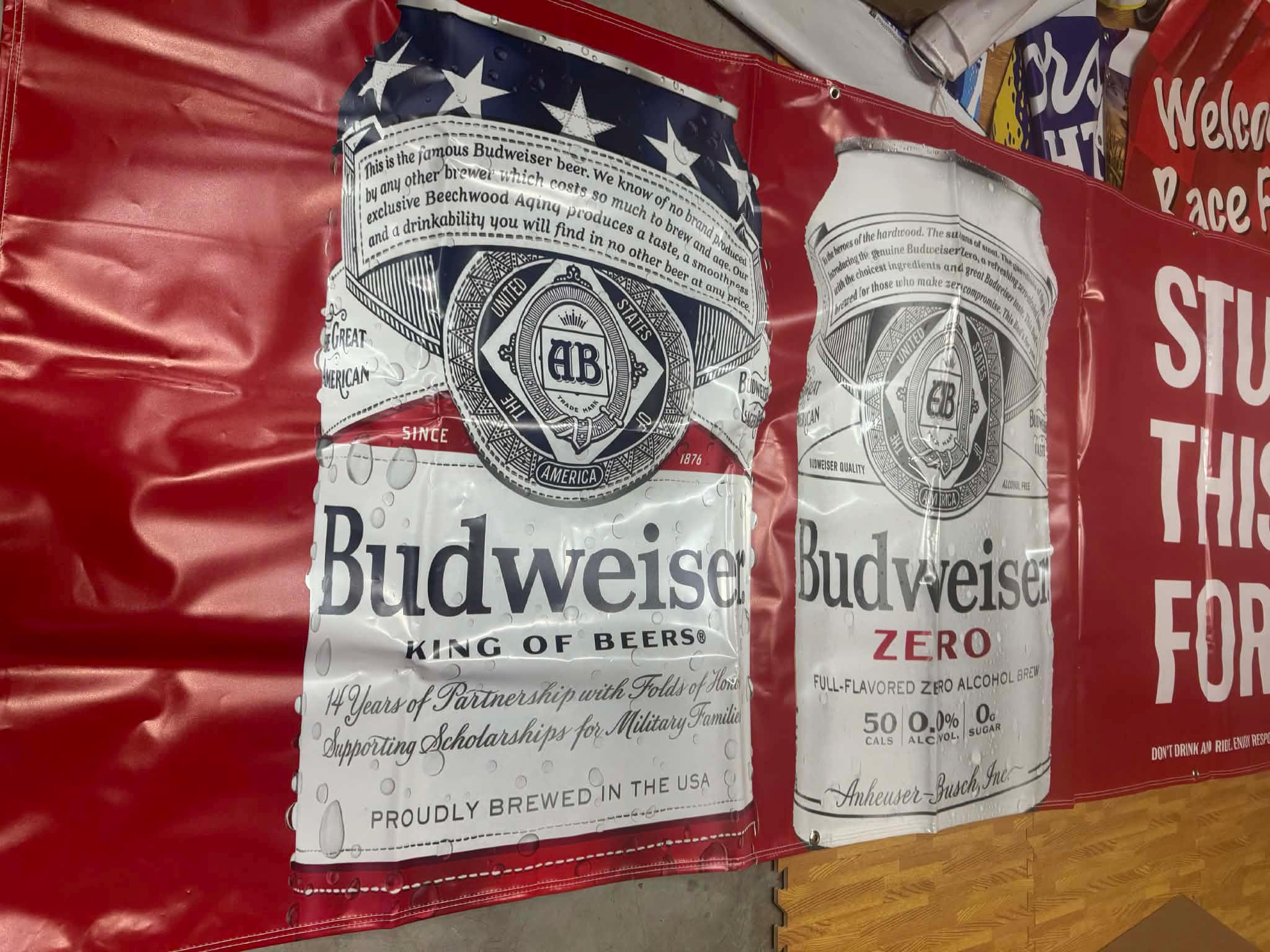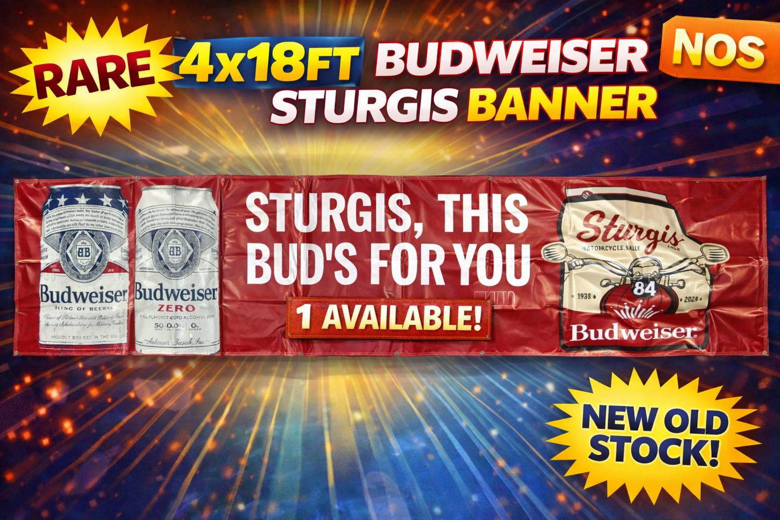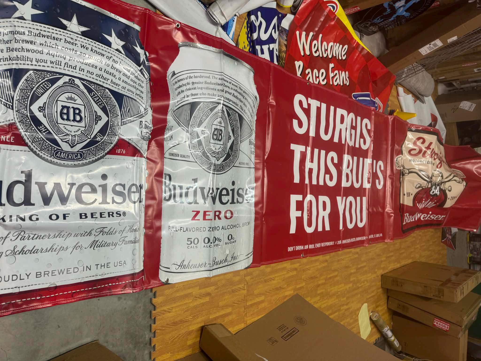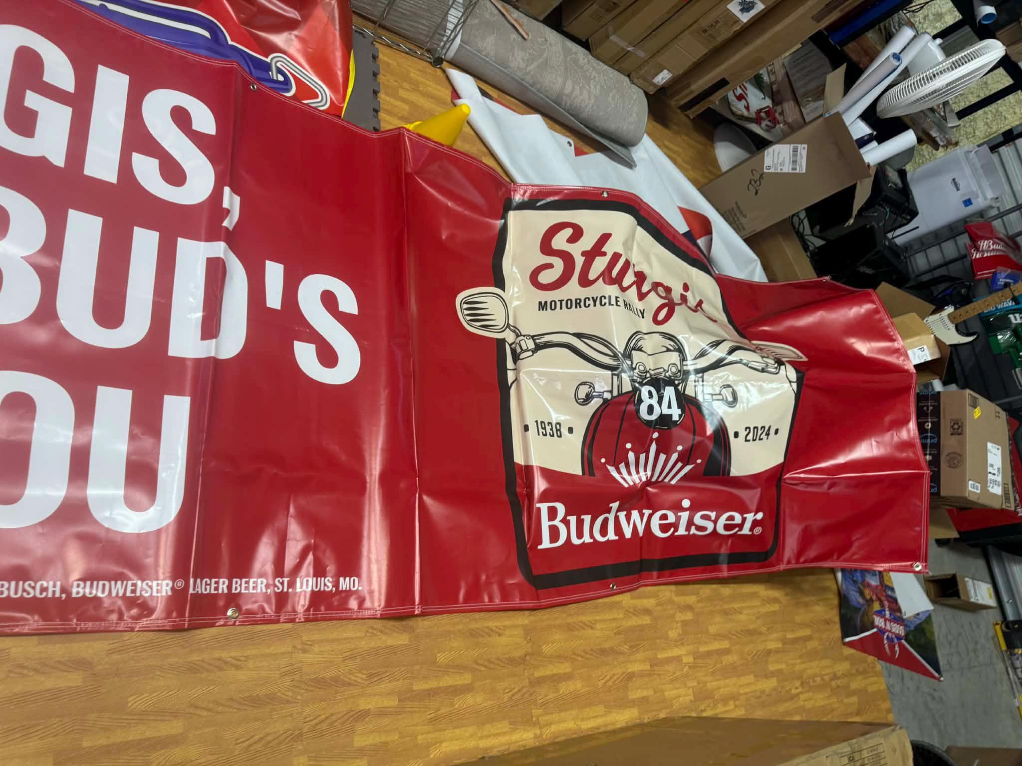 This oversized promotional banner showcases Budweiser cans alongside bold rally graphics celebrating the legendary Sturgis Motorcycle Rally (1938–2024).