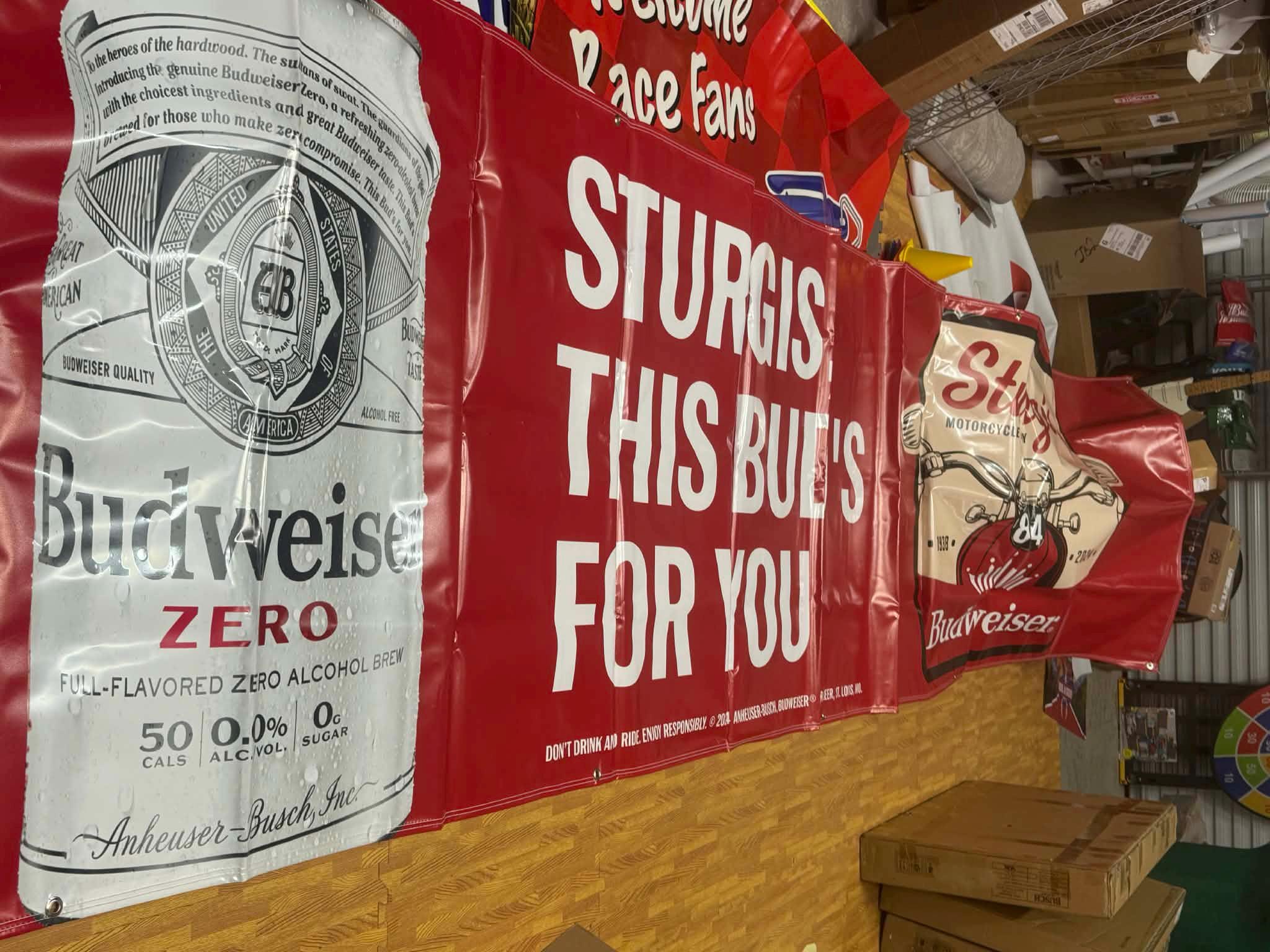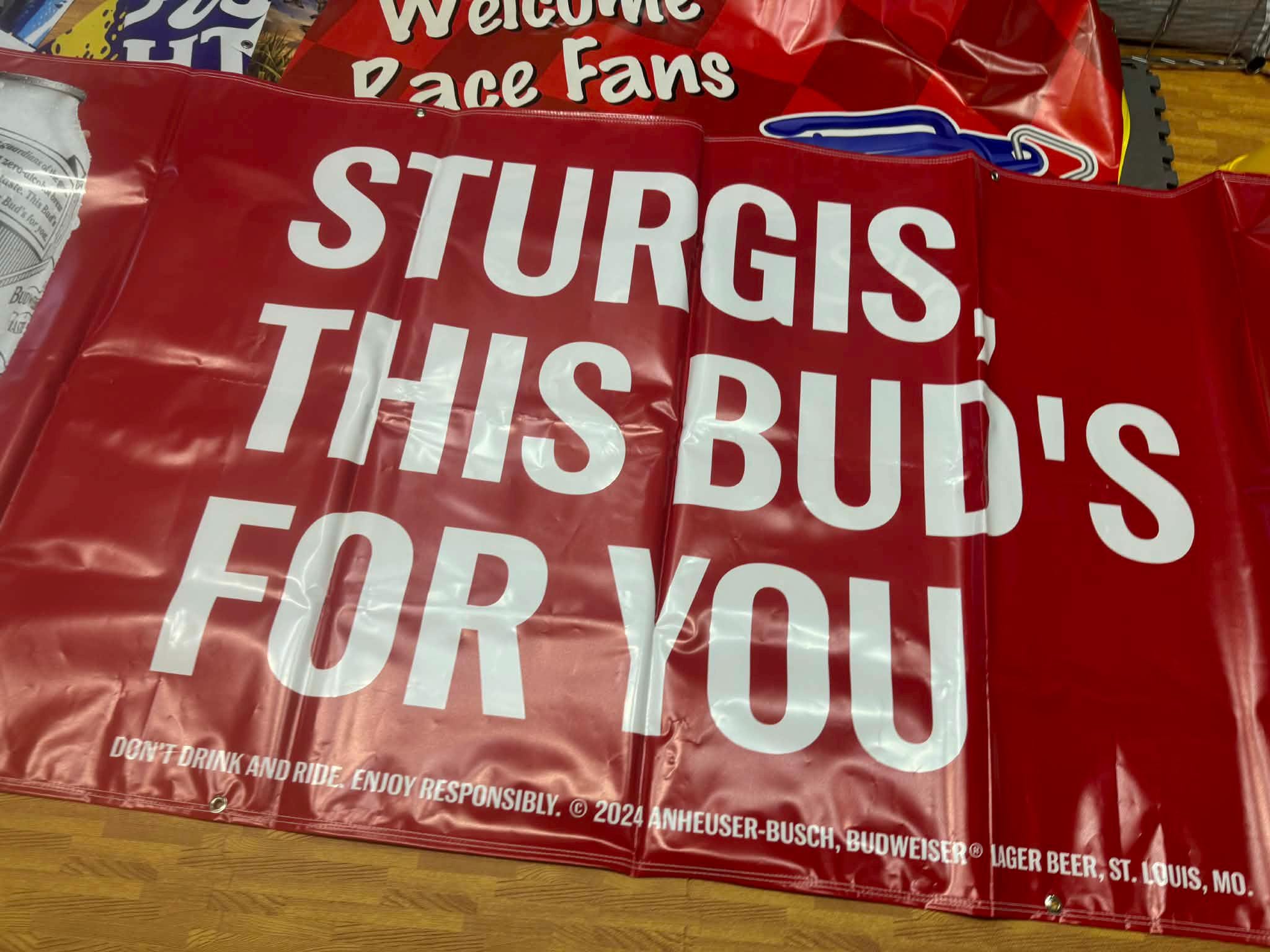 Massive Budweiser Sturgis Motorcycle Rally banner from the 2024 rally featuring the iconic Budweiser slogan “This Bud’s For You.”