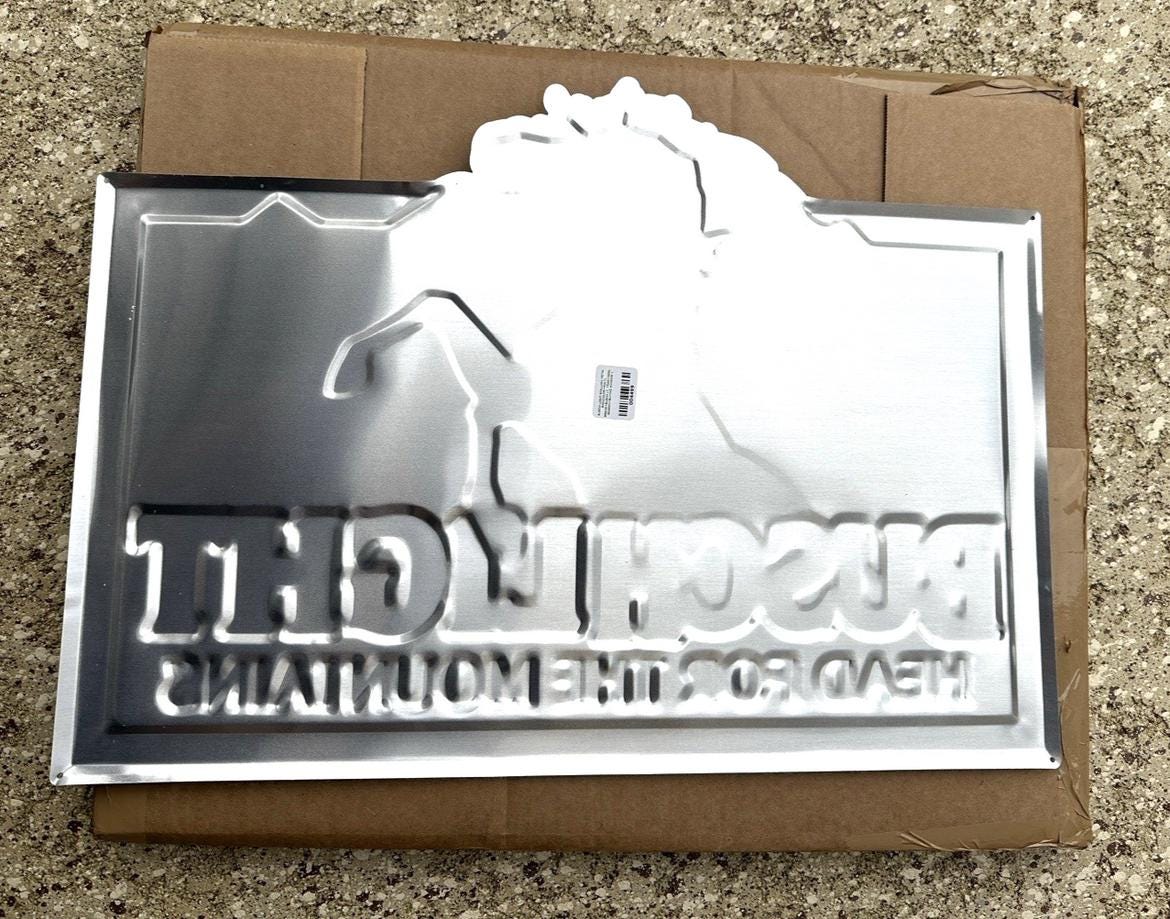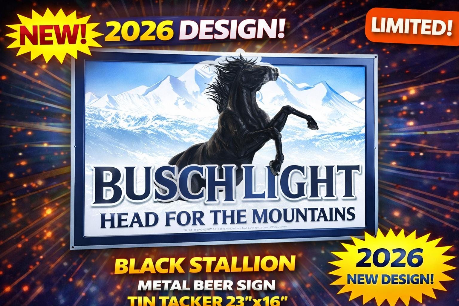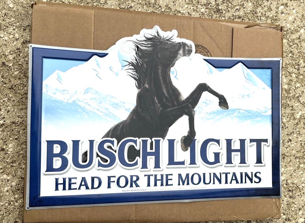Brand new Busch Light “Head For The Mountains” Black Stallion metal tin tacker sign featuring the iconic Busch Light mountains with a powerful black rearing stallion design.