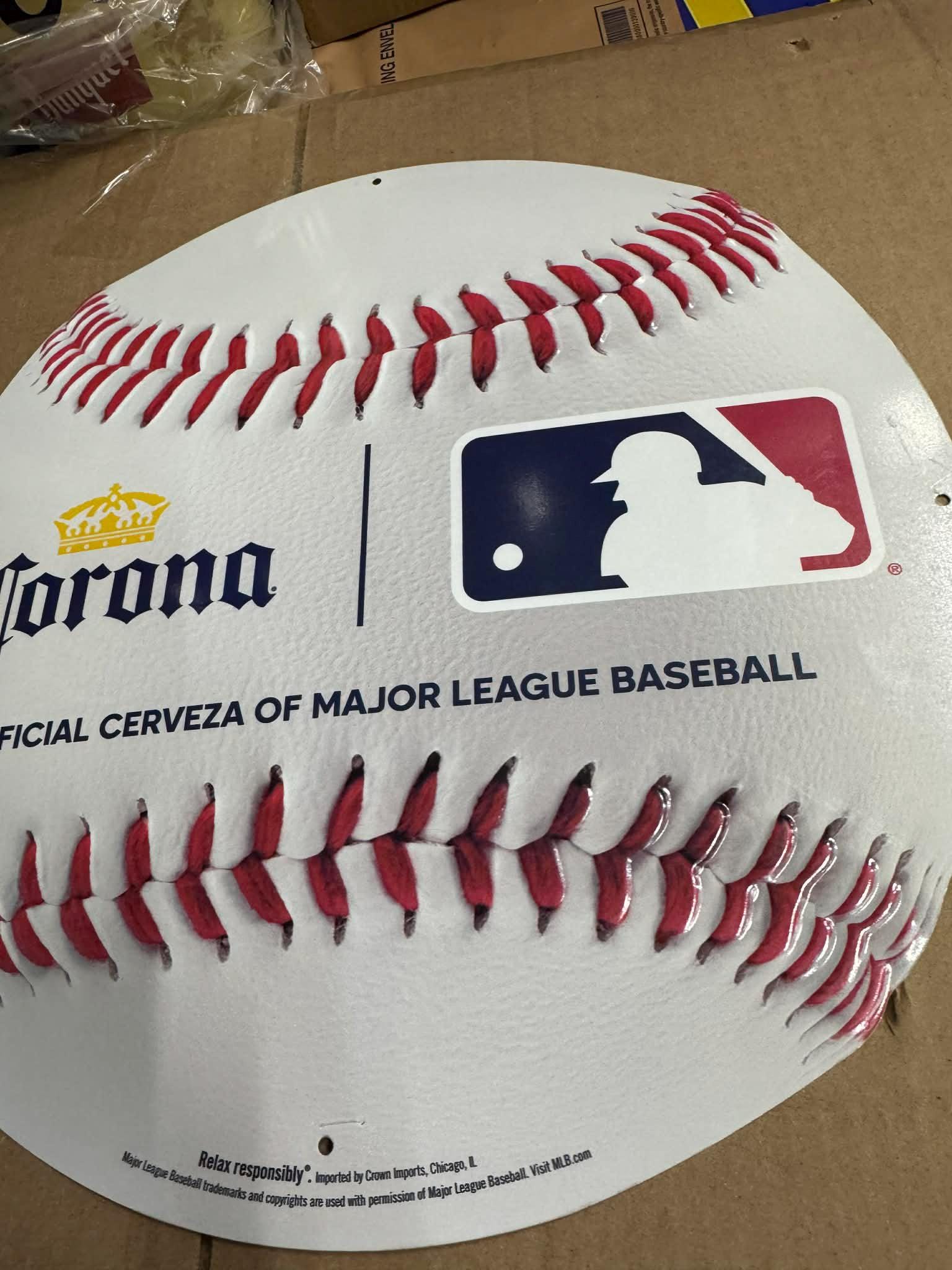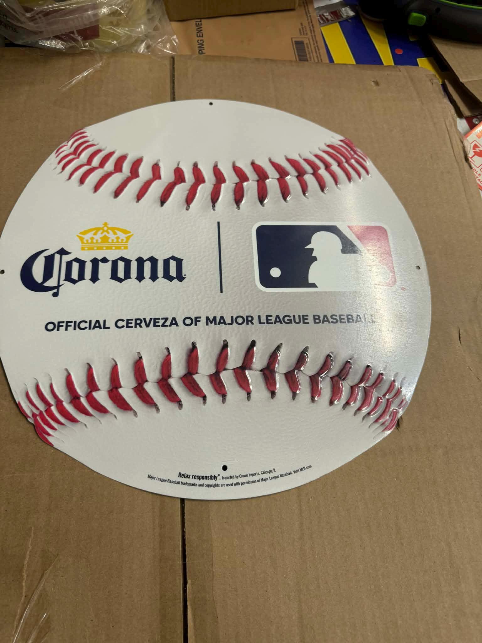 Official Corona Extra Major League Baseball metal sign designed in the shape of a baseball with amazing stitching detail featuring the Corona logo alongside the MLB (Major League Baseball) logo.