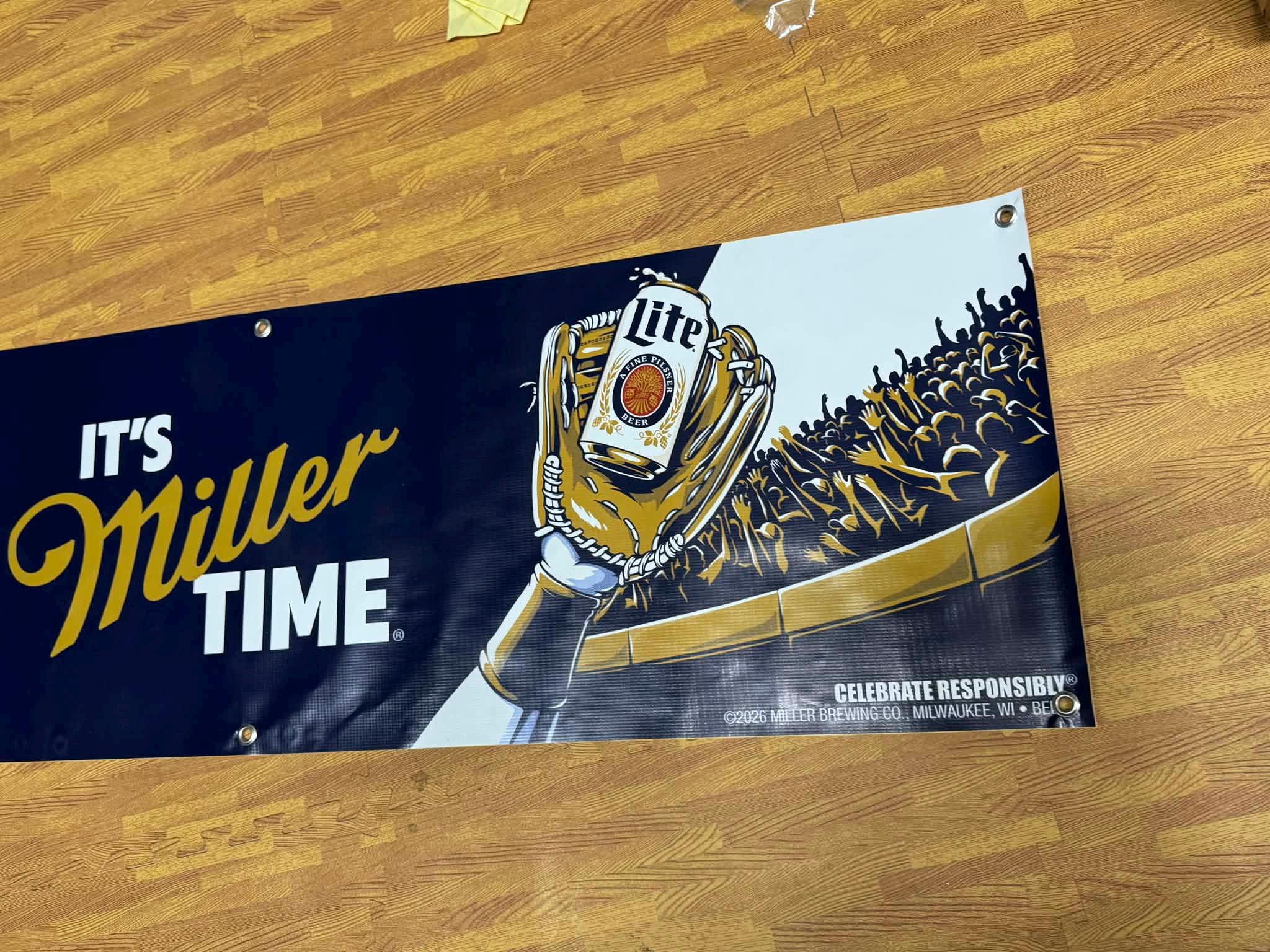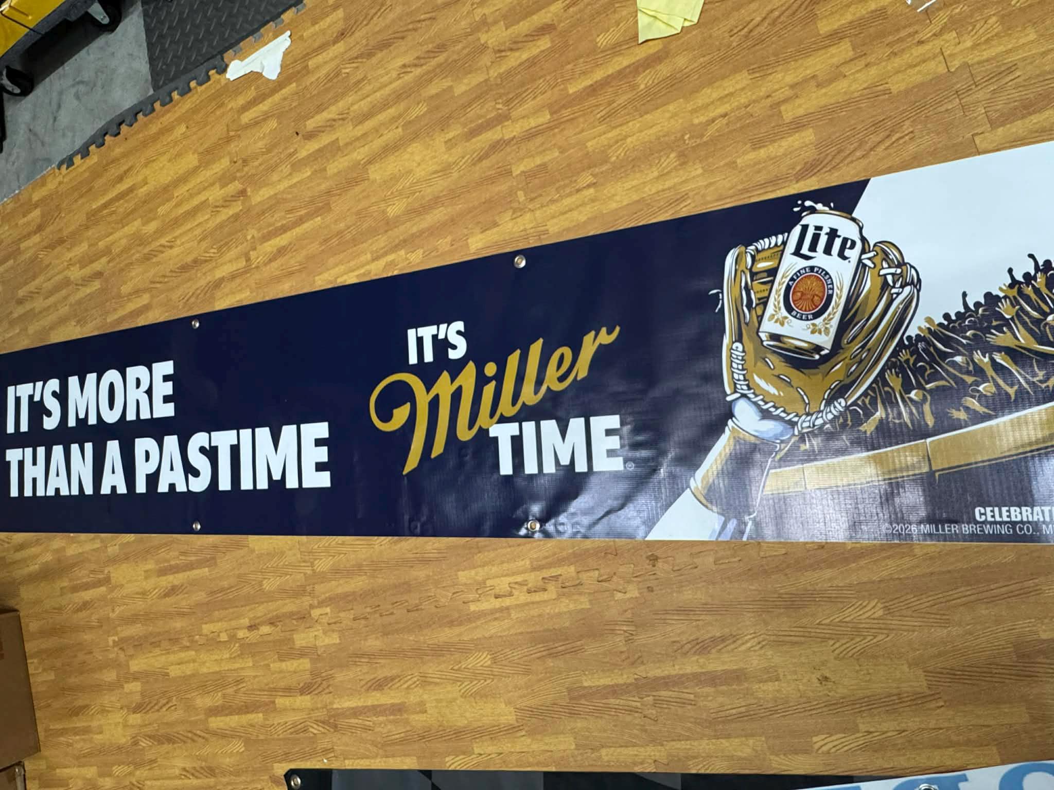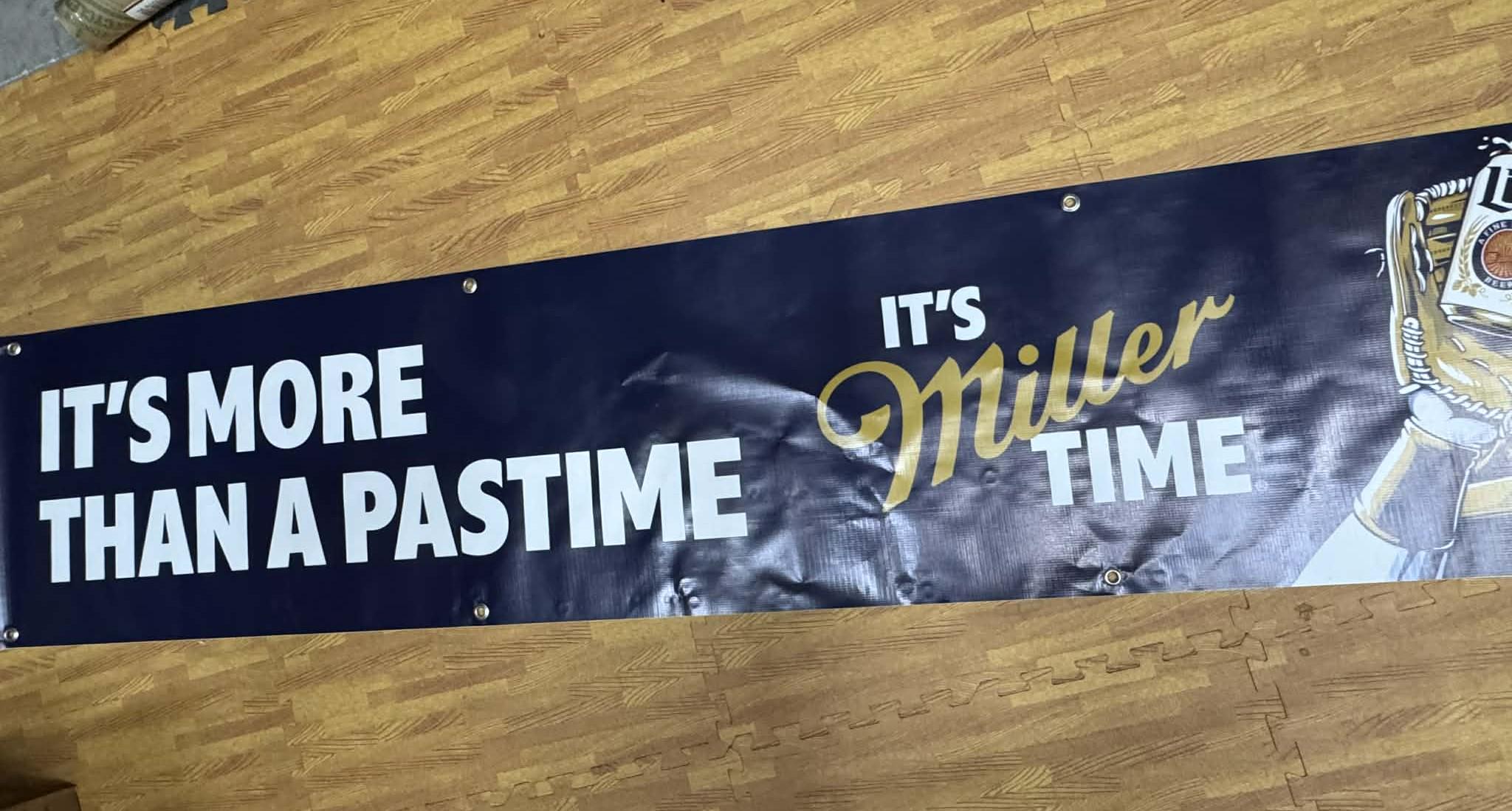 This extra long Miller Lite baseball banner is a statement piece built for true fans. Featuring a glove catching a beer can with a packed stadium backdrop, this banner blends baseball and beer culture perfectly.