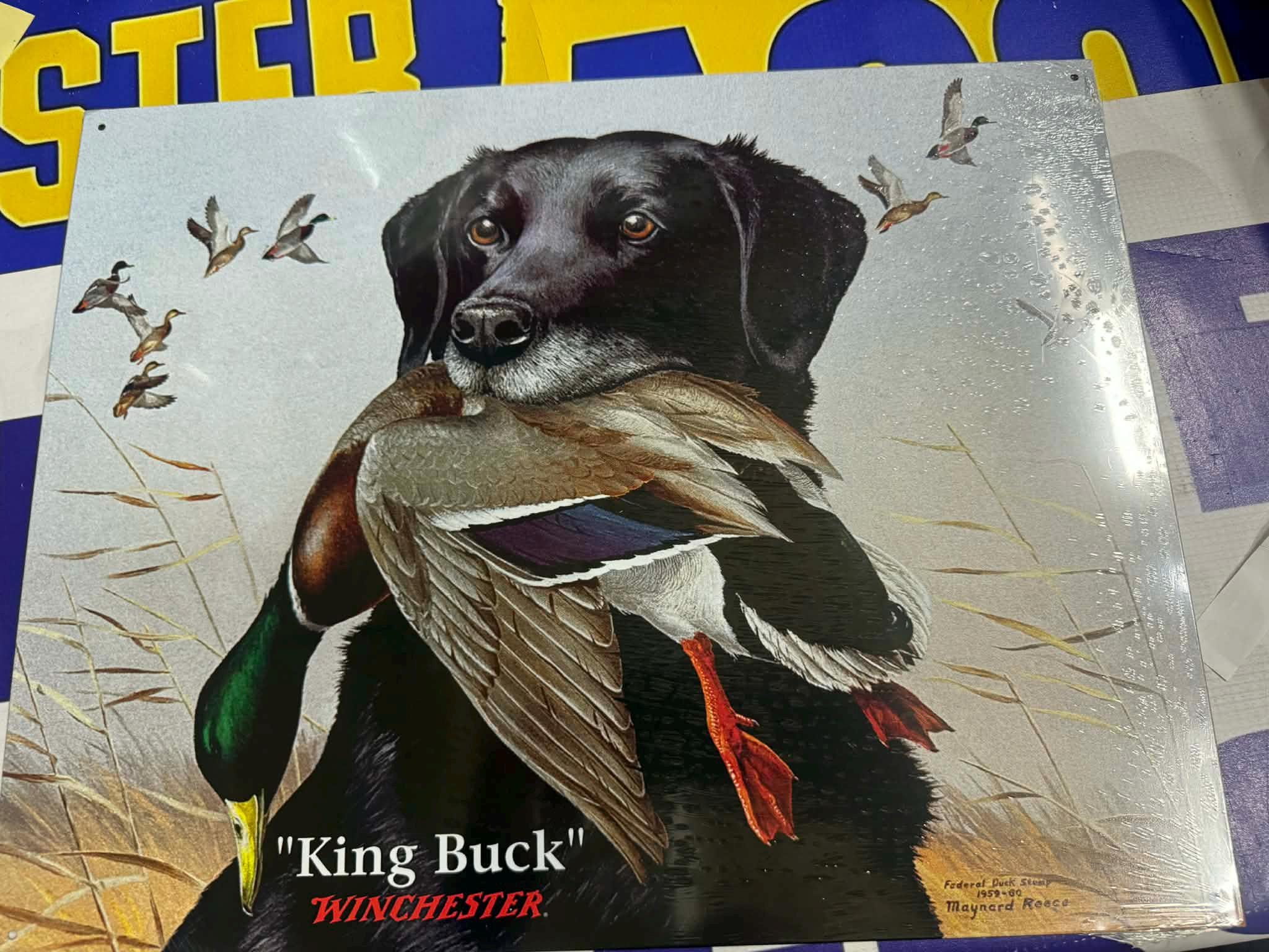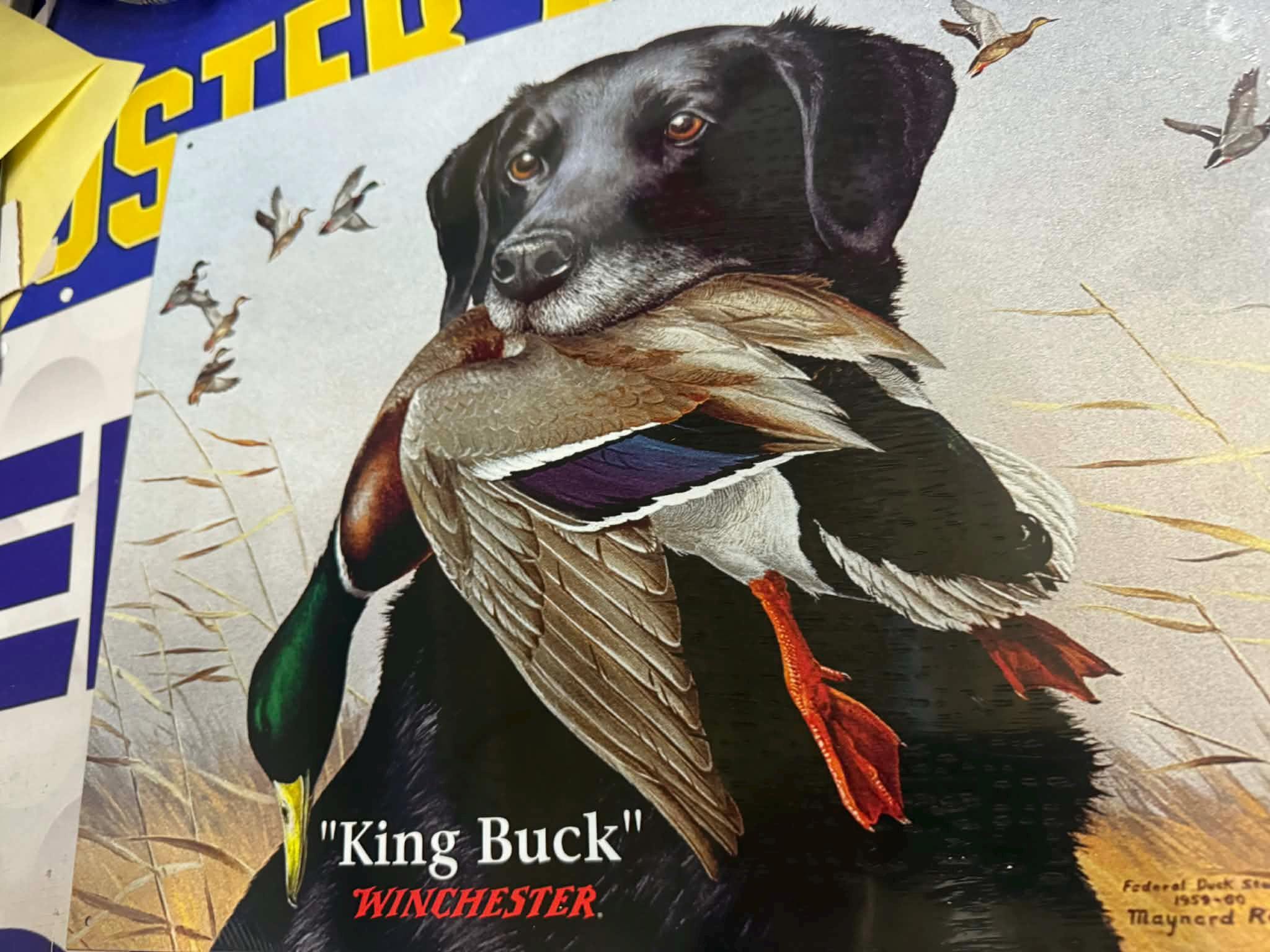 Beautiful Winchester “King Buck” tin sign featuring a black lab retriever holding a duck — a must-have for any serious hunter or outdoorsman.