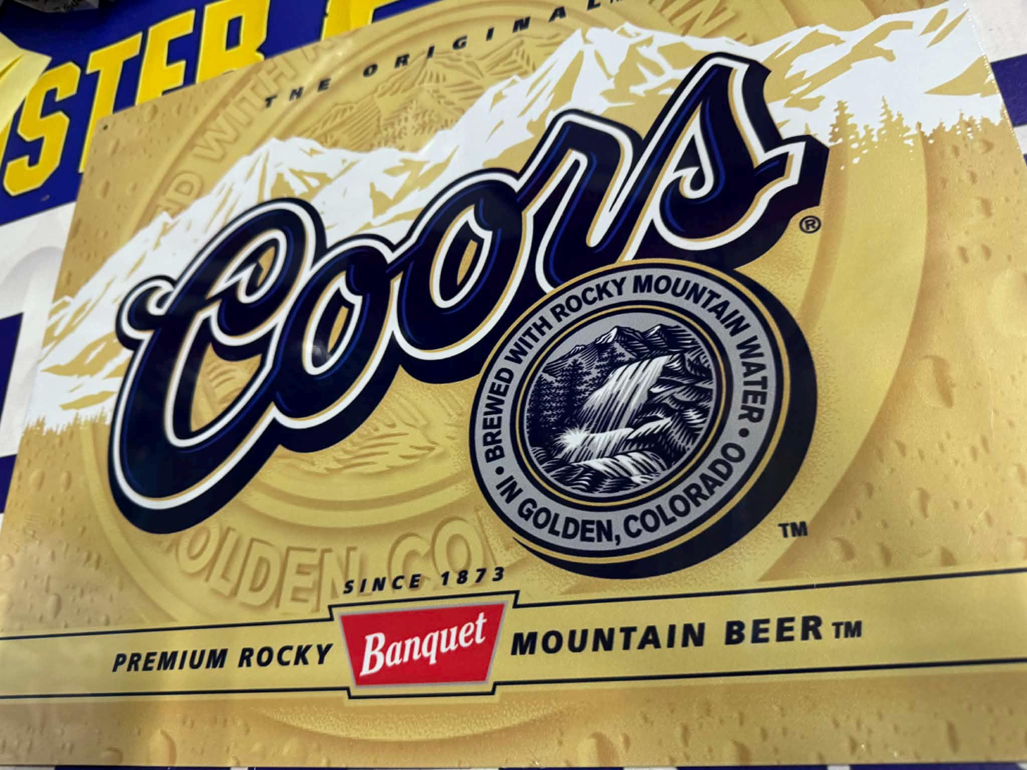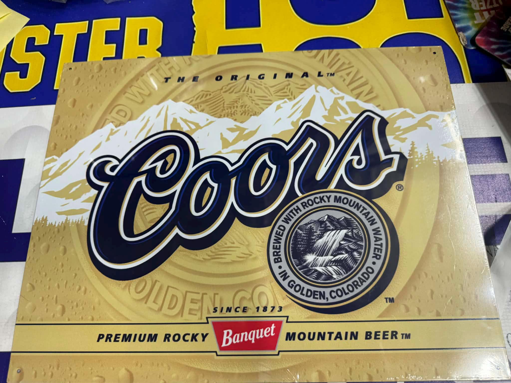 Classic Coors Banquet tin sign featuring the iconic golden label design and Rocky Mountain branding — a must-have piece for any beer lover or mancavedecor setup.