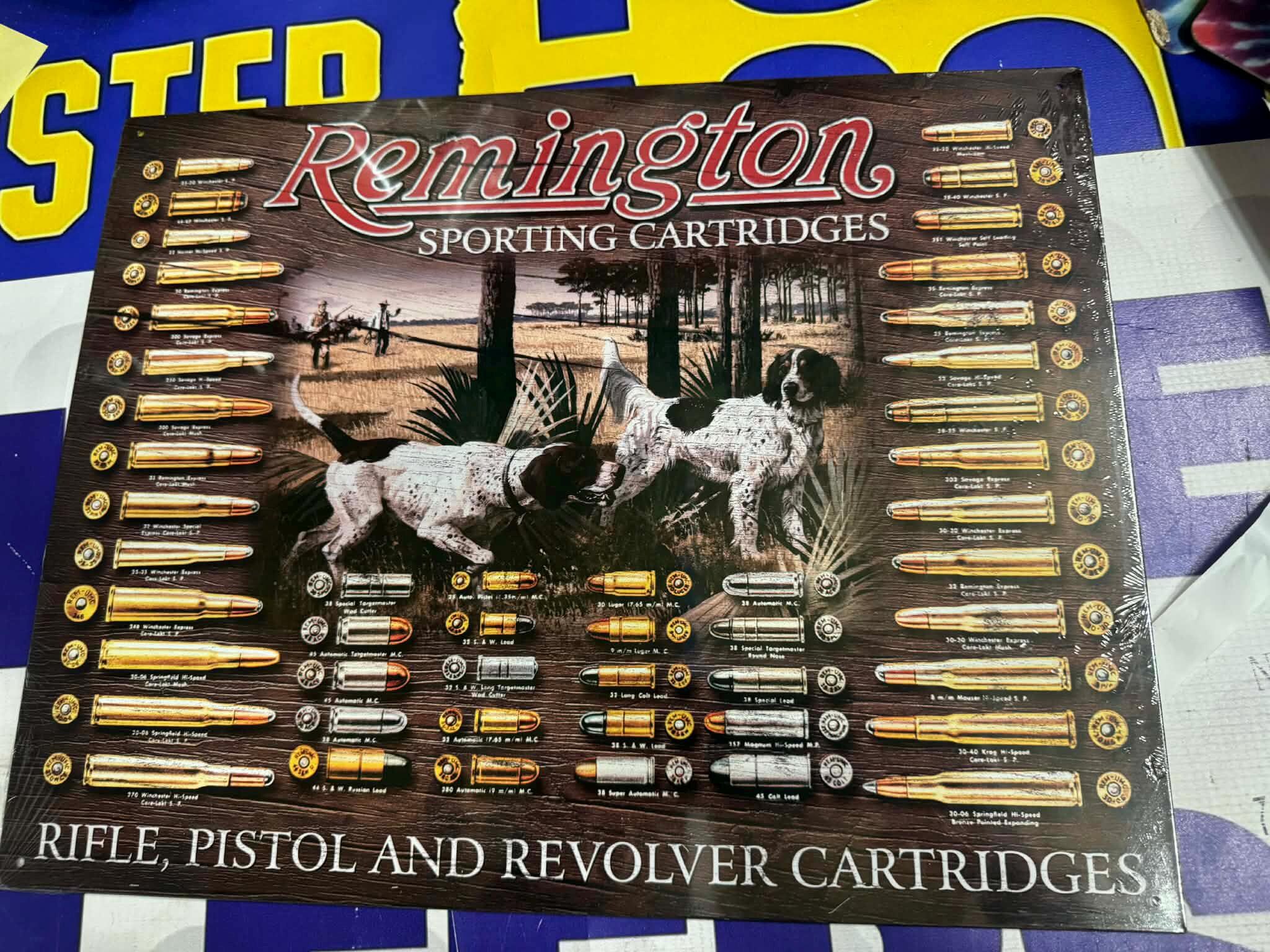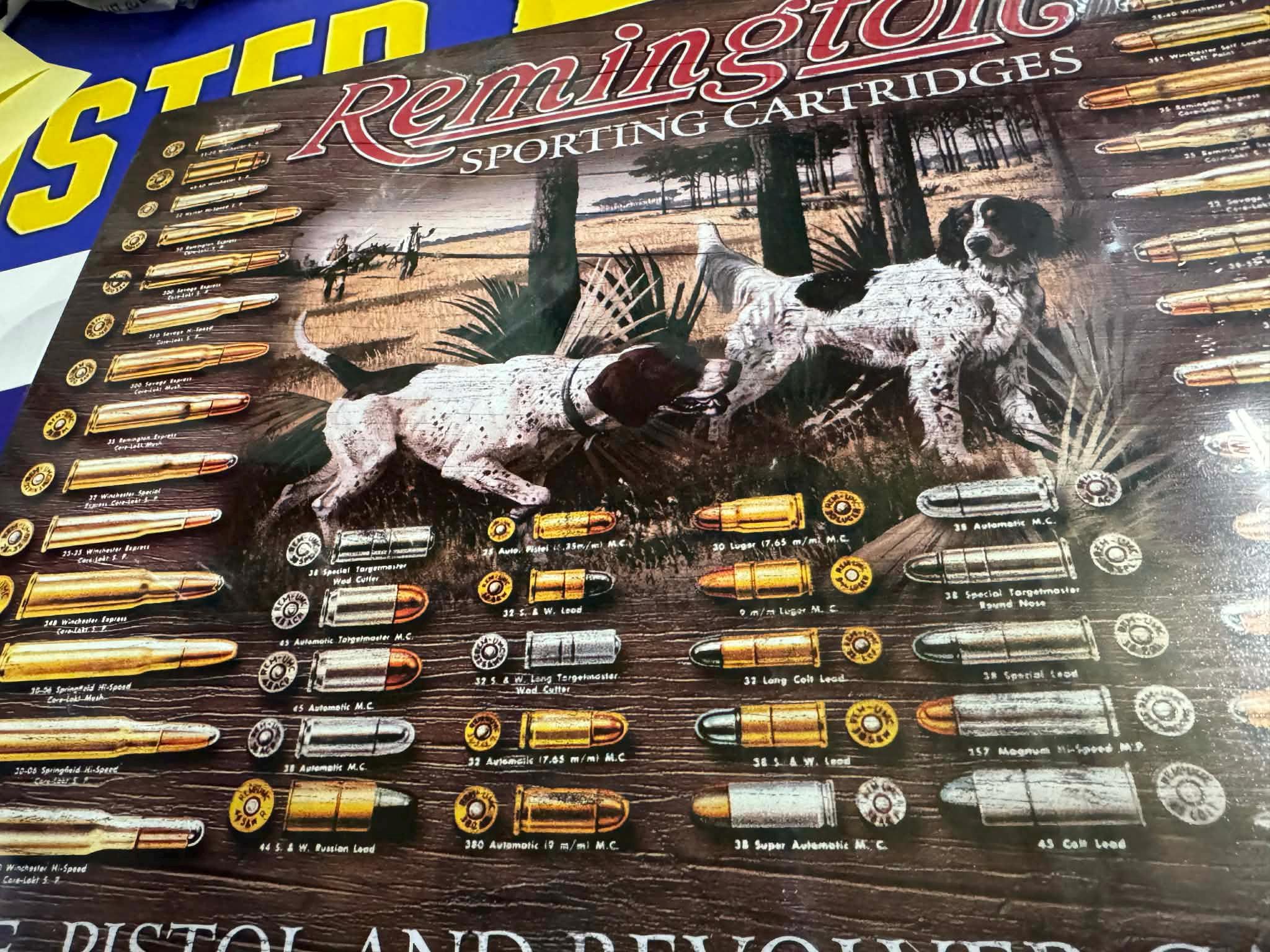 Classic Remington Sporting Cartridges tin sign featuring a detailed ammo chart with rifle, pistol, and revolver cartridges — paired with vintage hunting dog artwork.