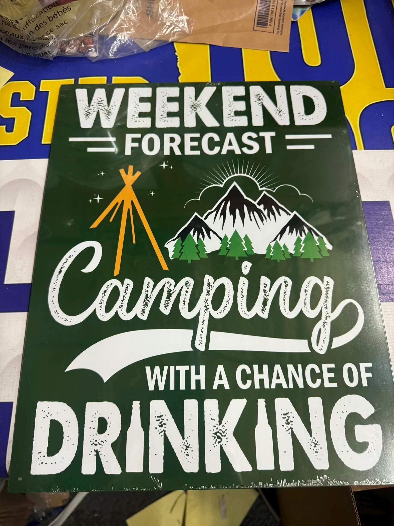Fun “Weekend Forecast: Camping with a Chance of Drinking” tin sign — the perfect mix of outdoor vibes and humor.