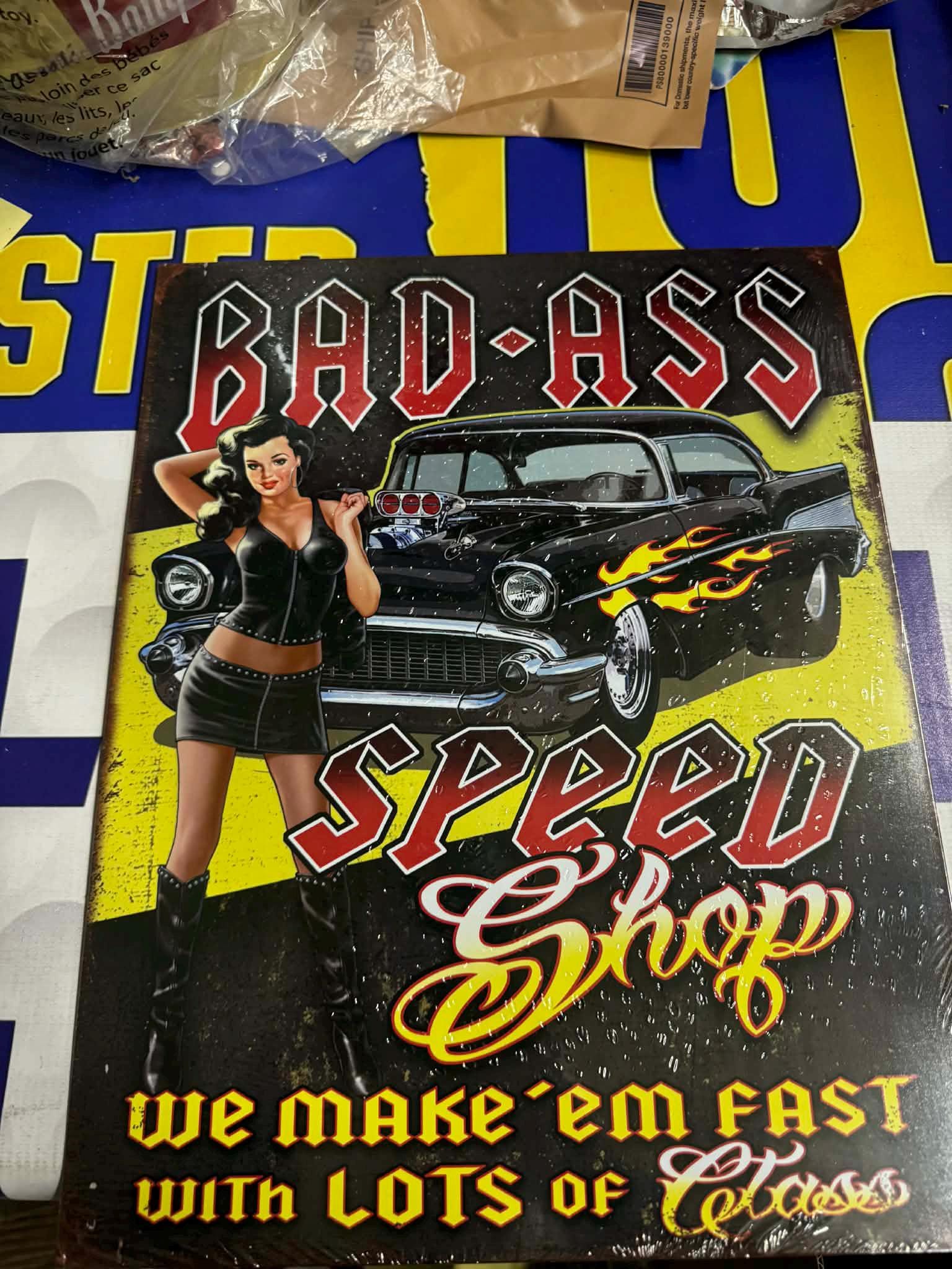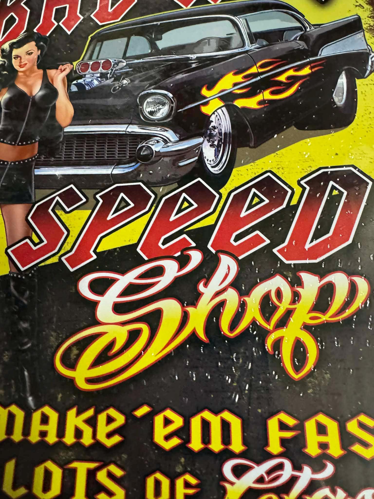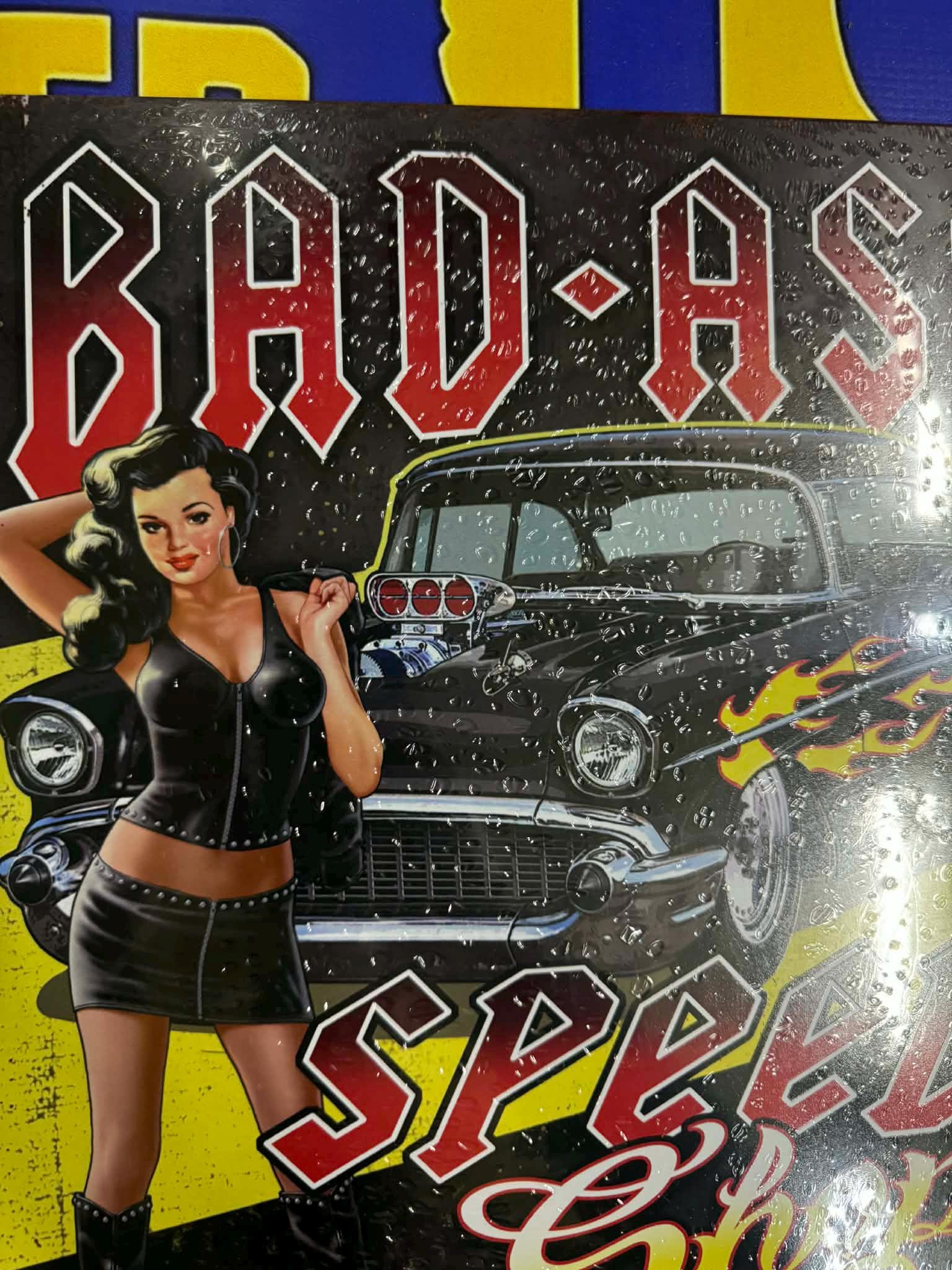 Bold “Bad Ass Speed Shop” tin sign featuring a classic hot rod and vintage pin-up girl design — perfect for any garage or mancave setup.