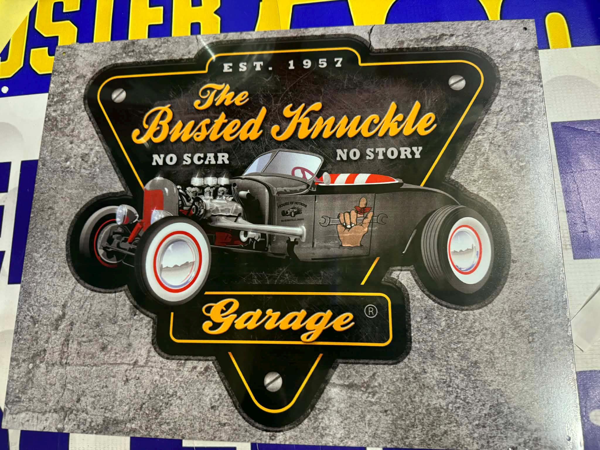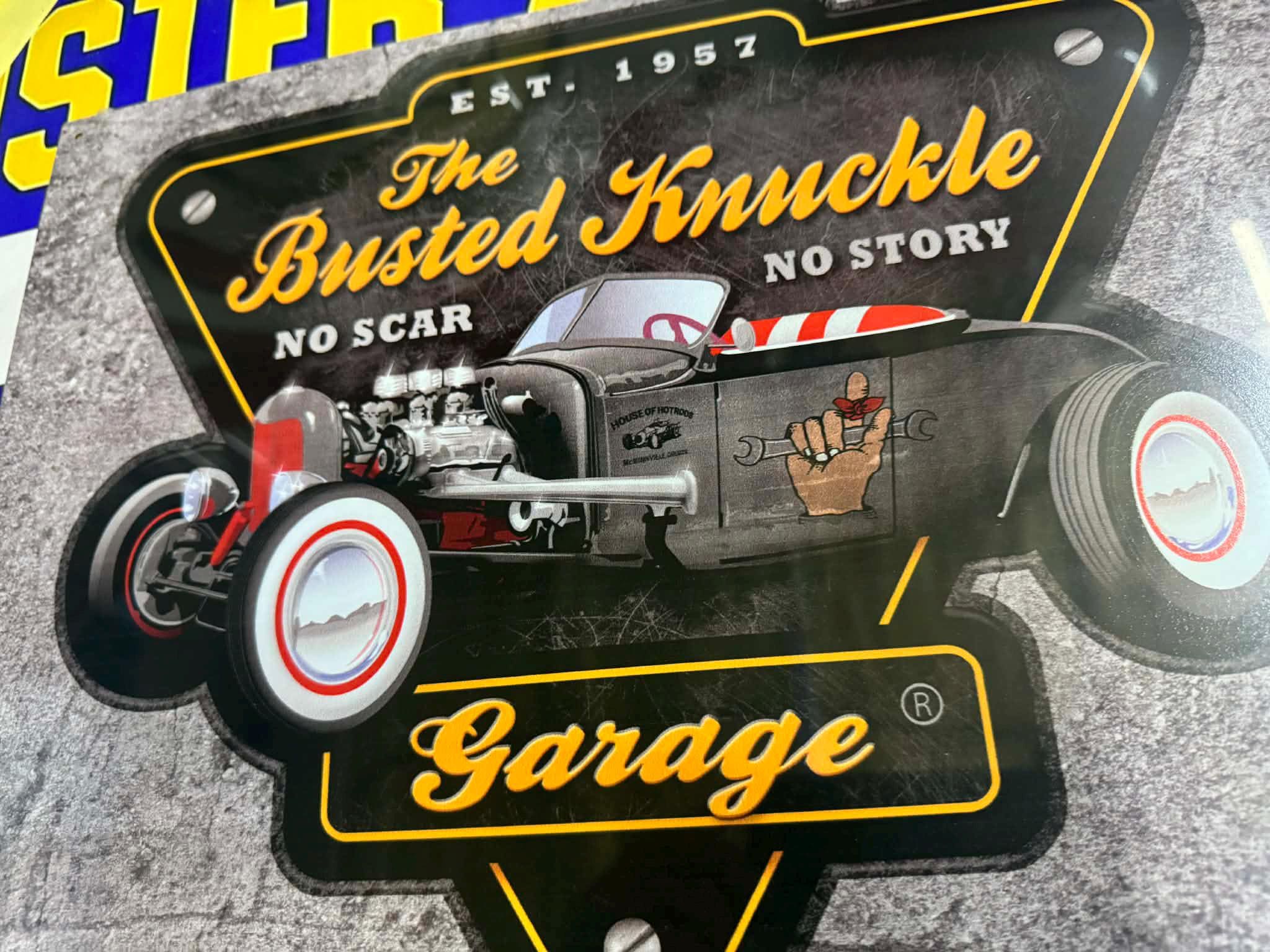 Classic “Busted Knuckle Garage” tin sign featuring a vintage hot rod design and bold shop-style graphics — perfect for any garage or mancave.