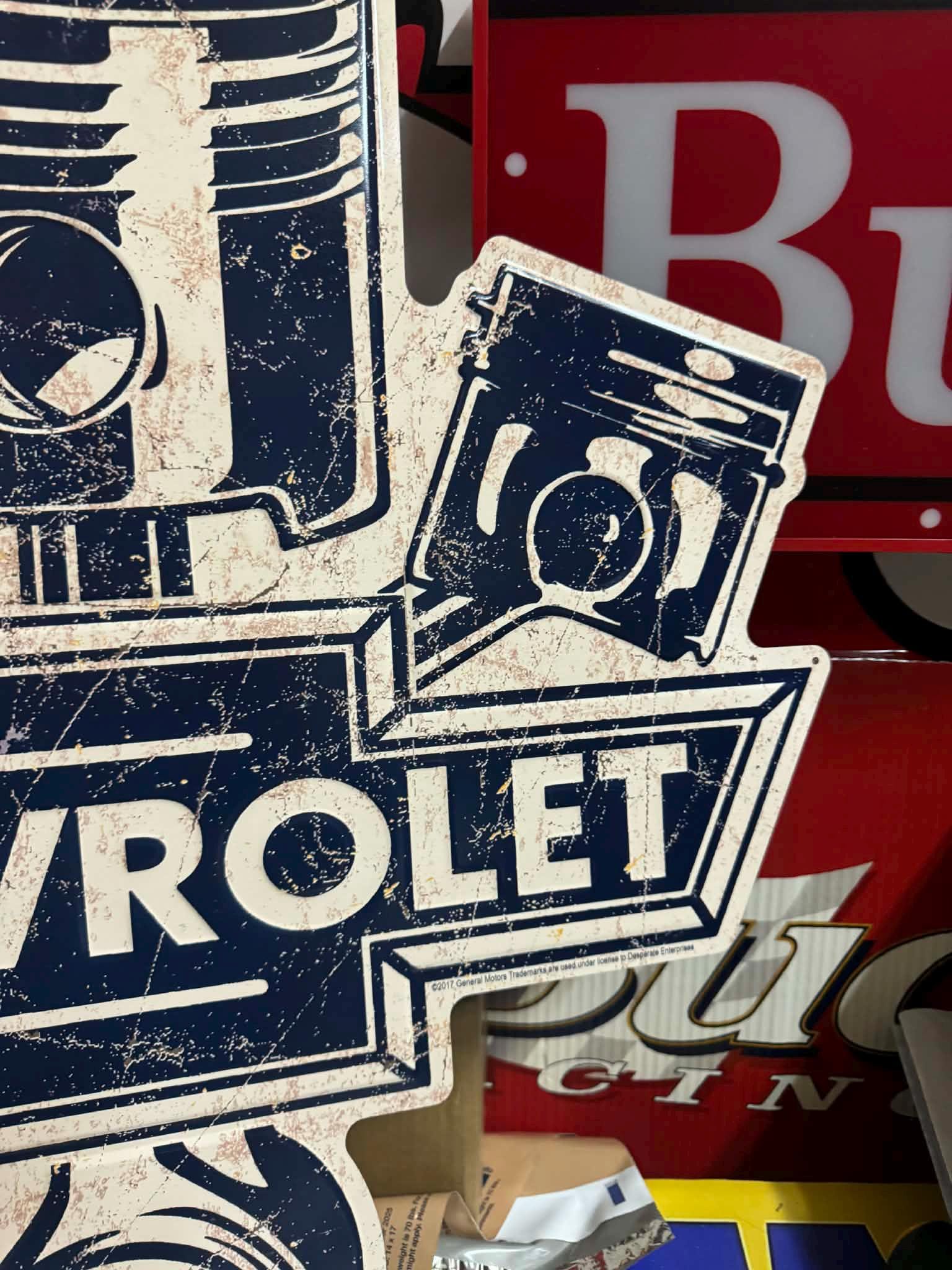 Featuring a distressed vintage finish and classic piston layout, this sign brings serious hot rod and performance shop vibes to any space.